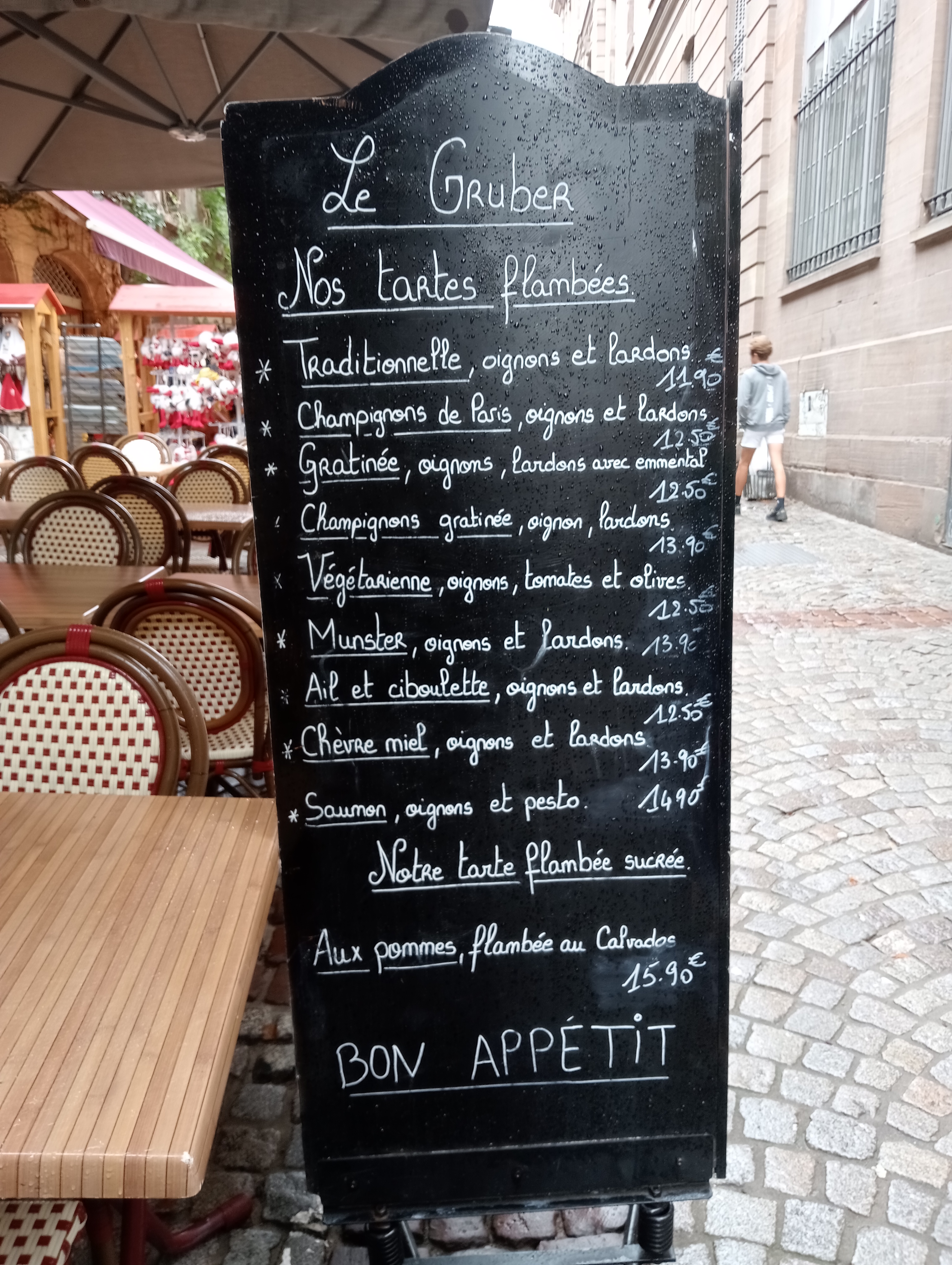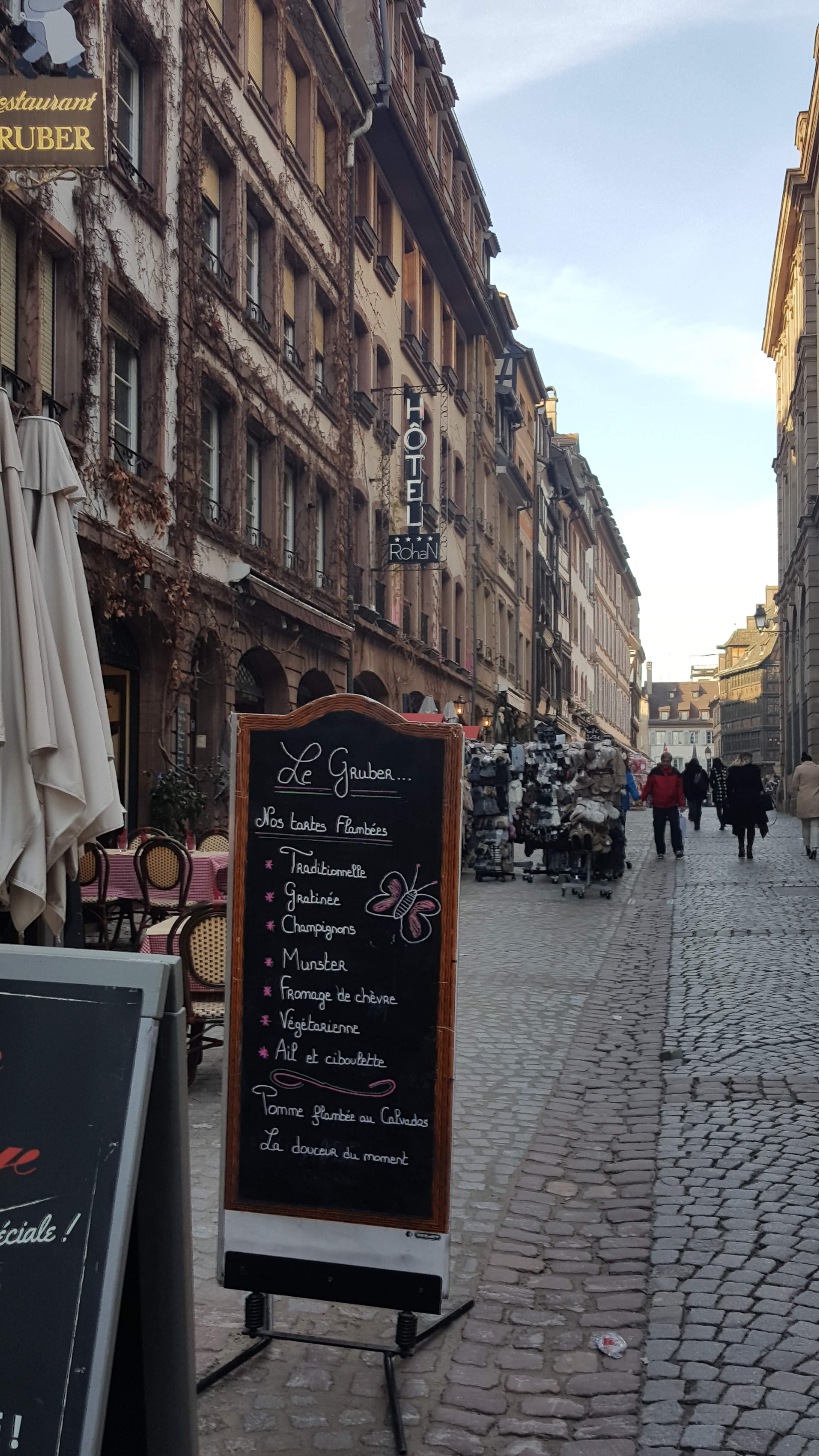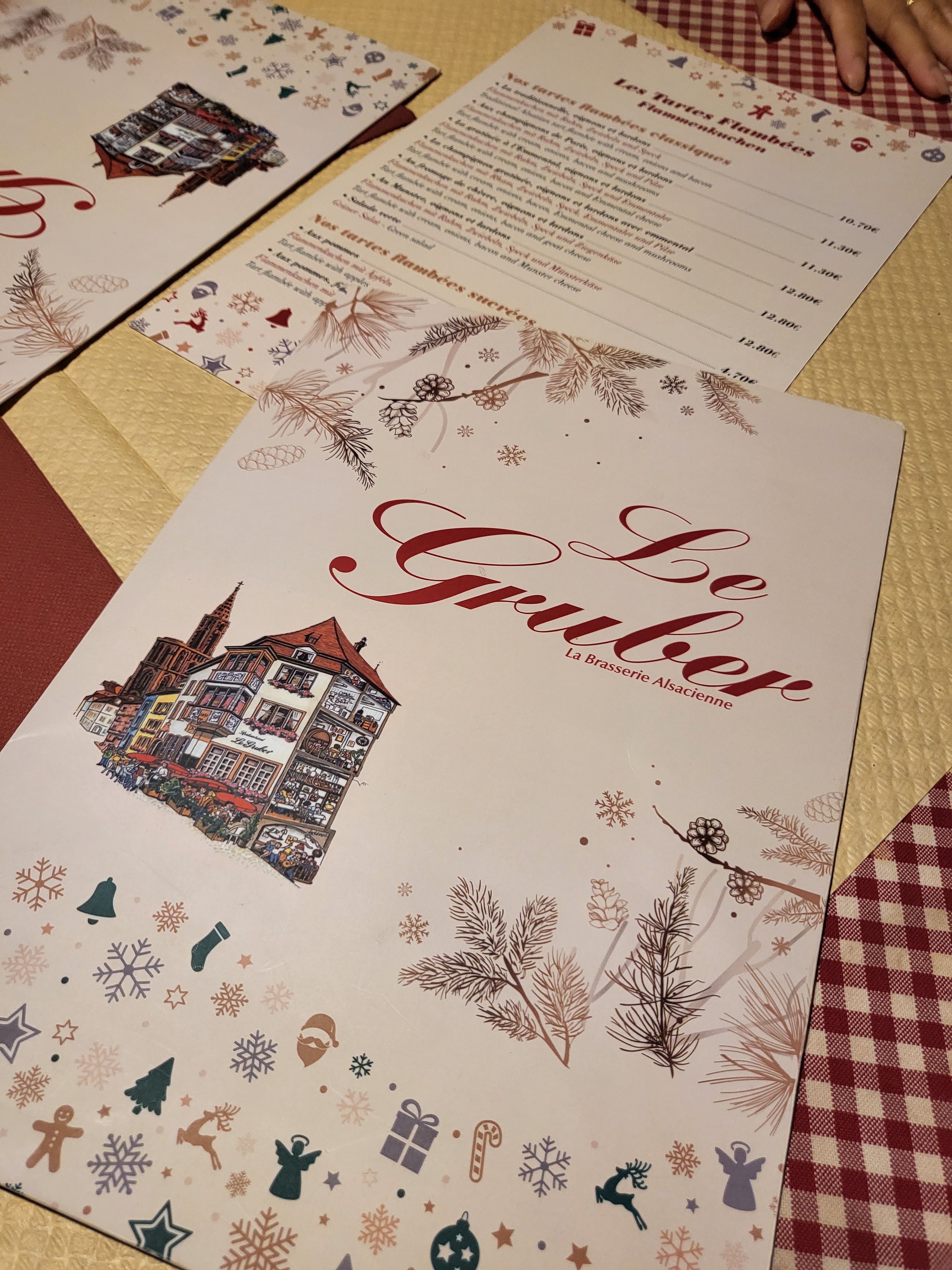 Le Gruber , place to be - blindé . situé dans le cœur historique de Strasbourg , à côté de la cathédrale propose une variété de plats traditionnels et régionaux dont les tartes flambées et sucrés. J ai testé la tarte flambée munster ! J’avoue douce et délicate . Le cadre est vraiement typique de la région, je vous laisse un peu de surprise. En bref, je reviendrais : c est bon, le personnel bienveillant et surtout mais aussi bon rapport qualité prix .