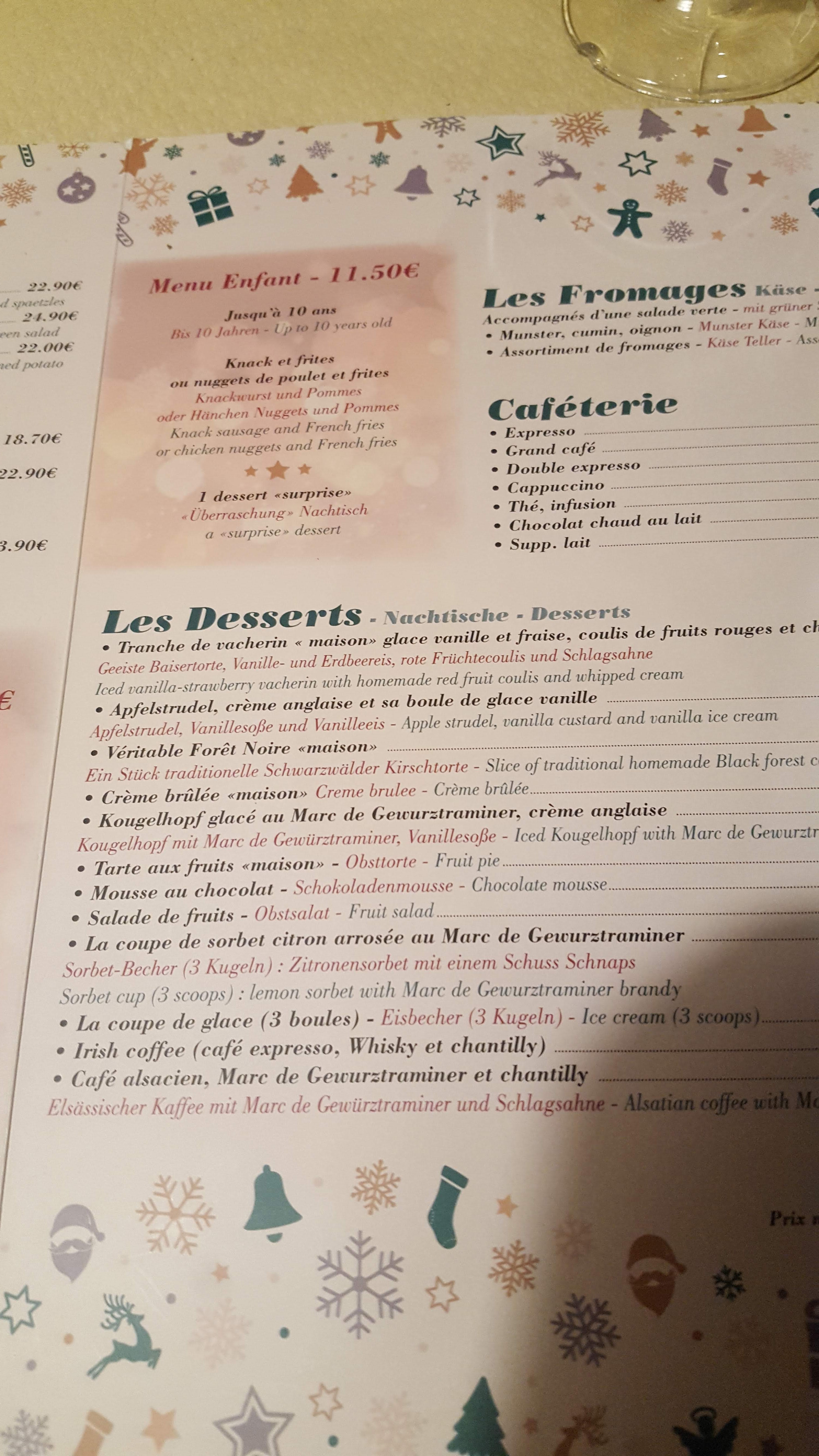 Jolie restaurant de l'extérieur. Mais niveau qualité des plats pour des menus de noel à 66 euros pas top ! Manquez des éléments à chaque plats qui été écrit sur le menu . La nourriture mauvaise qualité. Comme quoi faut pas ce fiait aux apparences. Apres ce n'est pas un restaurant qui m'a déçu qui va m'empêcher d'aimer l'Alsace .