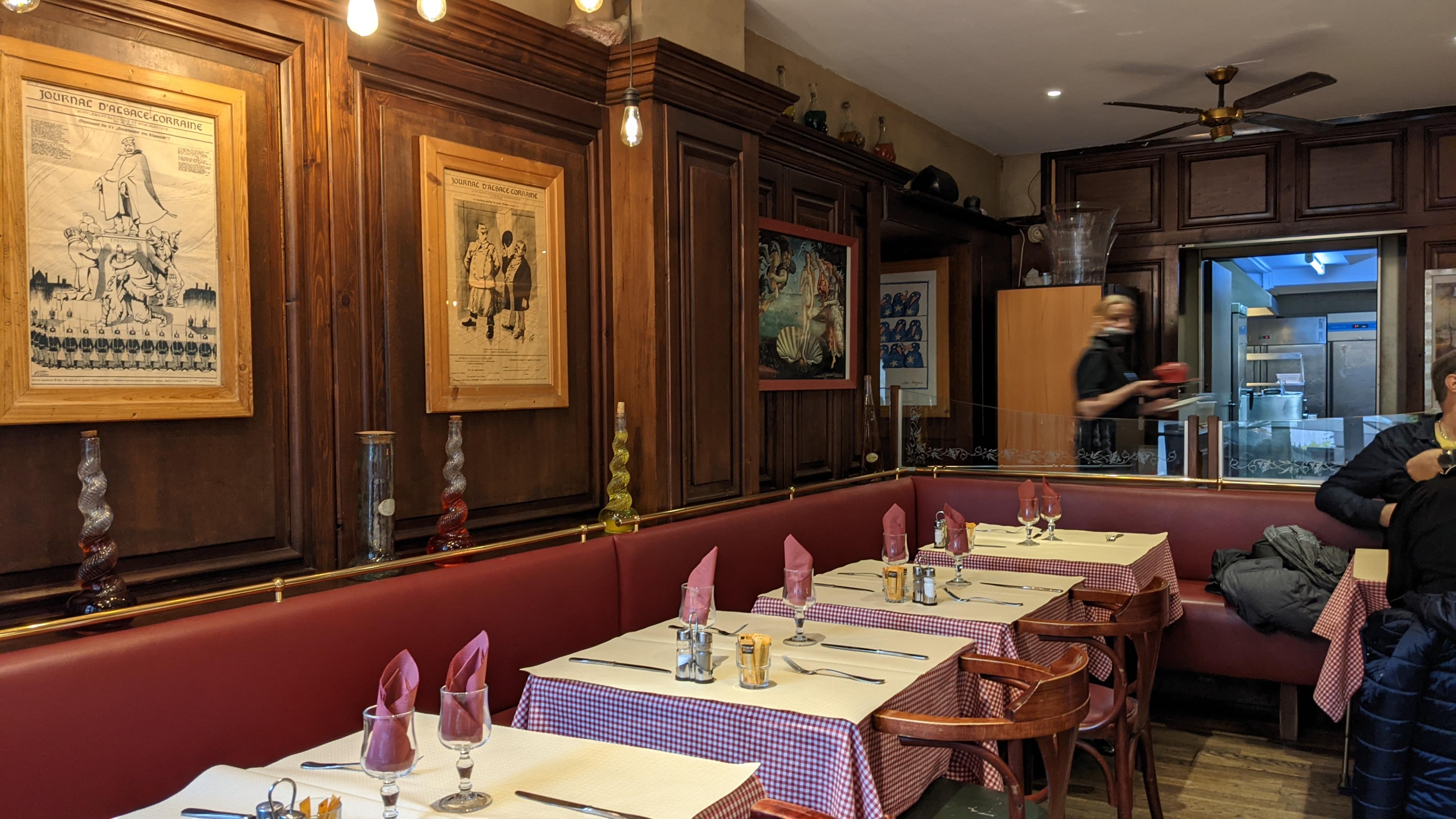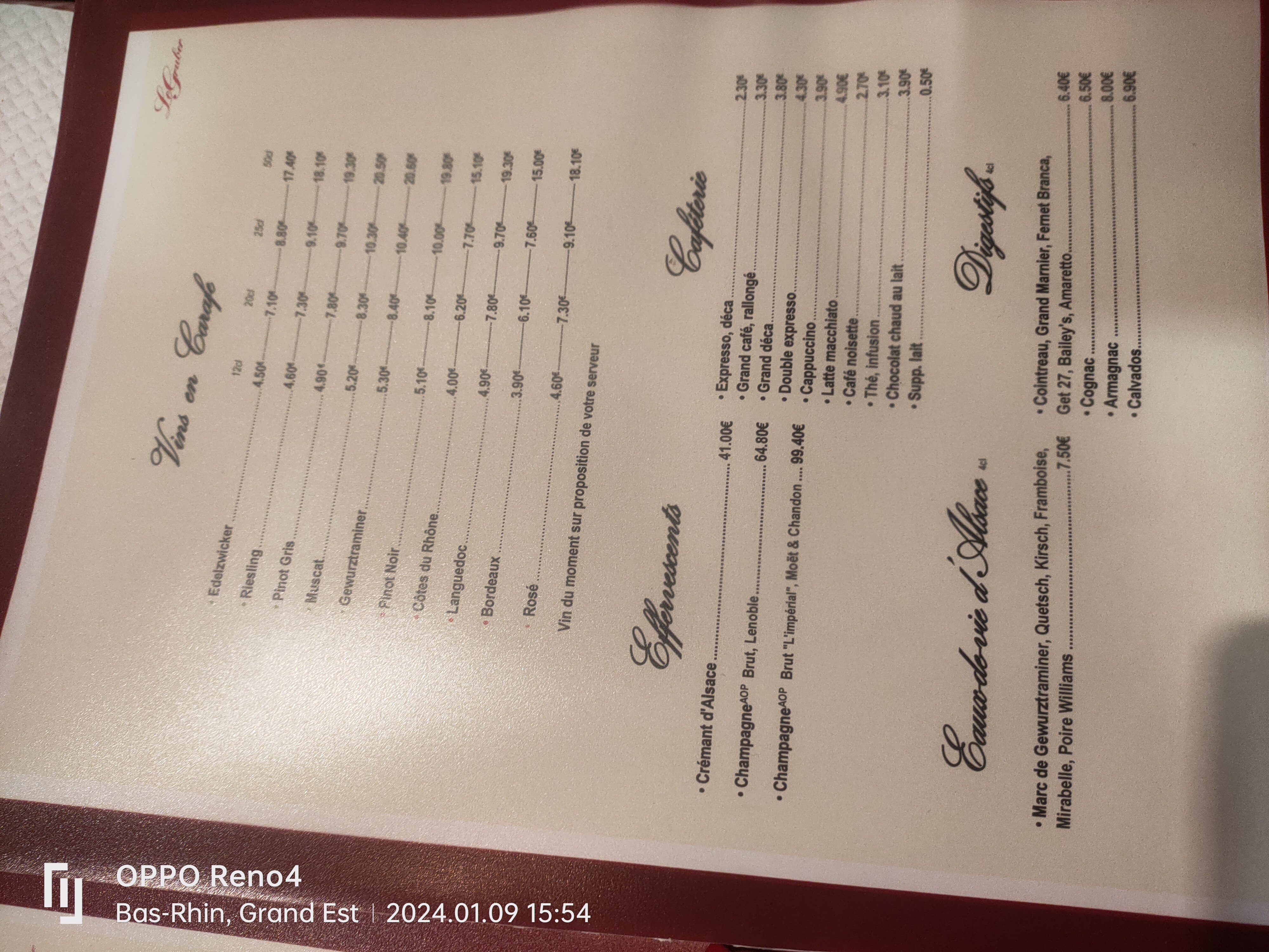 Restaurant sympa en vieix ville a Strasbourg. Nice diner for 31st of december, but.. Pinot Gris Wine that was served👎- the only one in the menu. Food served- les huitres, pas top/ le dessert- plus basique ce n'etait pas possible.( une.petite trancje de pain d'epices et une chantille assez artificielle 👎) Atmosphere generale agreabile mais les serveurs pas tres attentionnees (meme.si le.menu etait simple). Et l'odeur... pas d'aeration dans le restaurant.