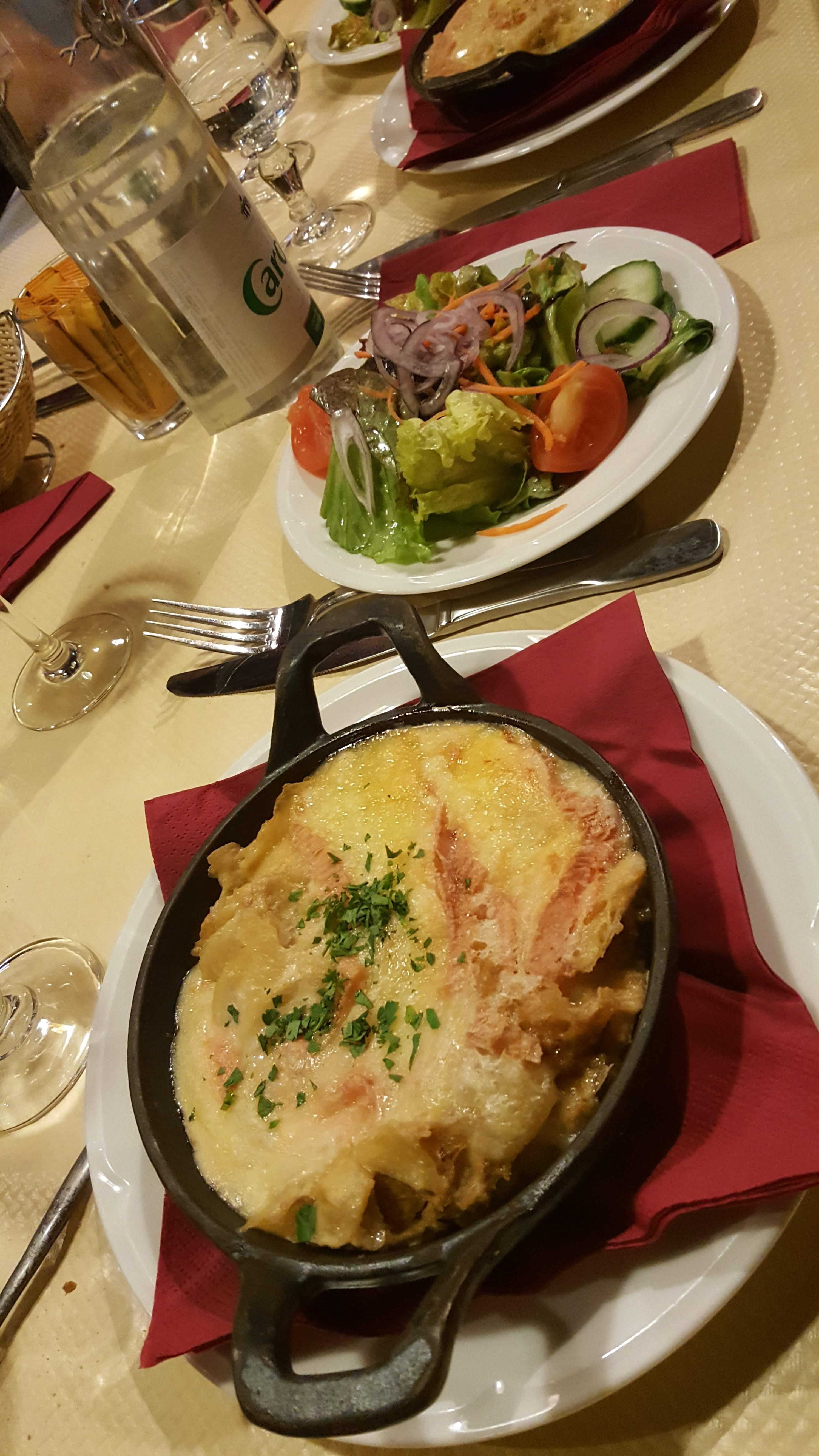 Decoration typique. serveurs (ses) agréable et souriants. Grand restaurant. Pris 2 gratins de pommes de terre au munster. Copieux. Servi avec 1 salade. On recommande