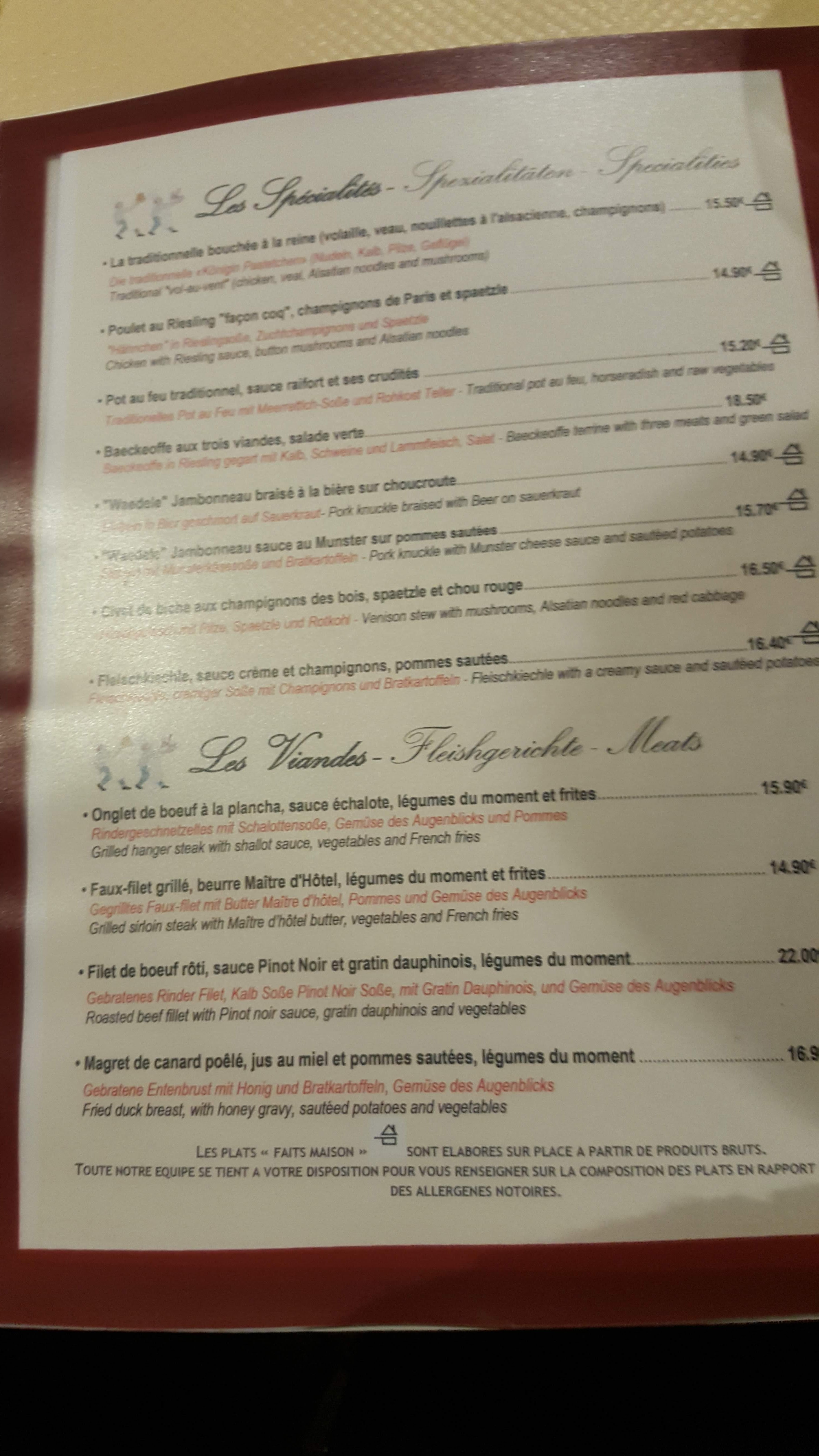 Auberge alsacienne typique offrant un large choix de spécialités culinaires dans un cadre accueillant et chaleureux avec une attraction musicale inattendue. (voir photo). La choucroute (choux) est délicieuse servie avec 5 charcuteries ou 3 poissons (au choix). La forêt noire commandée en dessert est généreuse...