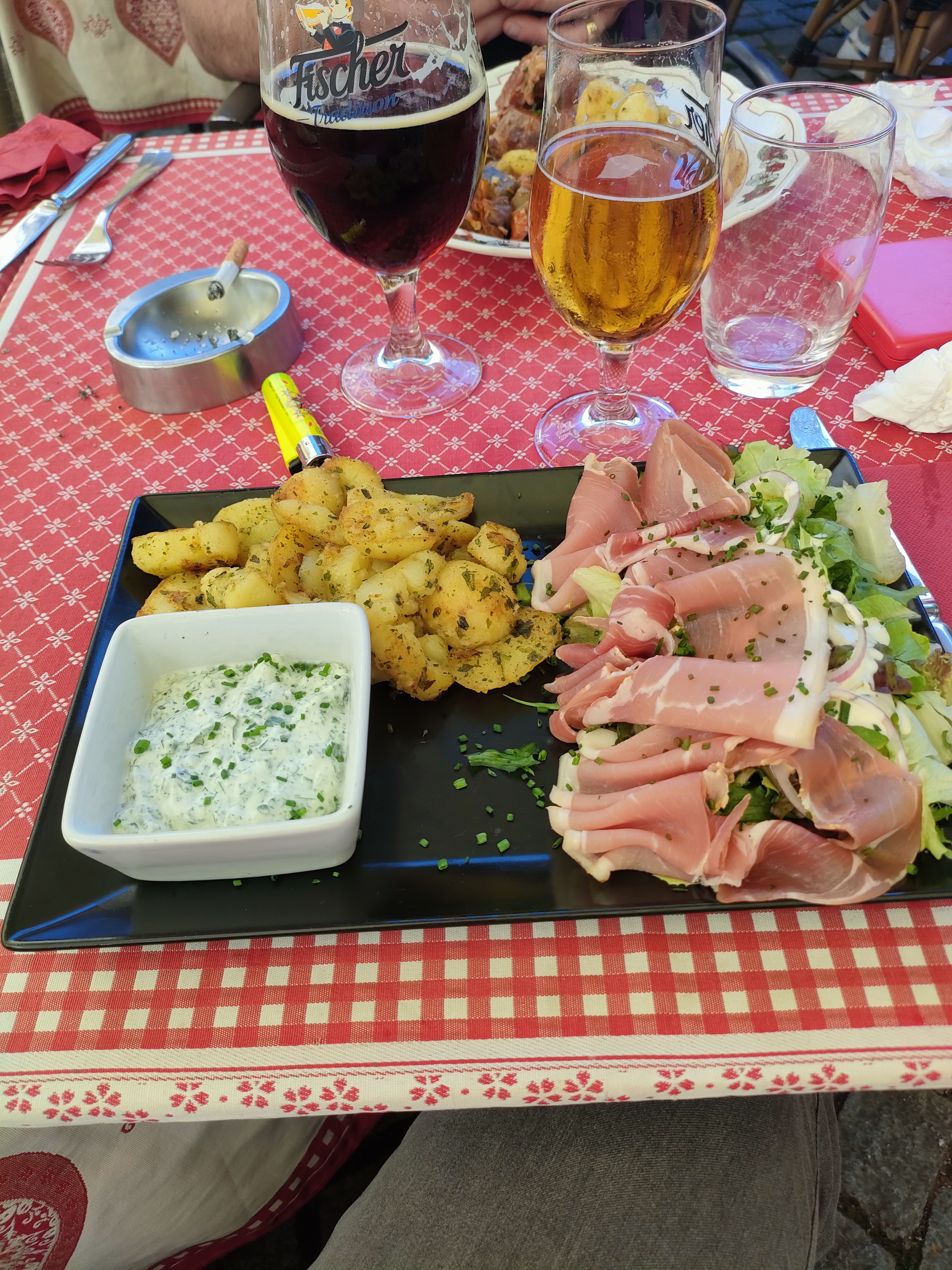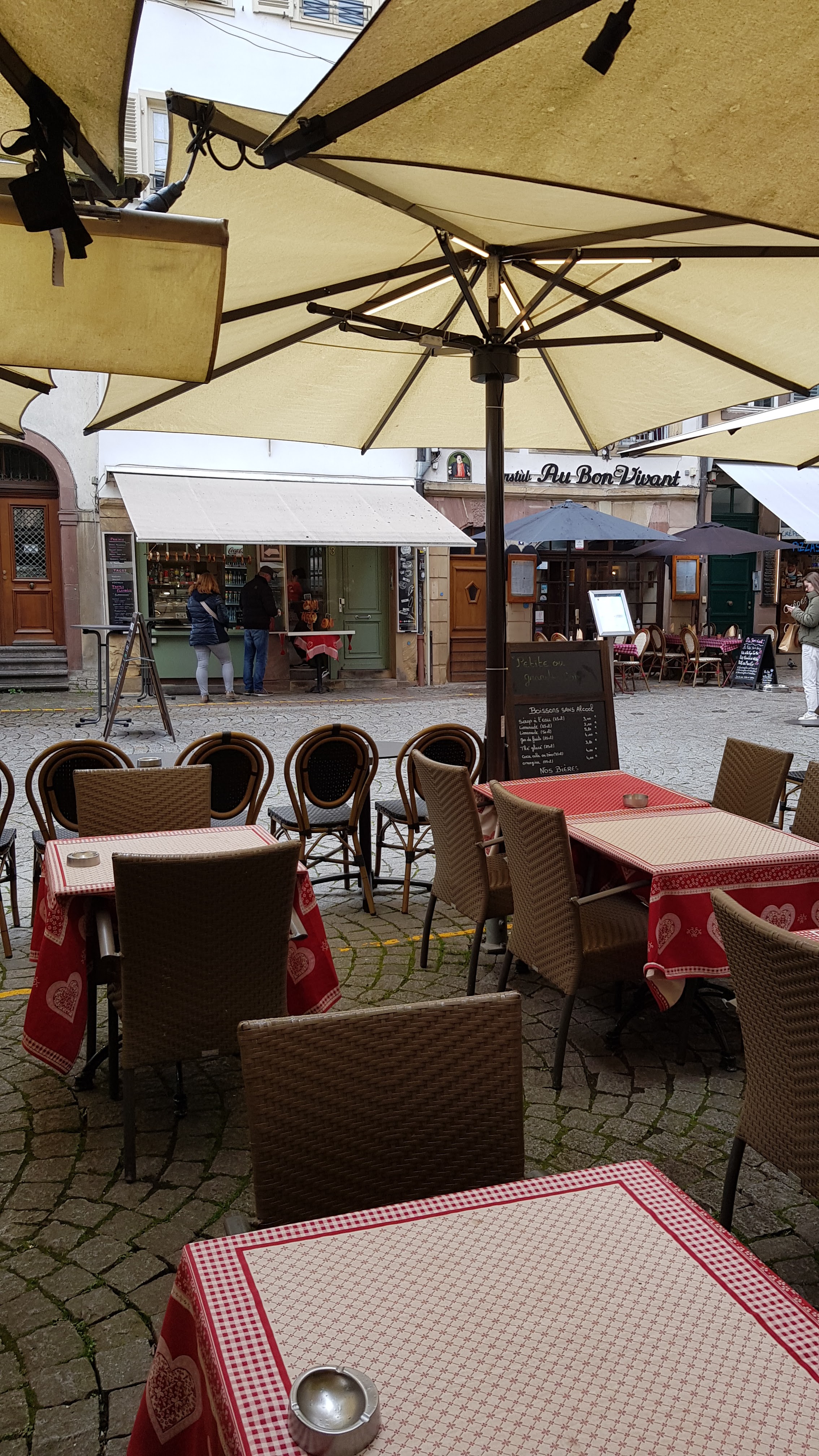 Restaurant fort sympathique situé dans une ruelle typique. J'ai osé à 28° le jarret de porc gratiné au munster et ses petites pommes de terres rôties, excellent !
