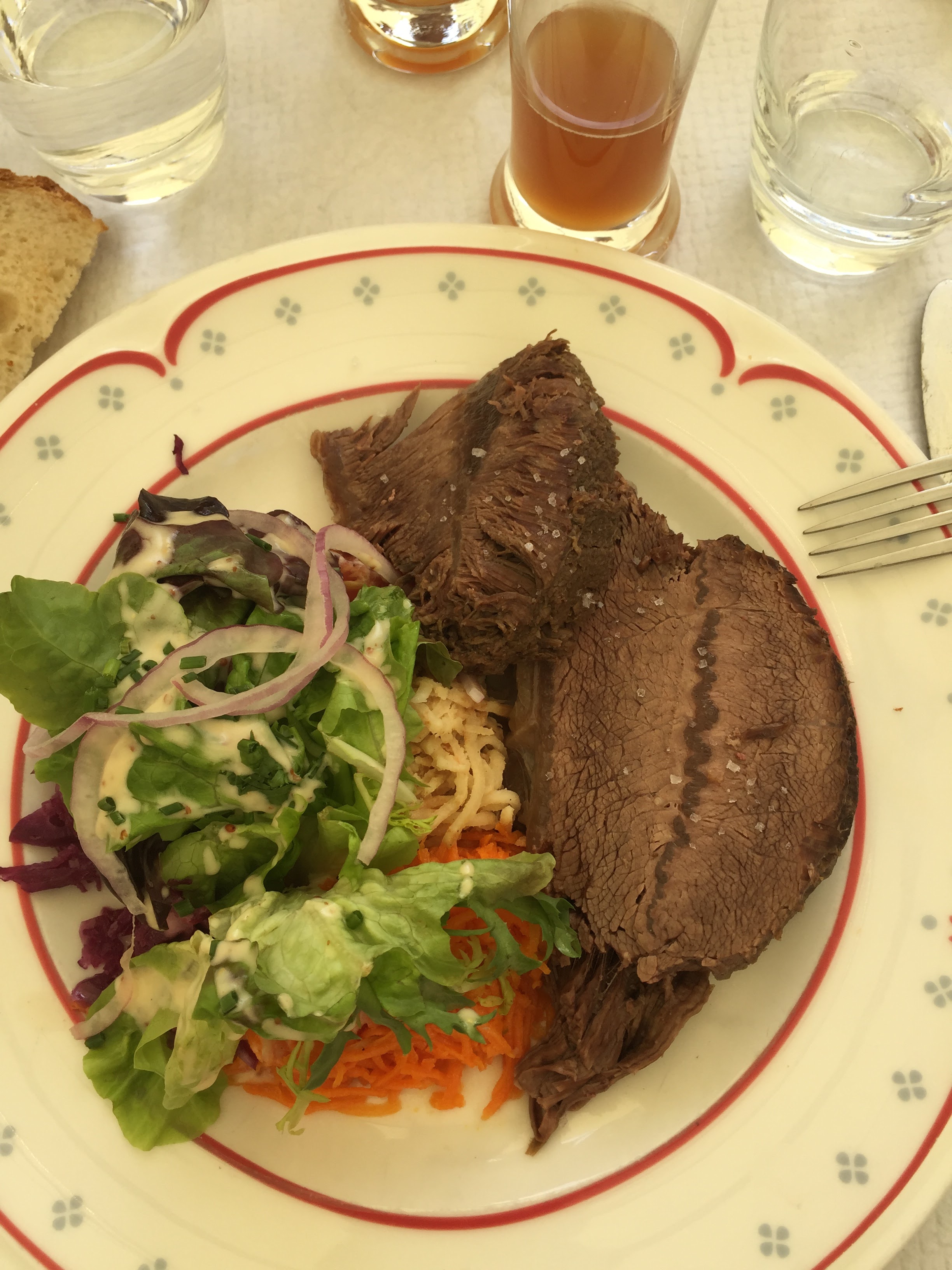 Un repas mémorable! Je voulais tester une choucroute traditionnelle. Et finalement j'ai lorgné sur le plat des voisins : jarret de porc au munster et pomme de terre au four. C'était absolument délicieux! Fondant, goûtu! Les pommes de terre étaient aussi excellentes! Le jarret est servi copieusement. Nous n'avions plus faim pour un dessert... qu'on aurait tant aimé gouté. Le prix est tout à fait correct. J'ai juste envie d'y retourner encore!
