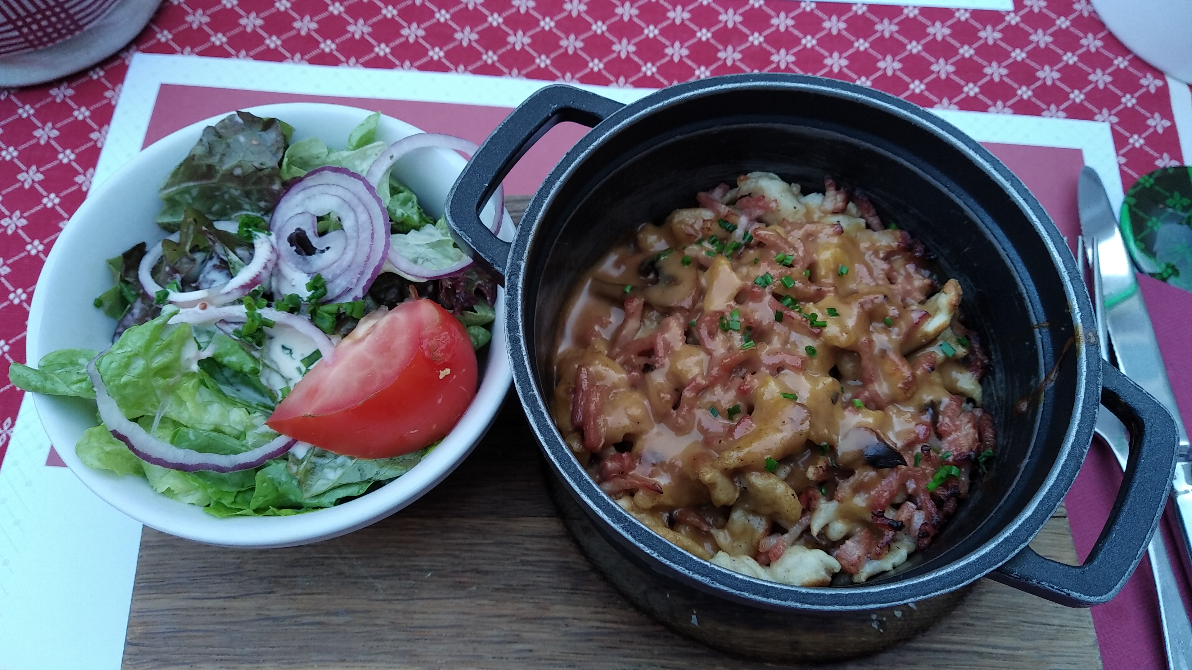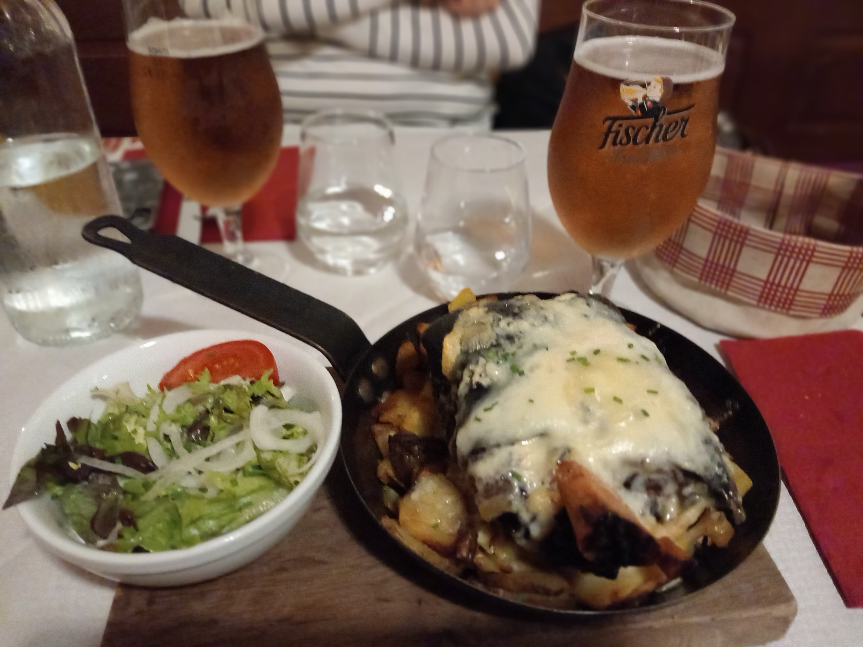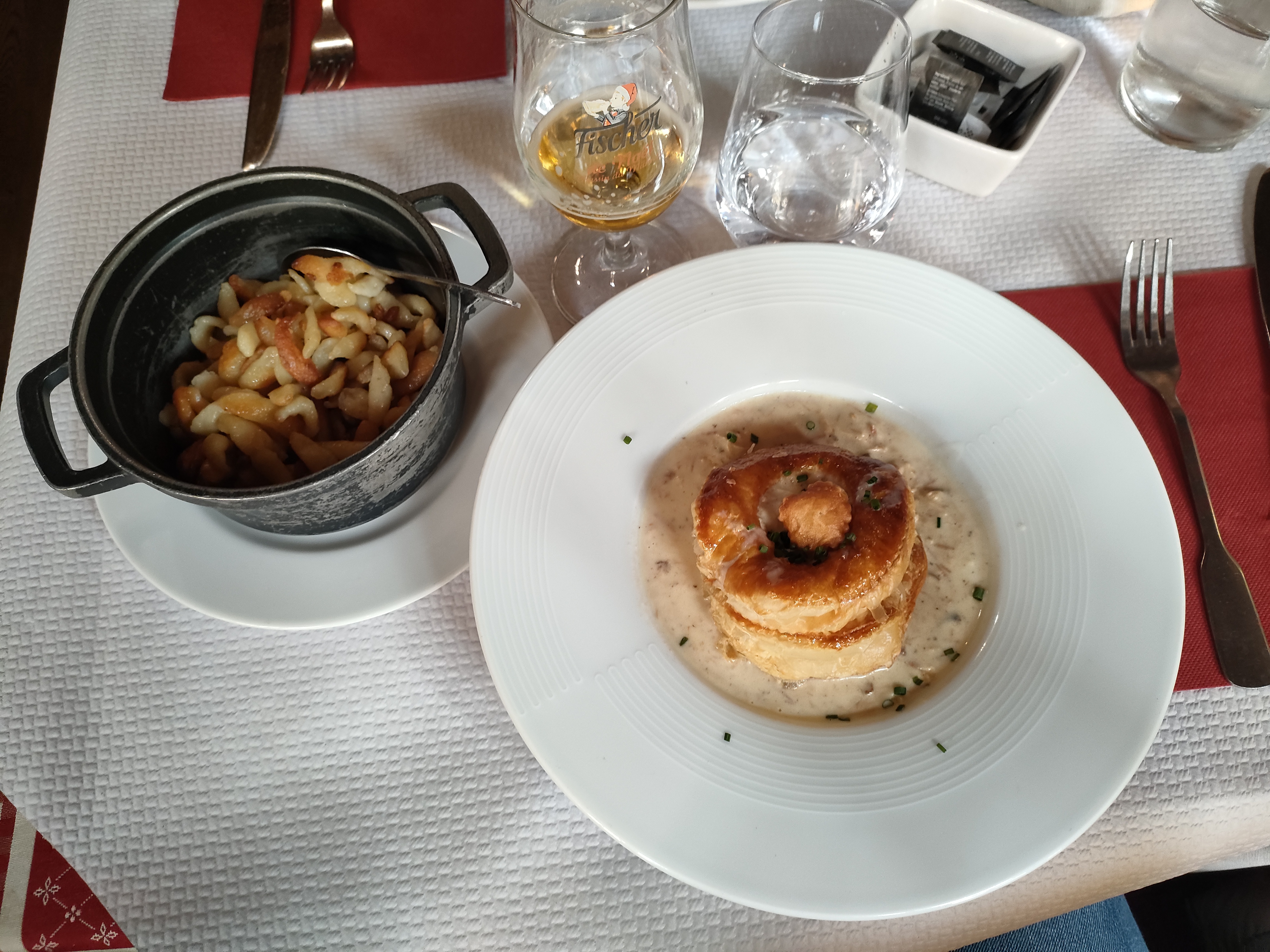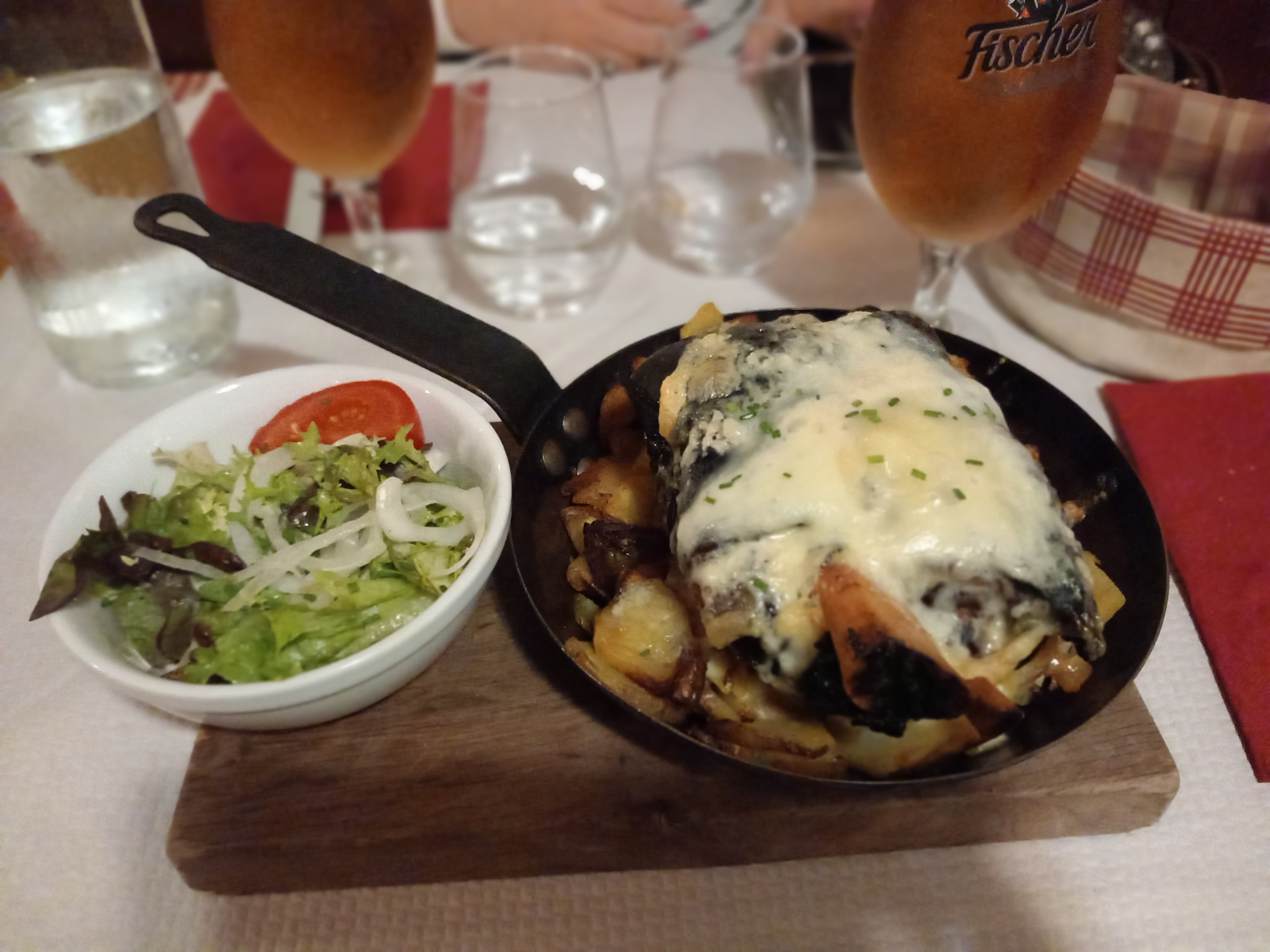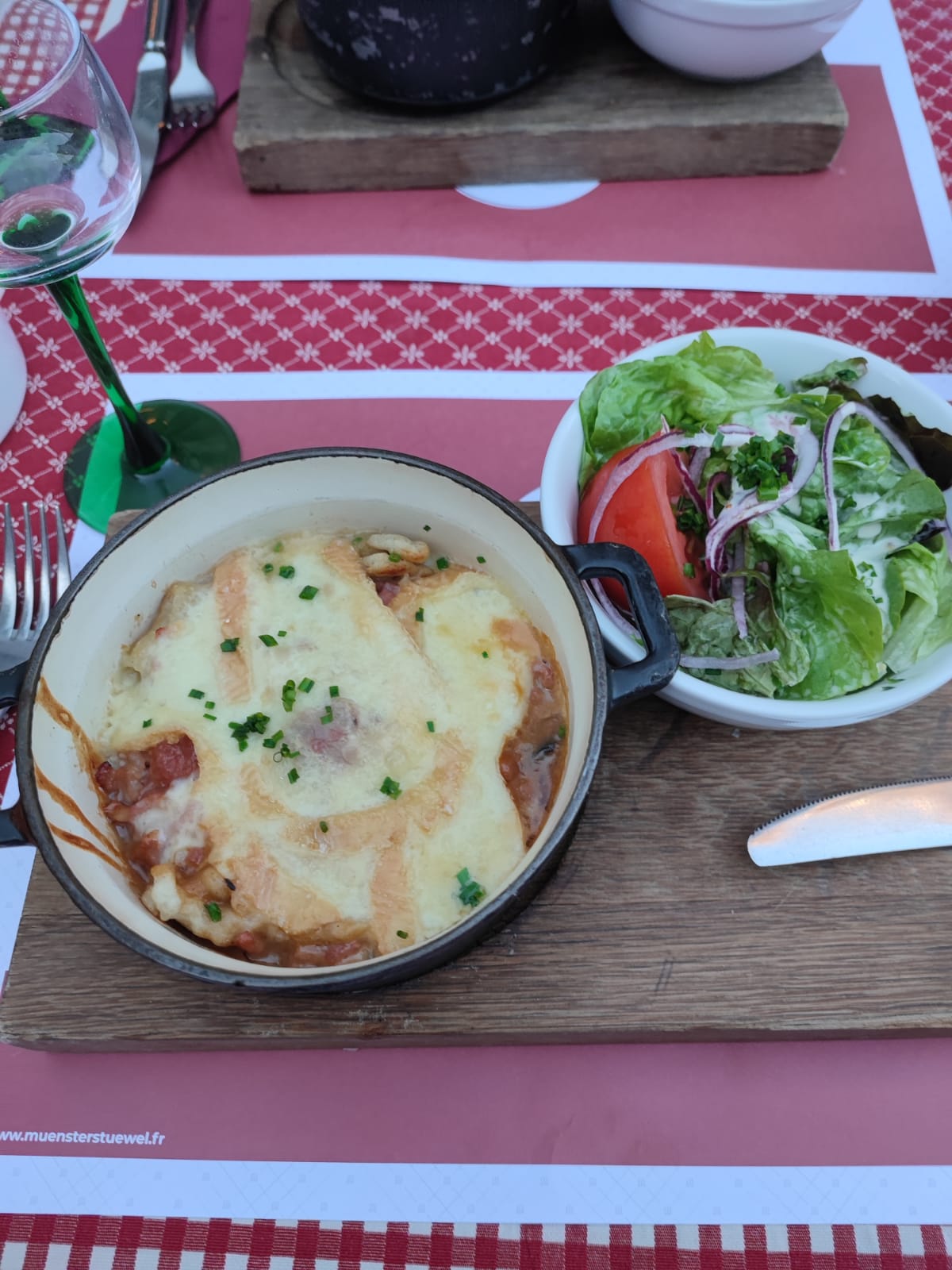 Une très bonne adresse pour découvrir les spécialités régionales à des prix raisonnables. En entrée tarte flambée végétarienne puis bouchée à la reine et poêlon de spaetzle aux champignons et à la tomme. Tout celà servi par un personnel très agréable. De plus les animaux sont acceptés, que demander de plus à part y retourner ?