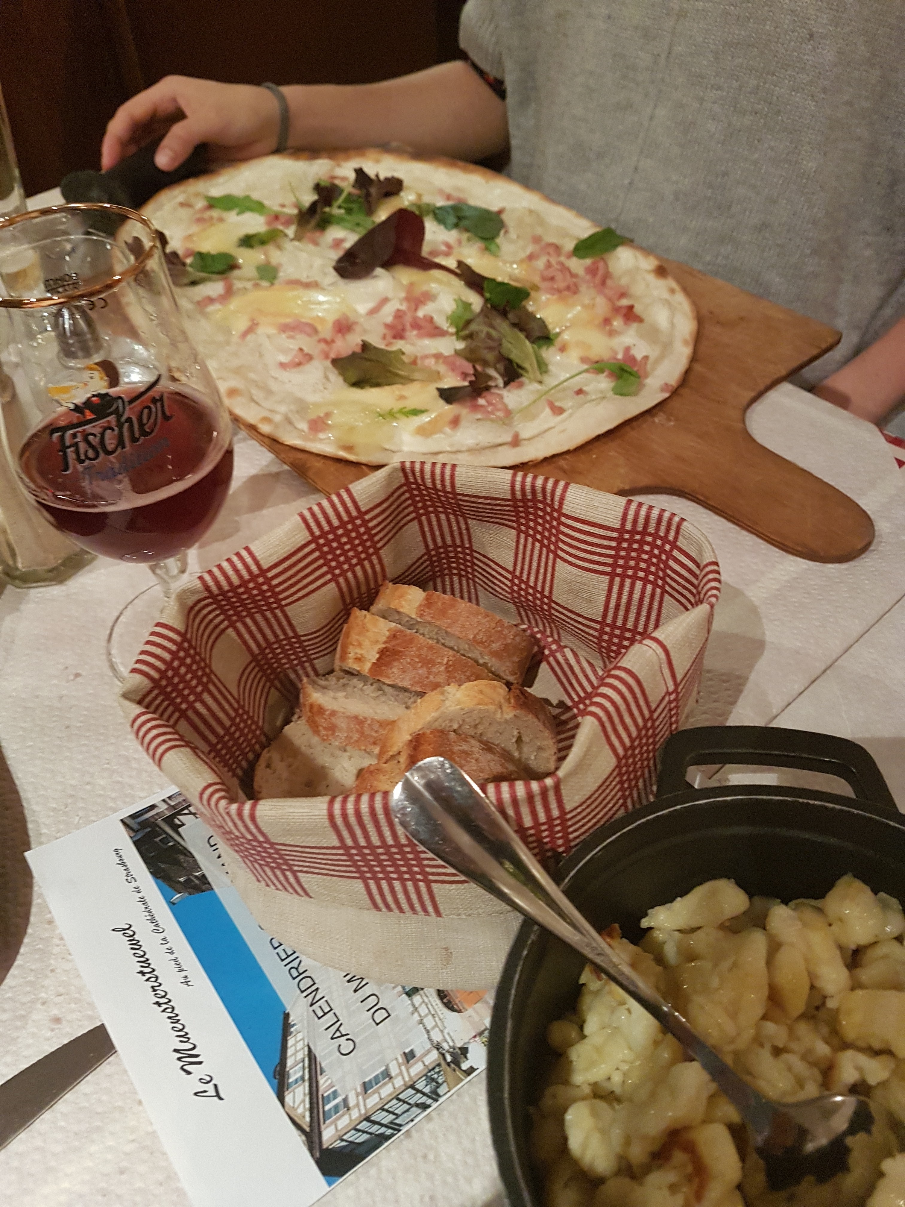 De séjour de courte durée sur Strasbourg, nous avons sélectionné ce restaurant en raison de ses prix plus abordables présentés sur le site internet. A notre arrivée, nous avons eu la surprise de constater que les prix étaient en moyenne 4 a 5€ plus chers que ceux présentés sur internet. Nous demandons des explications : il s’agissait de la carte de Noël (ironiquement identique à celle d’hiver, si ce n’est un changement de prix). Cette différence de prix n’était absolument pas justifiée. Niveau plat : notre choix s’est porté sur une tarte flambée (très décevante, celle du Grand Tigre étaient mille fois meilleure) et des spaetzle champignons et lardons. C’était convenable. Attrape touriste pour les prix de la carte de Noël. Sinon convenable dans l’ensemble. Je ne recommande pas.