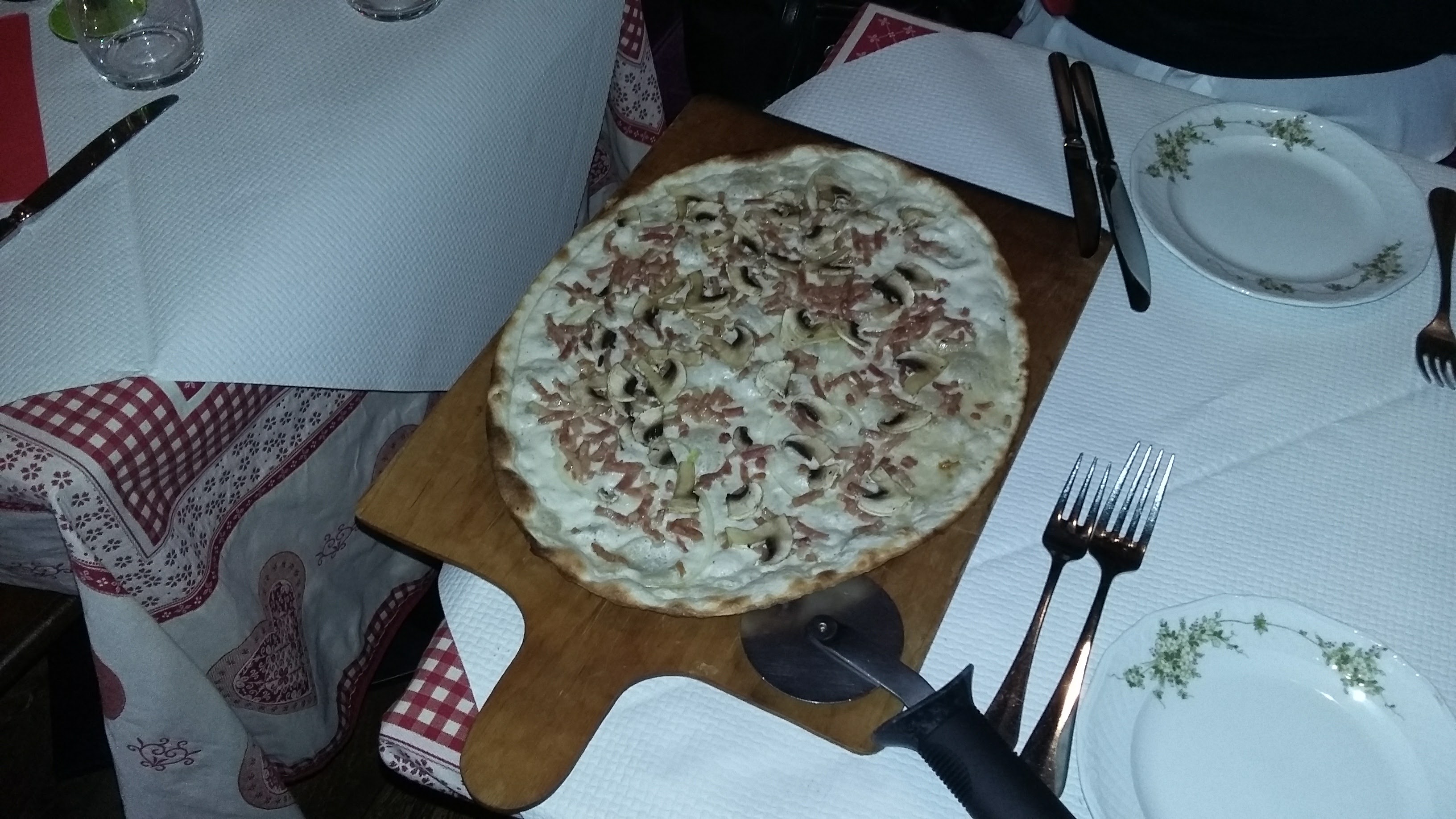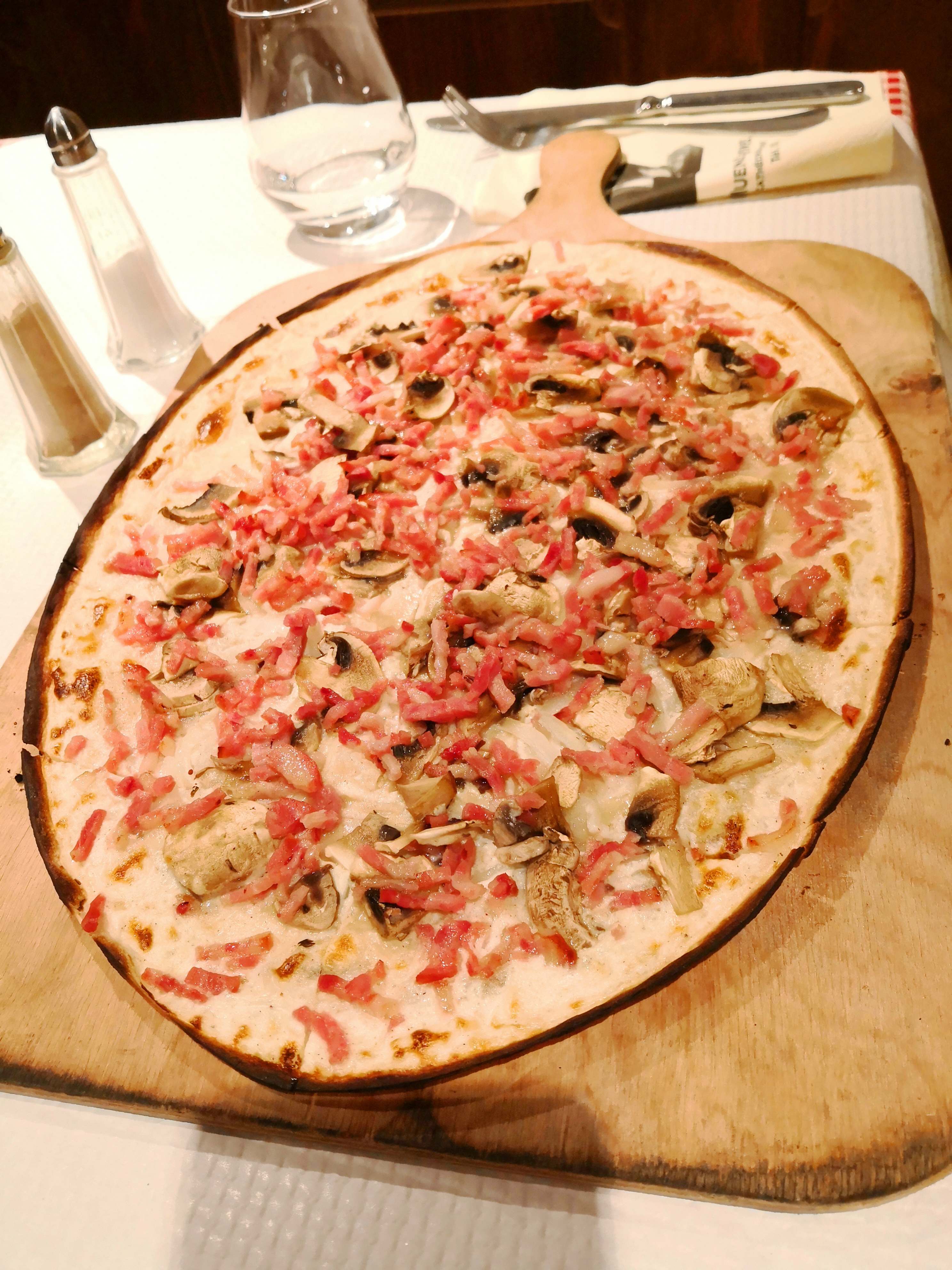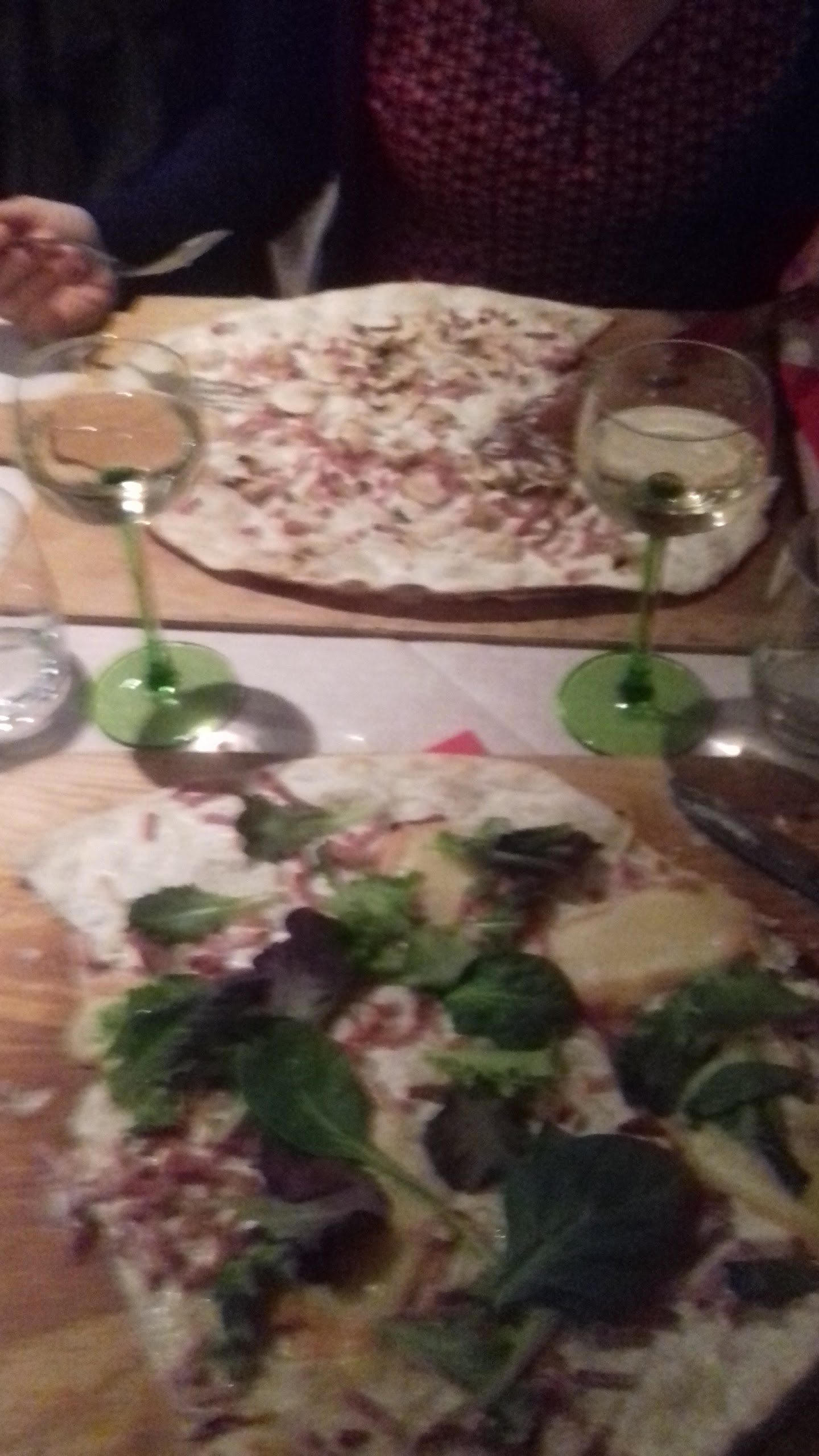 Flammenkuche au Münster et champignons bonnes mais sans plus par rapport à d'autres que j'ai pu manger ailleurs. L'éclairage du restaurant serait à revoir pour proposer une ambiance plus chaleureuse.