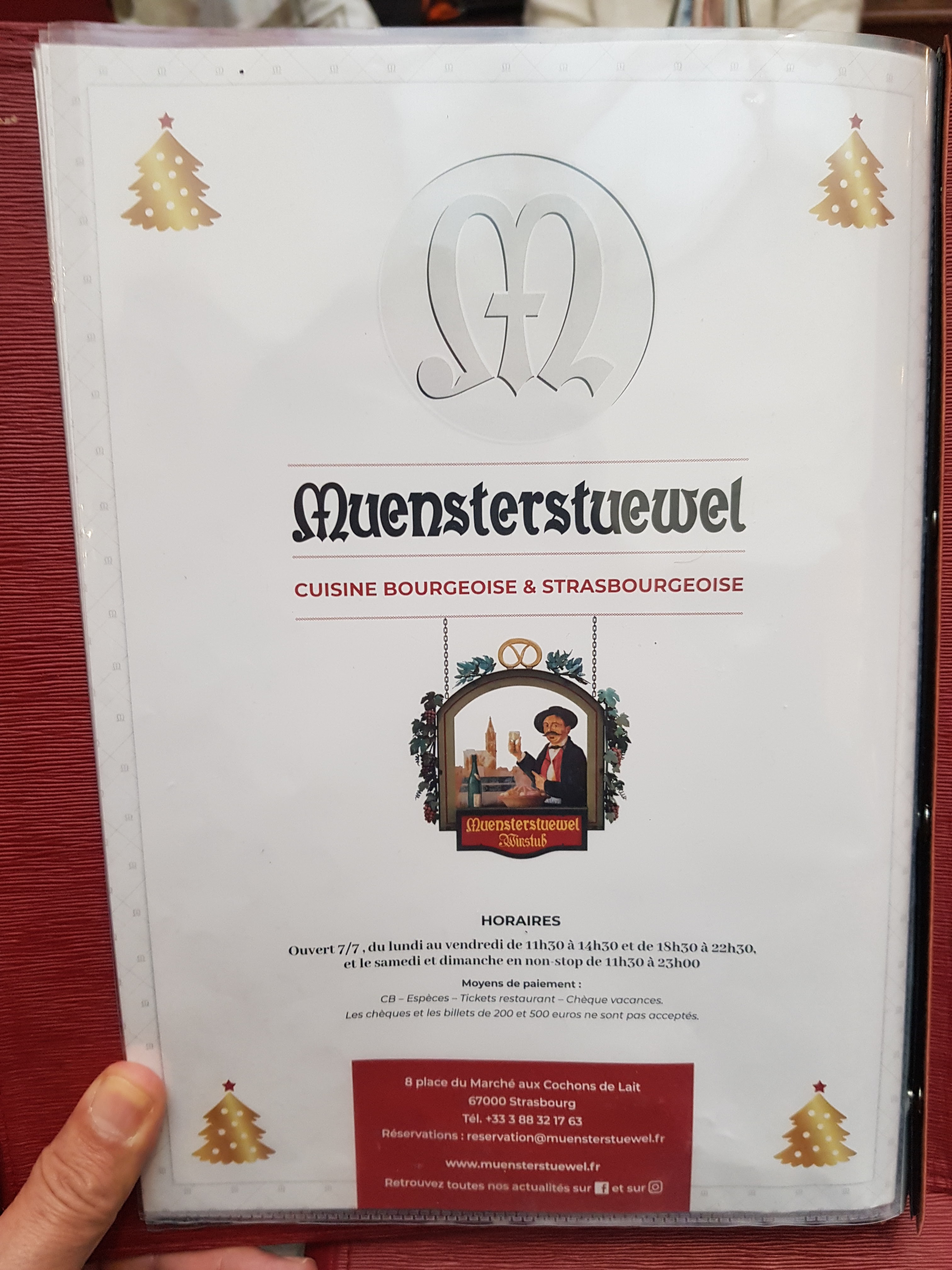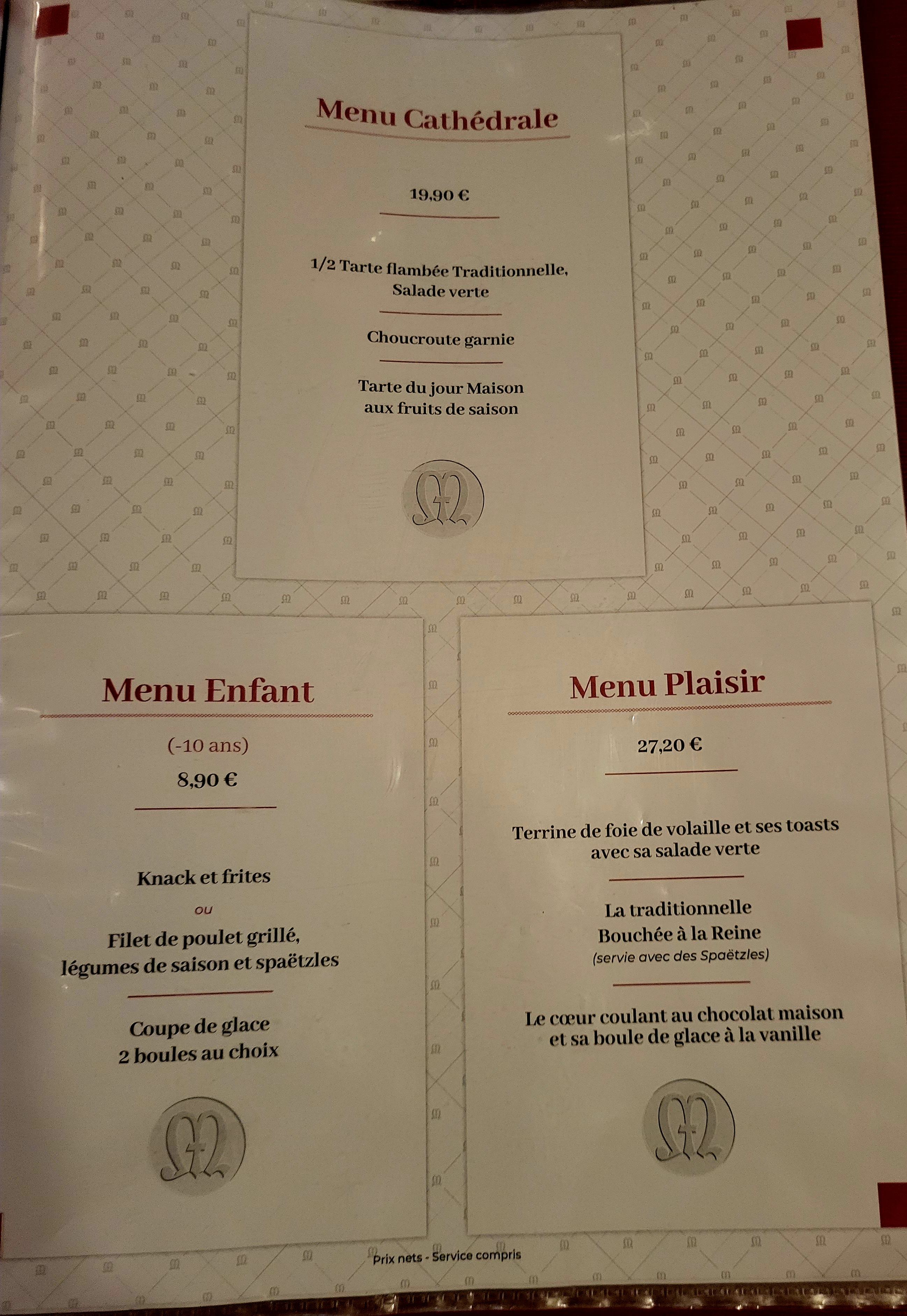 Restaurant typique alsacien tant dans sa cuisine que dans la décoration de la salle. Des prix plus que raisonnable par rapport à la notoriété et l’emplacement du restaurant (Idéalement placé à côté de la cathédrale). La tarte flambée chèvre miel était bonne mais petit bémol sur la bouchée à la reine. Une carte des desserts variée avec de bonnes quantités. Un conseil : réserver à l’avance pour être sur d’avoir une table
