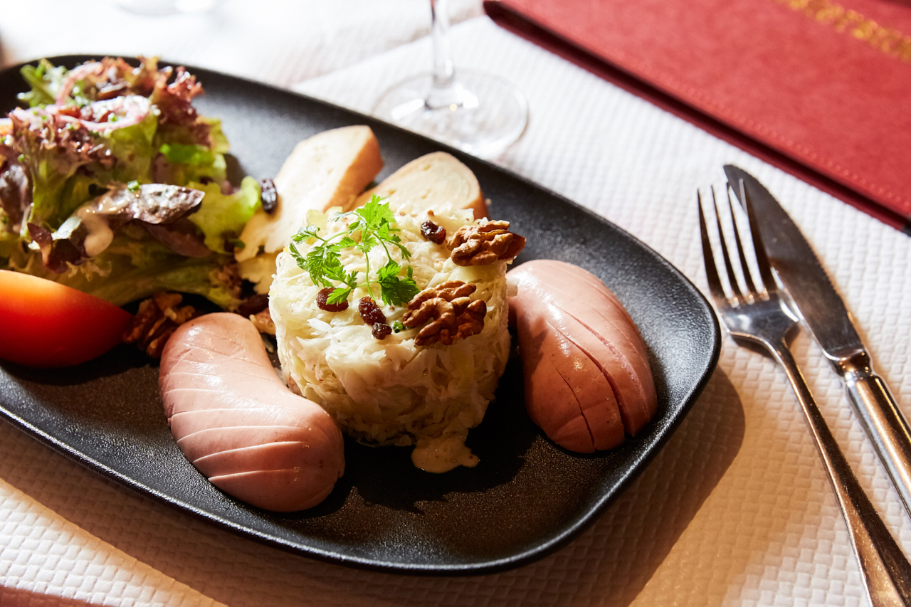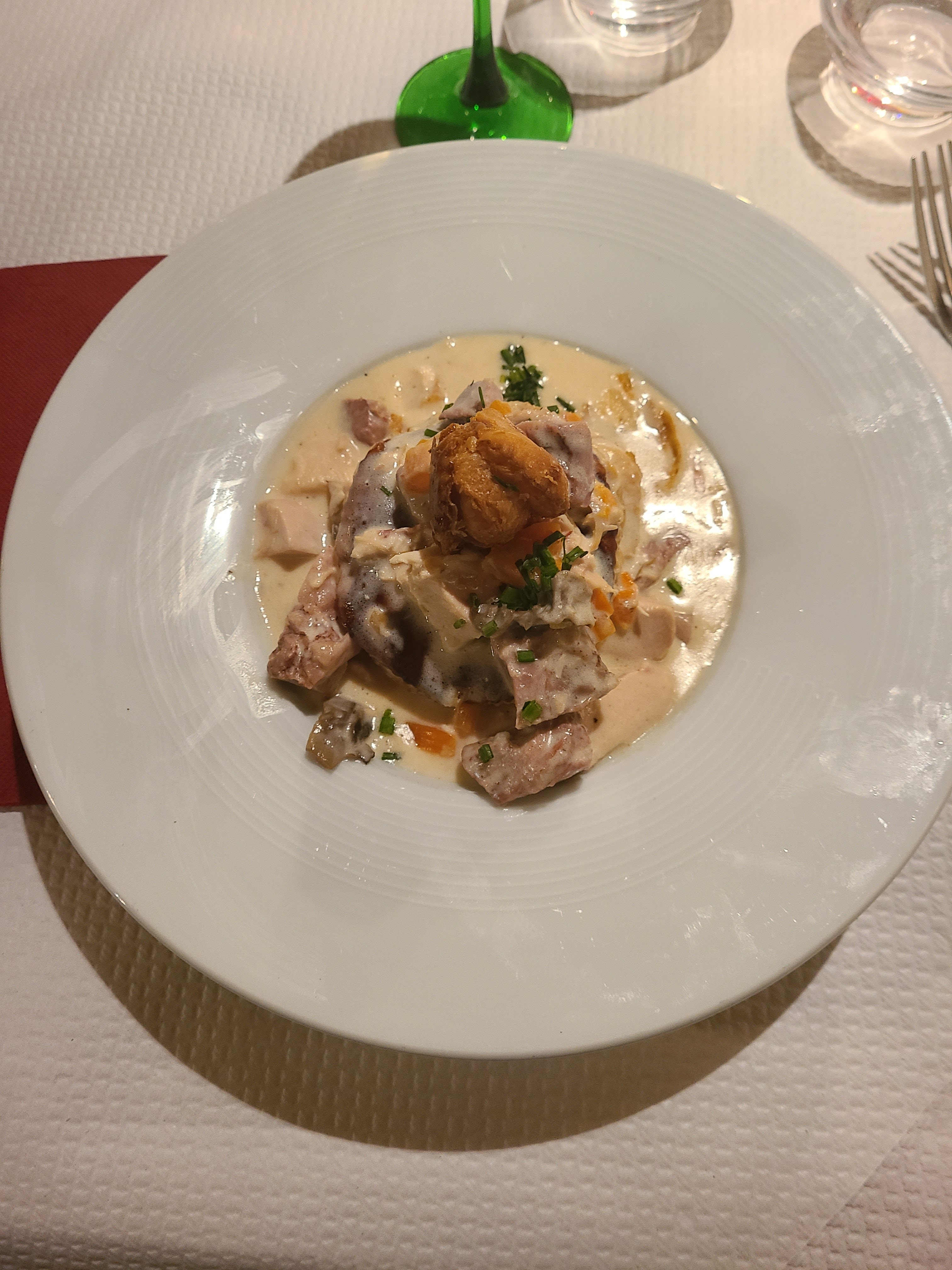 Une cuisine tres moyenne avec des plats tiedes et peusavoureux. Notamment les rognons sauce madere n 'etaient pas bons et la tourte au riesling presque froide avec une pâte tres ordinaire.