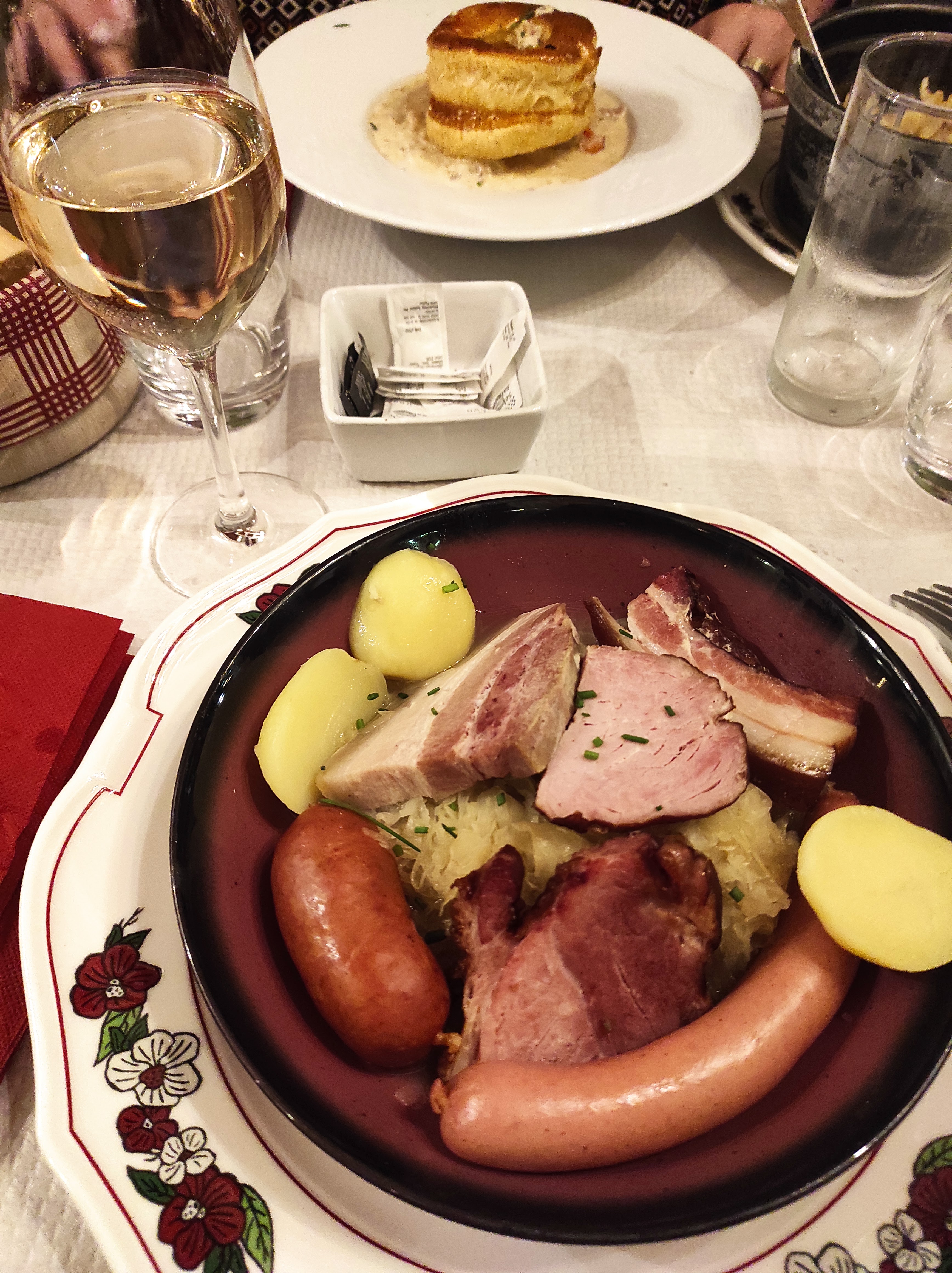 Les repas sont les traditionnels de l’Alsace. Choucroute, flamenkuche et mention pour la joue de porcs au pinot noir qui était un régal. La décoration nous plonge dans la jolie ville de Strasbourg avec ces nappes rouges et les nombreuses décorations. Le personnel était très accueillant et agréable lors du service. Si vous recherchez un restaurant qui sert durant toute la journée dans un décor digne d’un film, vous savez où aller.
