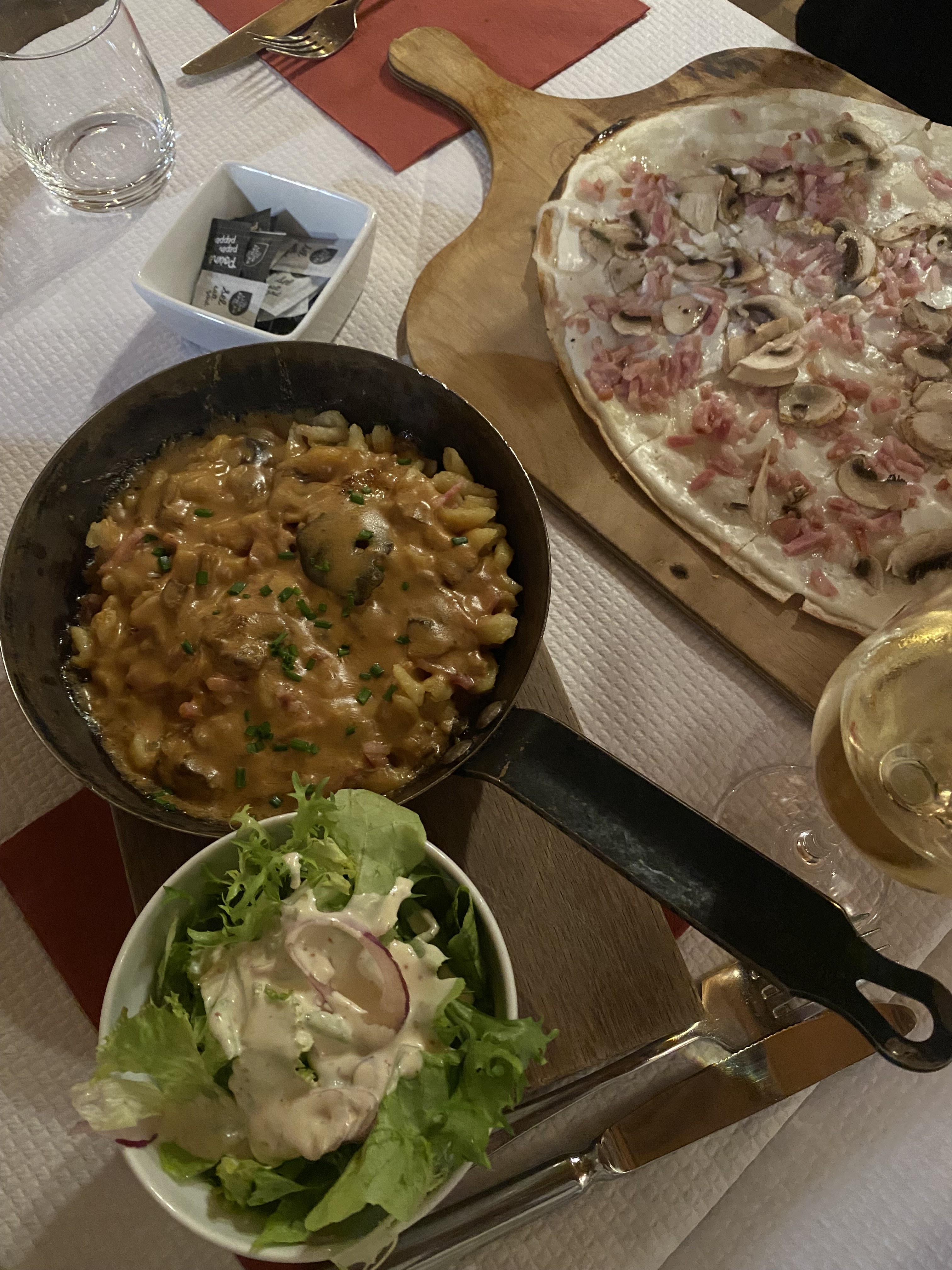 On recommande, c'était vraiment une super expérience 😊 ! Nous y sommes allés en amoureux hier soir et le personnel était très gentil, chaleureux et avait de l'humour ! Nous avons pris une flam et des spatzles excellents ! Merci pour tout.