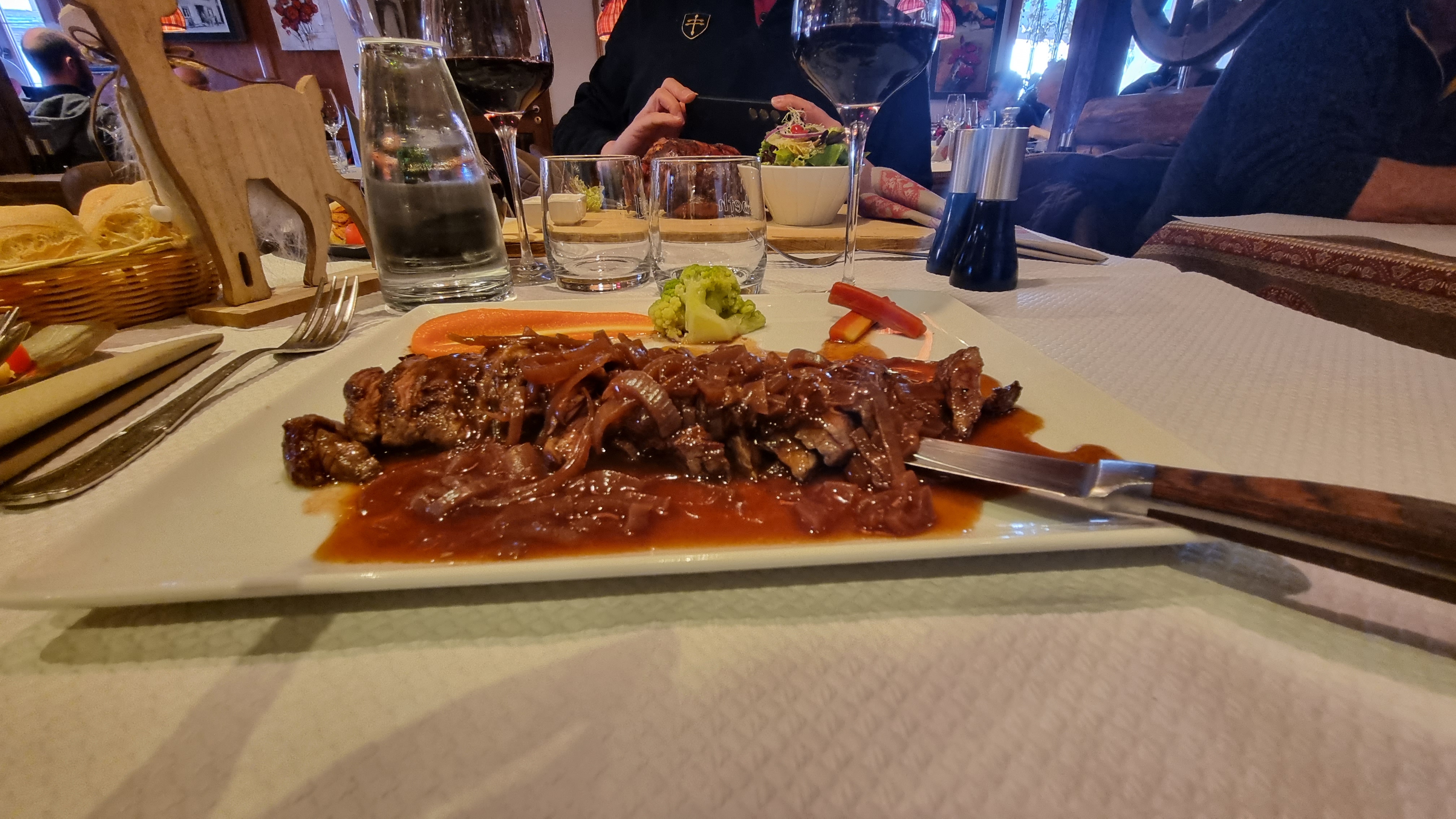 Plat très cher même si la cuisine est bonne elle en vaut pas le prix, les Spätzle très secs et les frites molles et l'eau de la carafe est tiède ! Même pas fraîche avec un arrière goût de calcaire, c'est assez décevant. Service sympathique