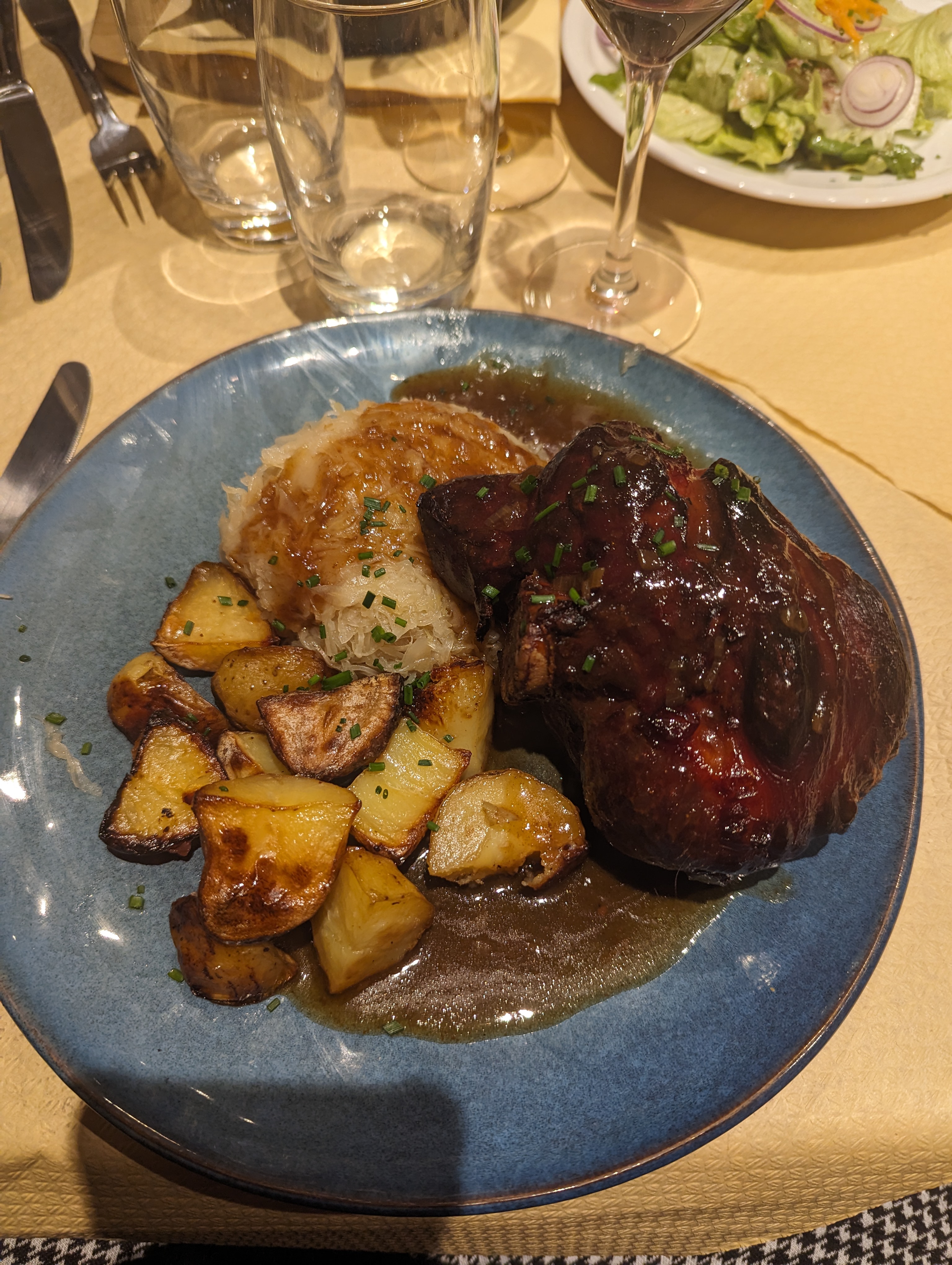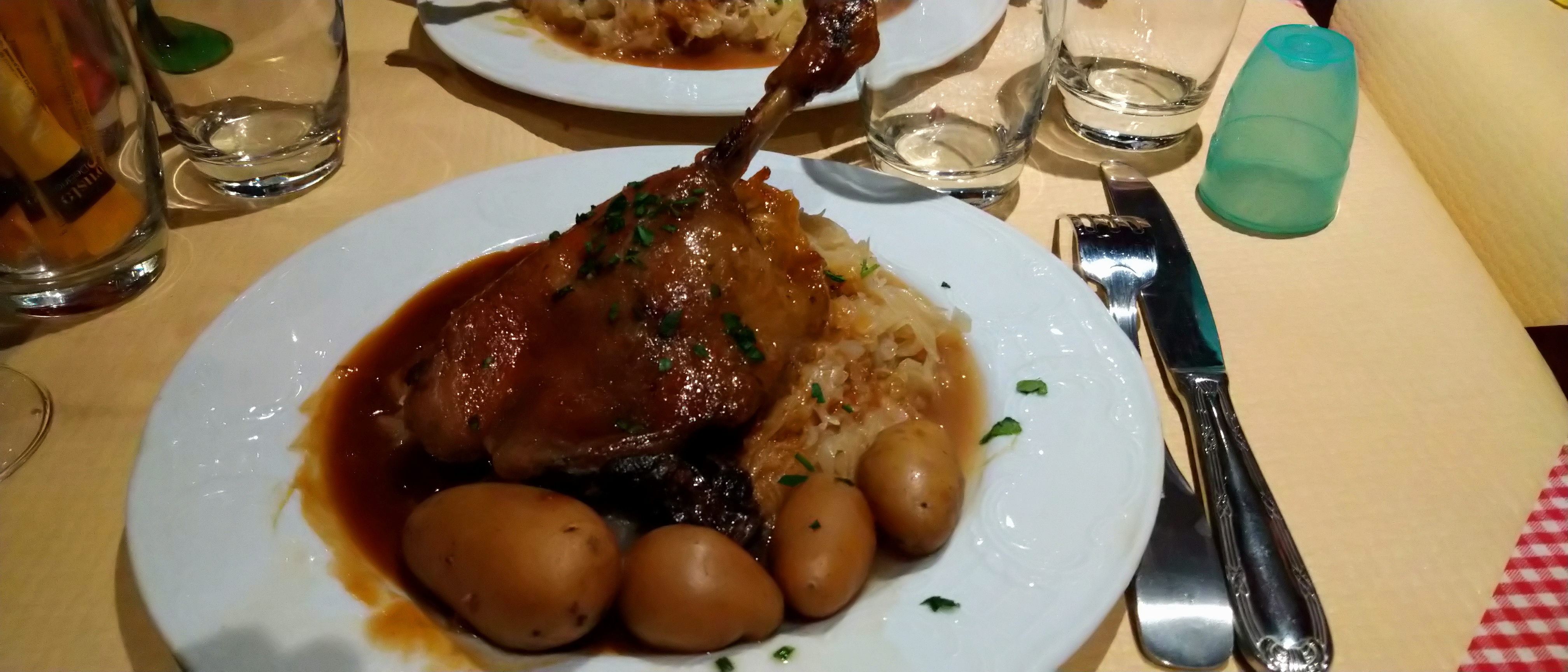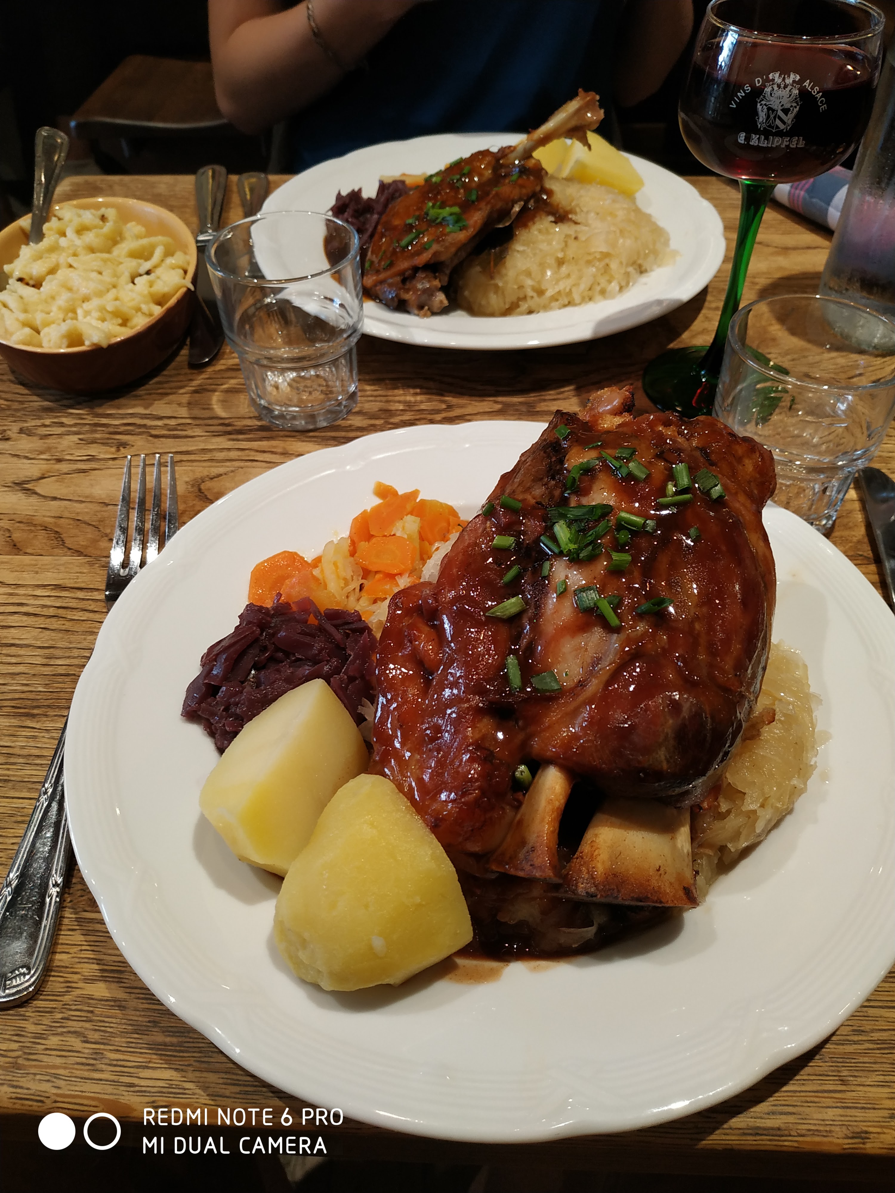 Jarret de porc, choucroute au pinot noir, le verre de pinot et spetzel et sa cuisse de canard en fond . Un régal très copieux !