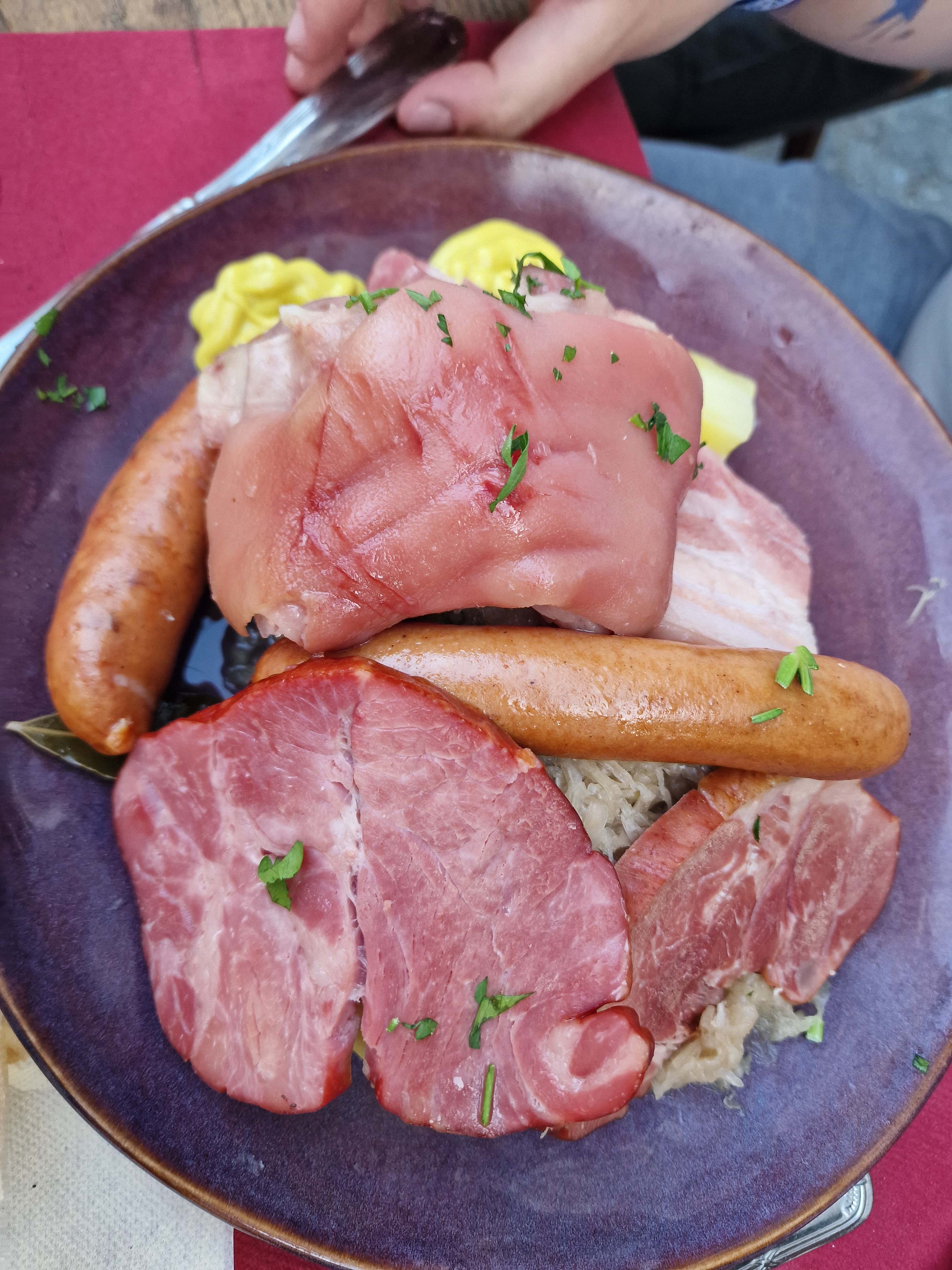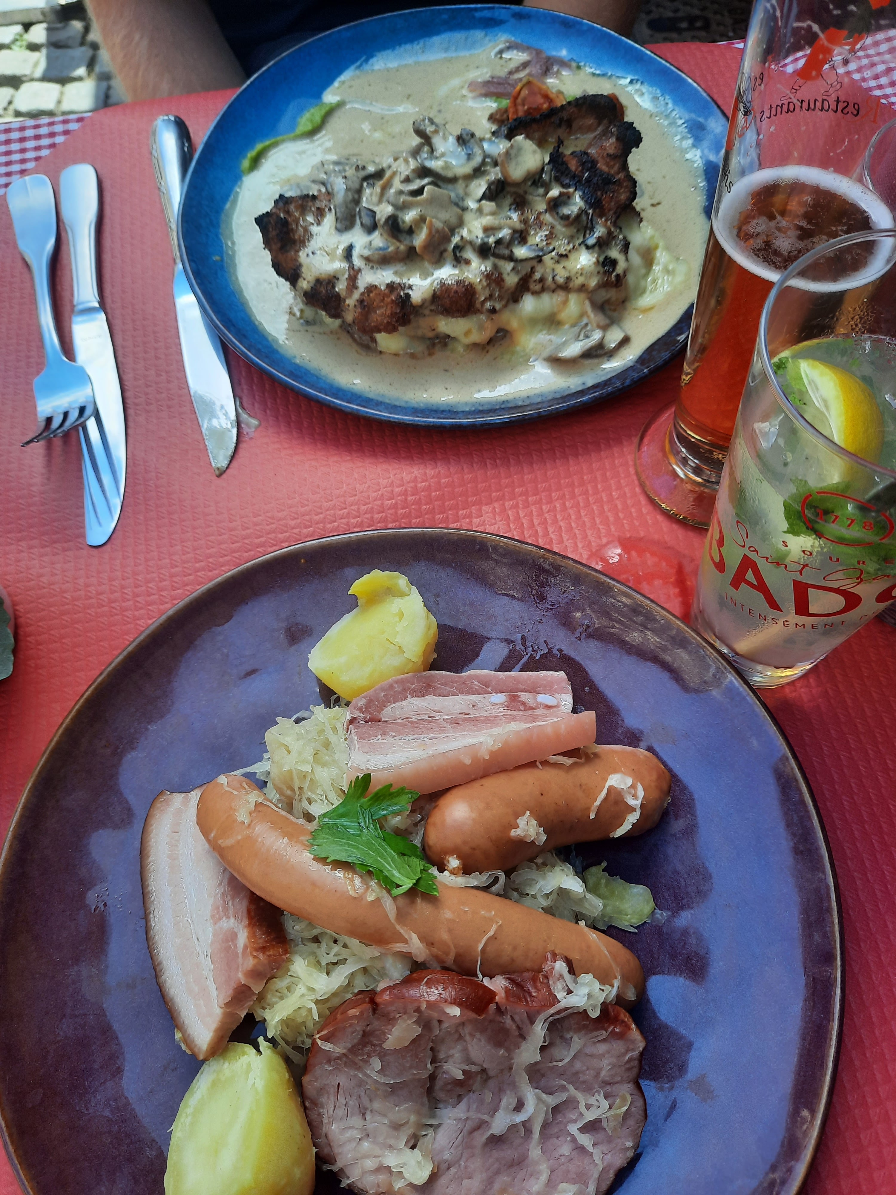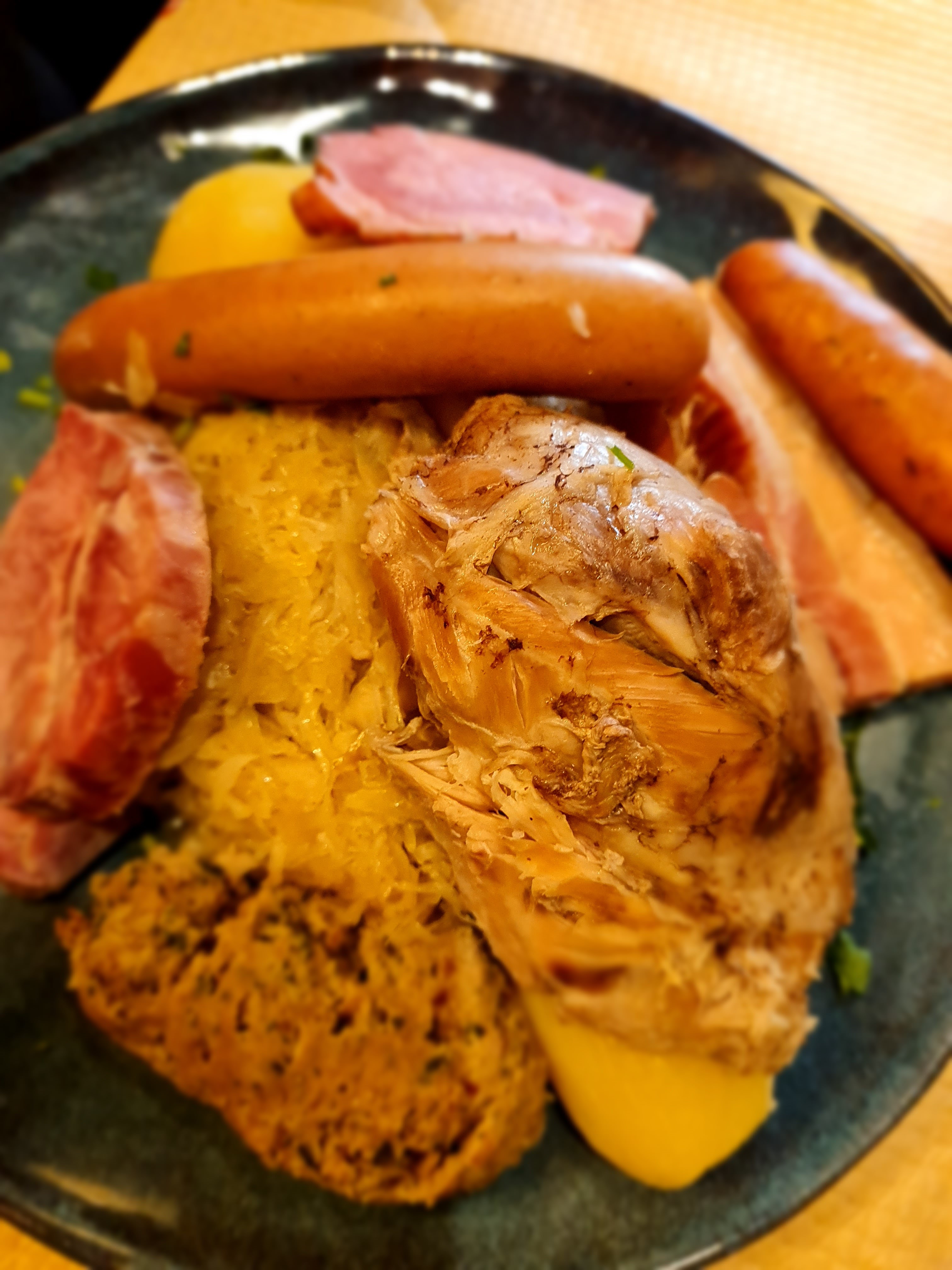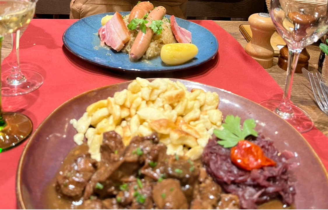 Jarret de porc, choucroute au pinot noir, le verre de pinot et spetzel et sa cuisse de canard en fond . Un régal très copieux !