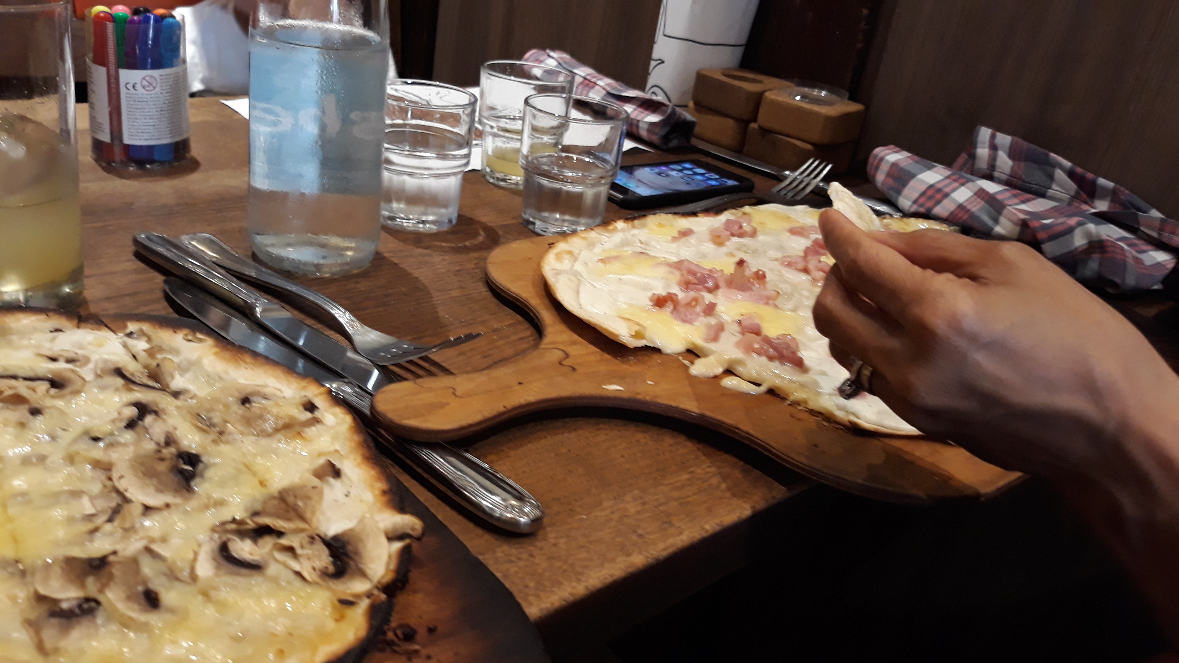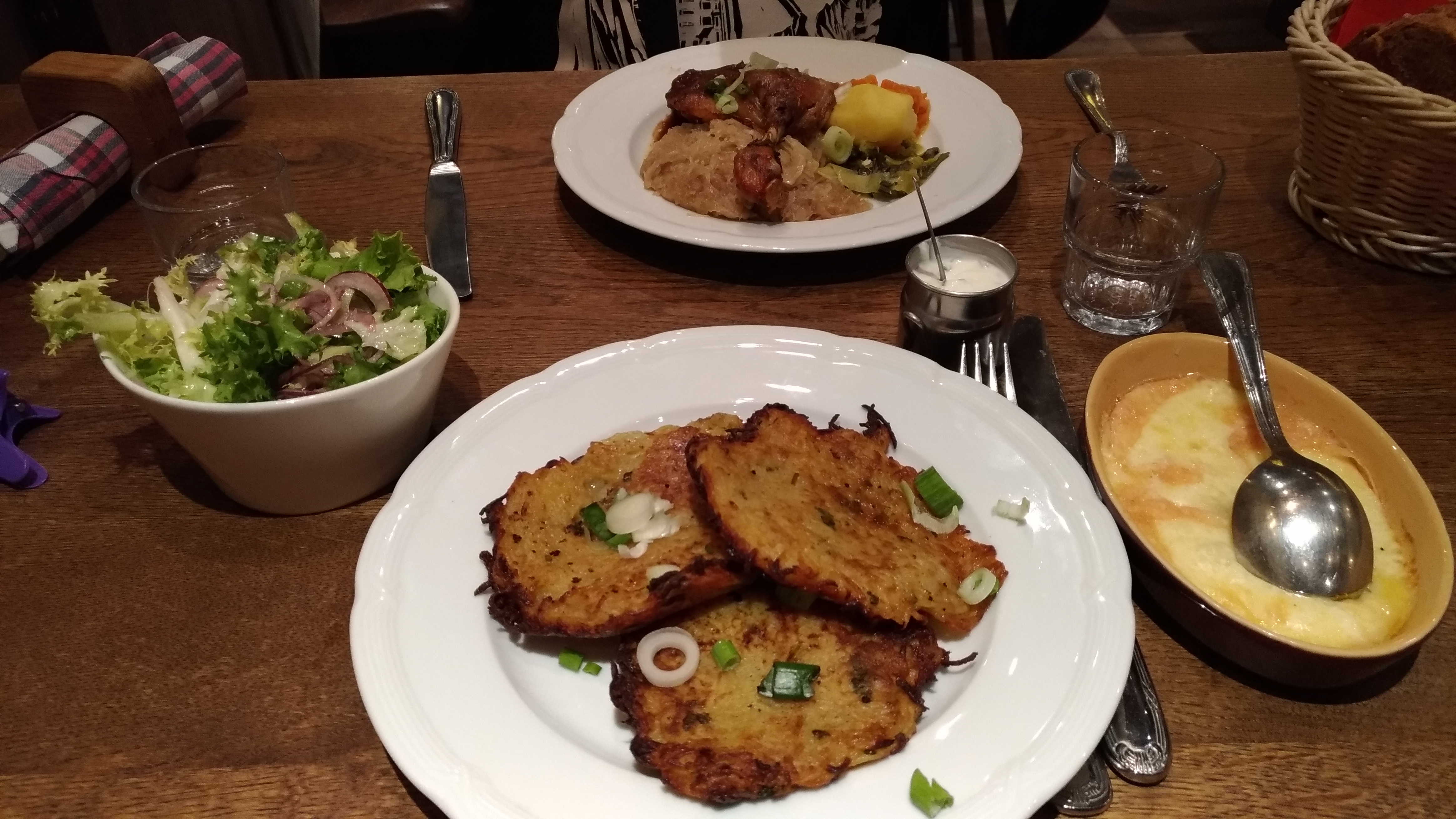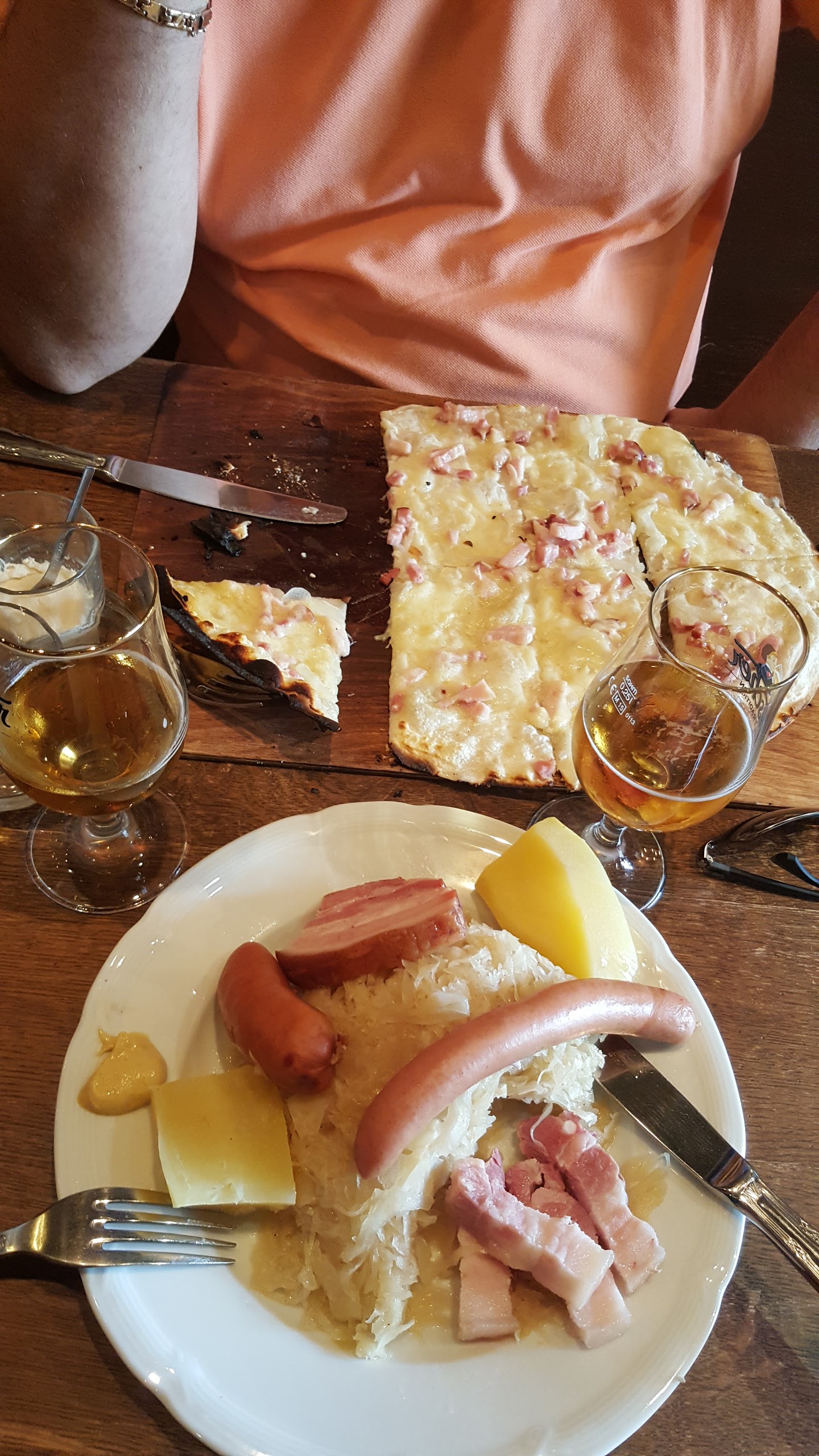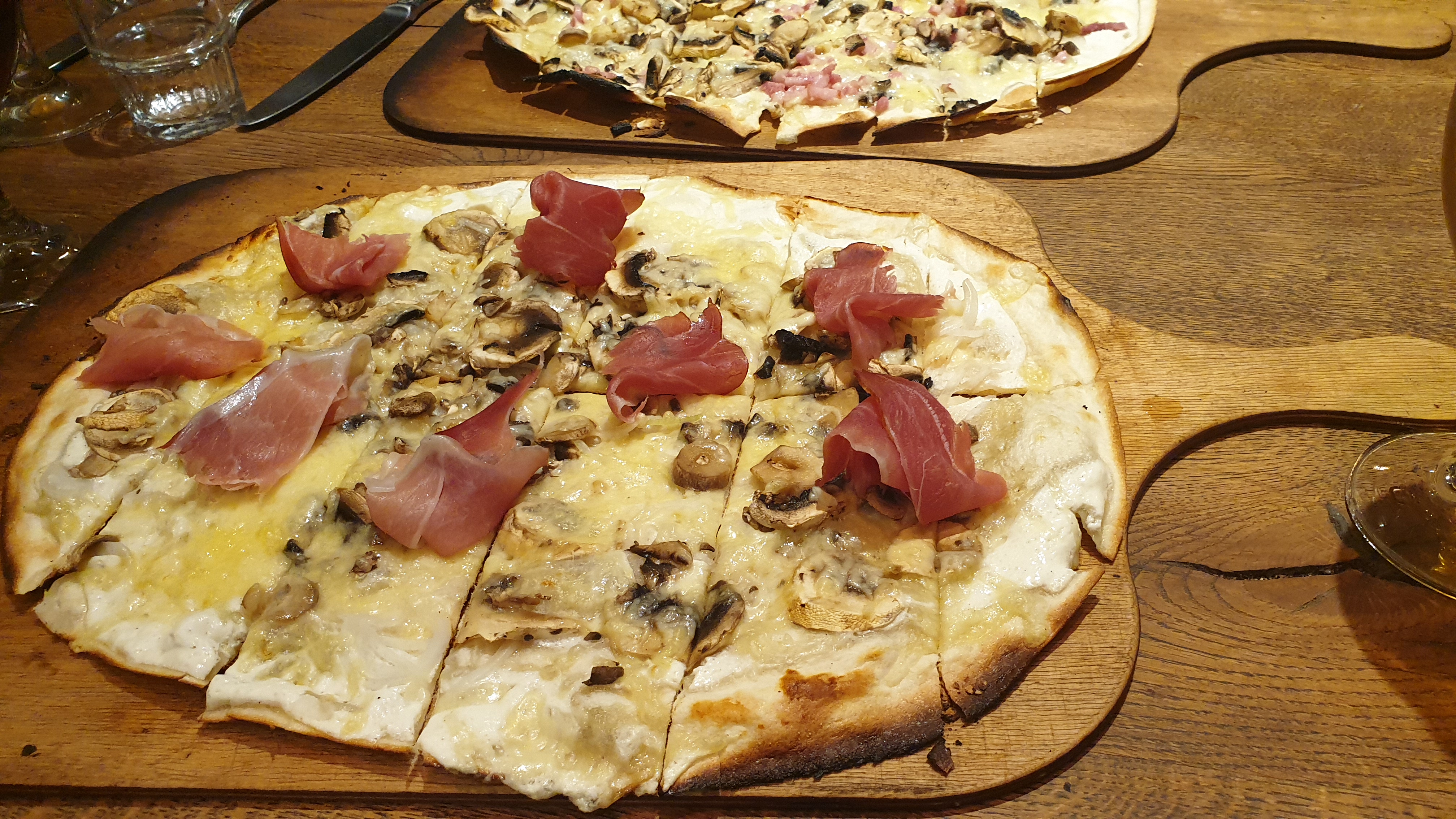 Repas en soirée, rostis et flammekuches délicieuses (particulièrement la framboise/chocolat en dessert). Le serveur est resté souriant et agréable malgré le fait qu'il était seul pour servir.