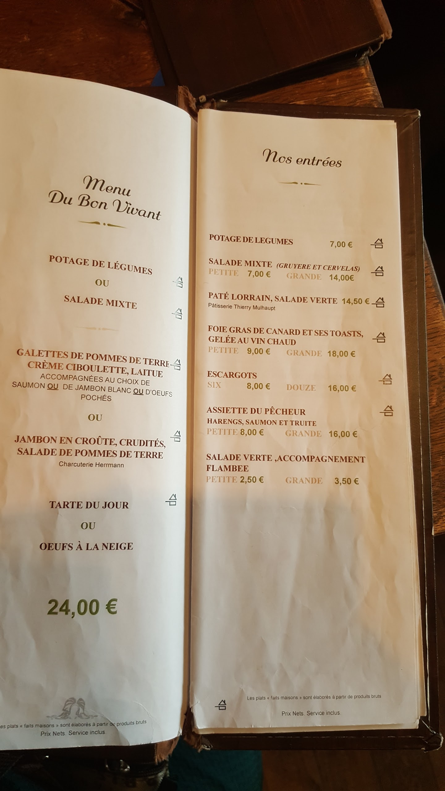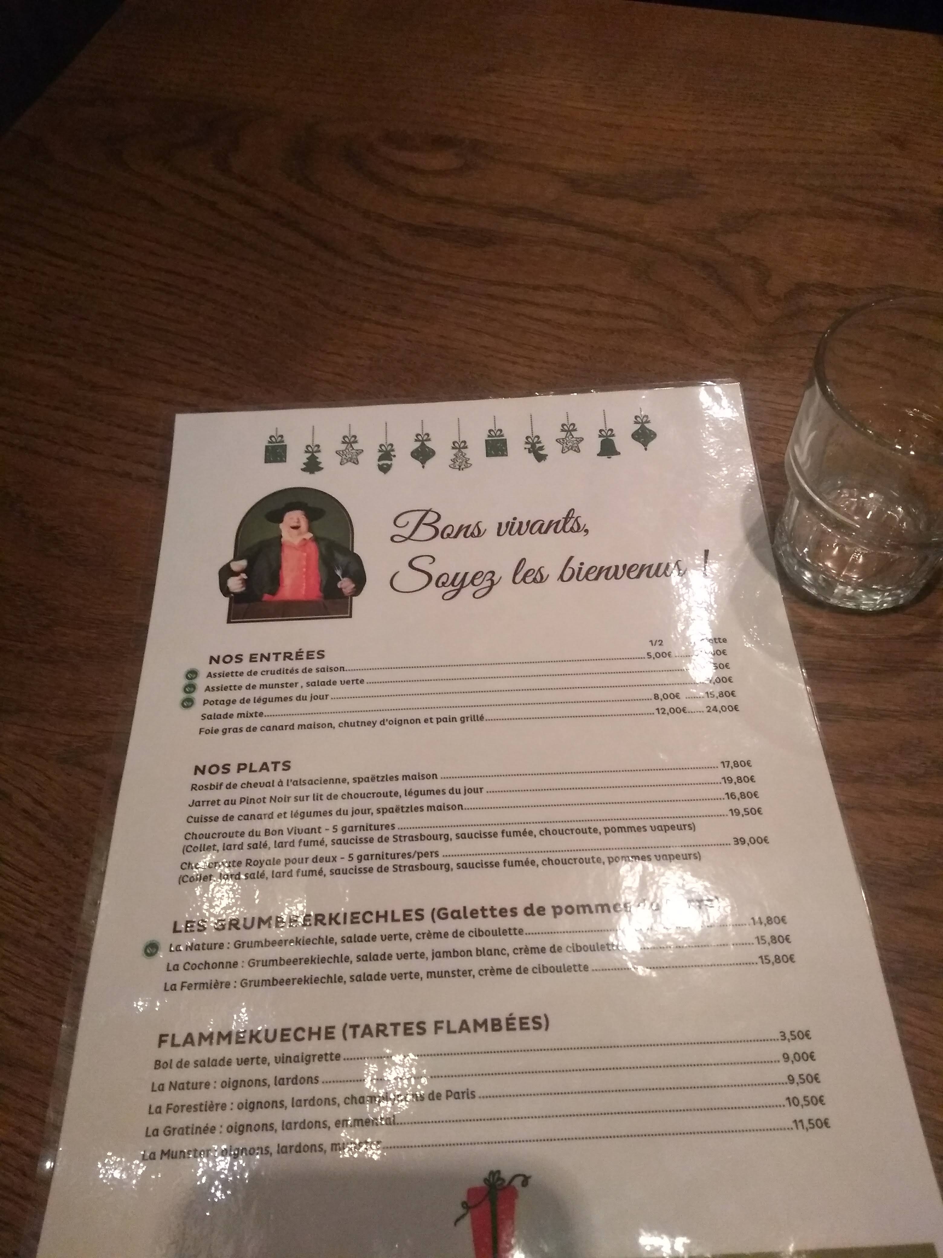 « Au Bon Vivant » est un restaurant qui possède un cadre typique et sympathique. La carte possède plusieurs références Alsacienne sans pour autant être inondé de plats; cela prouve la qualité des produits. Nous avons mangé une choucroute Alsacienne ainsi que des bouchées à la Reine. Pour ces deux plats la qualité était vraiment présente et la cuisson pour les bouchées était parfaite. Pour la choucroute elle était vraiment bonne pas sèche du tout et bien cuisinée. Le plus grand point positif pour nous est la grande gentillesse du serveur et son grand professionnalisme. Dès l’entrée dans le restaurant jusqu’à notre départ, NICOLAS a été un serveur au TOP! Il aime son métier et le fait retranscrire à sa clientèle. C’est rare de nos jours alors quand c’est le cas il faut le souligner. Pour information, nous sommes deux touristes et nous avions réserver pour un soir. Nous recommandons ce restaurant pour sa cuisine mais aussi pour le service en salle. Merci NICOLAS!