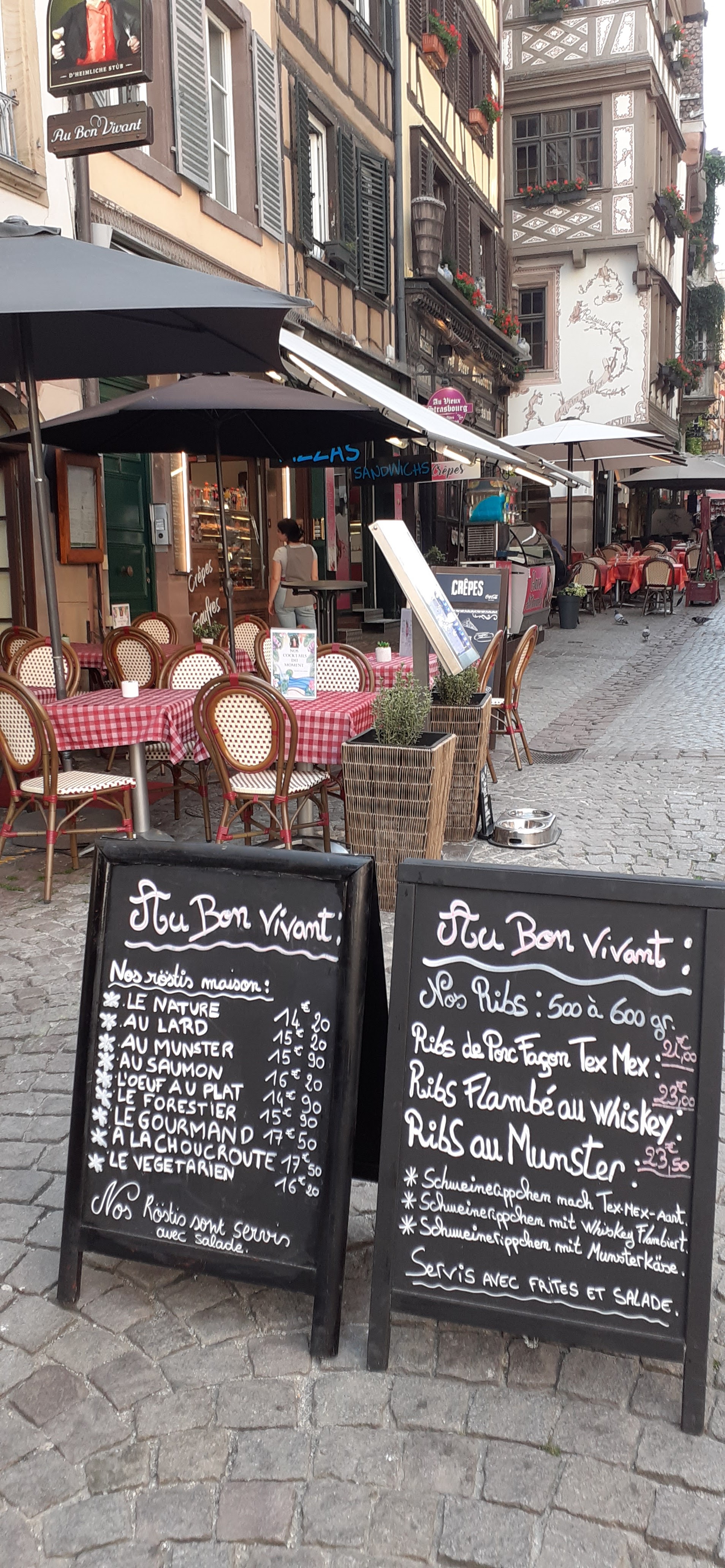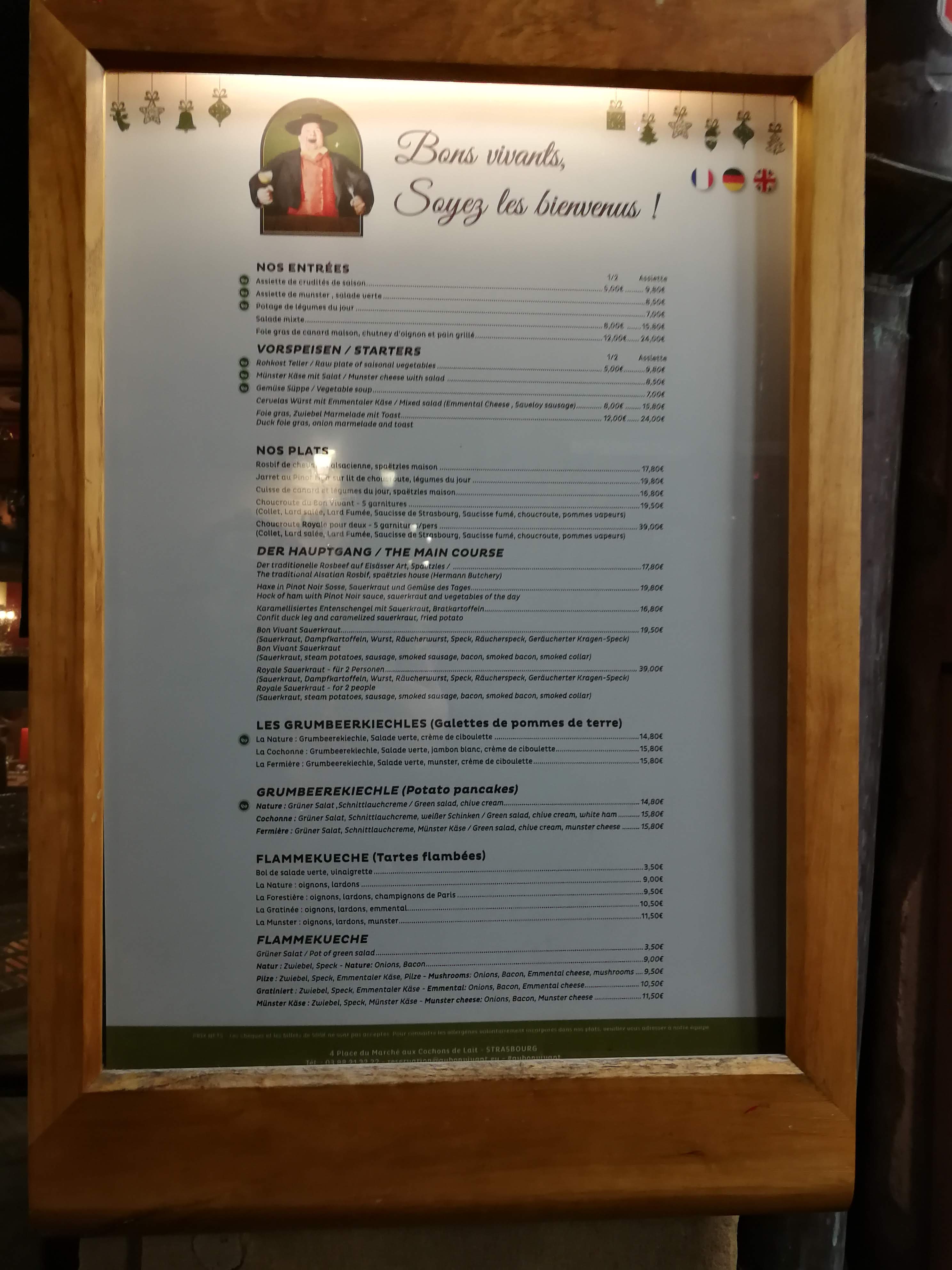 Nous voulions manger local (alsacien) lors de notre visite à Strasbourg et nous sommes venus Au Bon Vivant et nous ne sommes pas déçu. L'accueil est top, les serveurs sont souriants et gentils. La carte est très alléchante avec de nombreux plats locaux. Les cocktails sont très bon ainsi que la cuisine préparé avec des produits frais ! Nous pouvons retrouver a la carte des röstis, des flammenkuches et des plats traditionnels comme le cordon bleu maison au munster : DELICIEUX ! De plus, le cadre est chouette sur une petite place avec maison en colombage. Je recommande ce restaurant lors de votre visite à Strasbourg, vous ne serai pas déçu !