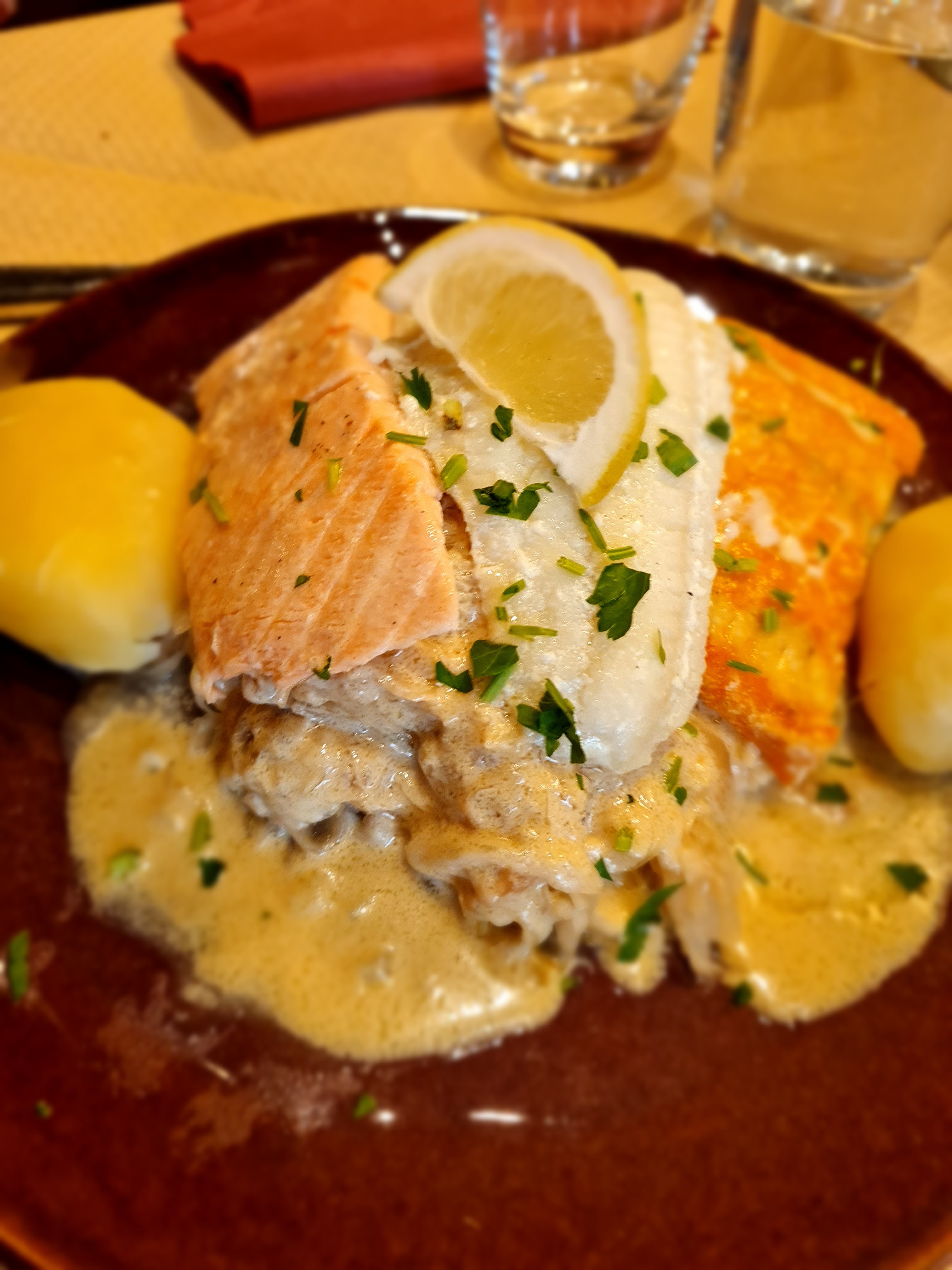 Super service mais les plats étaient moyens (saumon fumé sans presqu'aucun accompagnement, choucroute de poisson avec 500 grammes de chou et... 50 grammes de poisson trop cuit ). Bof