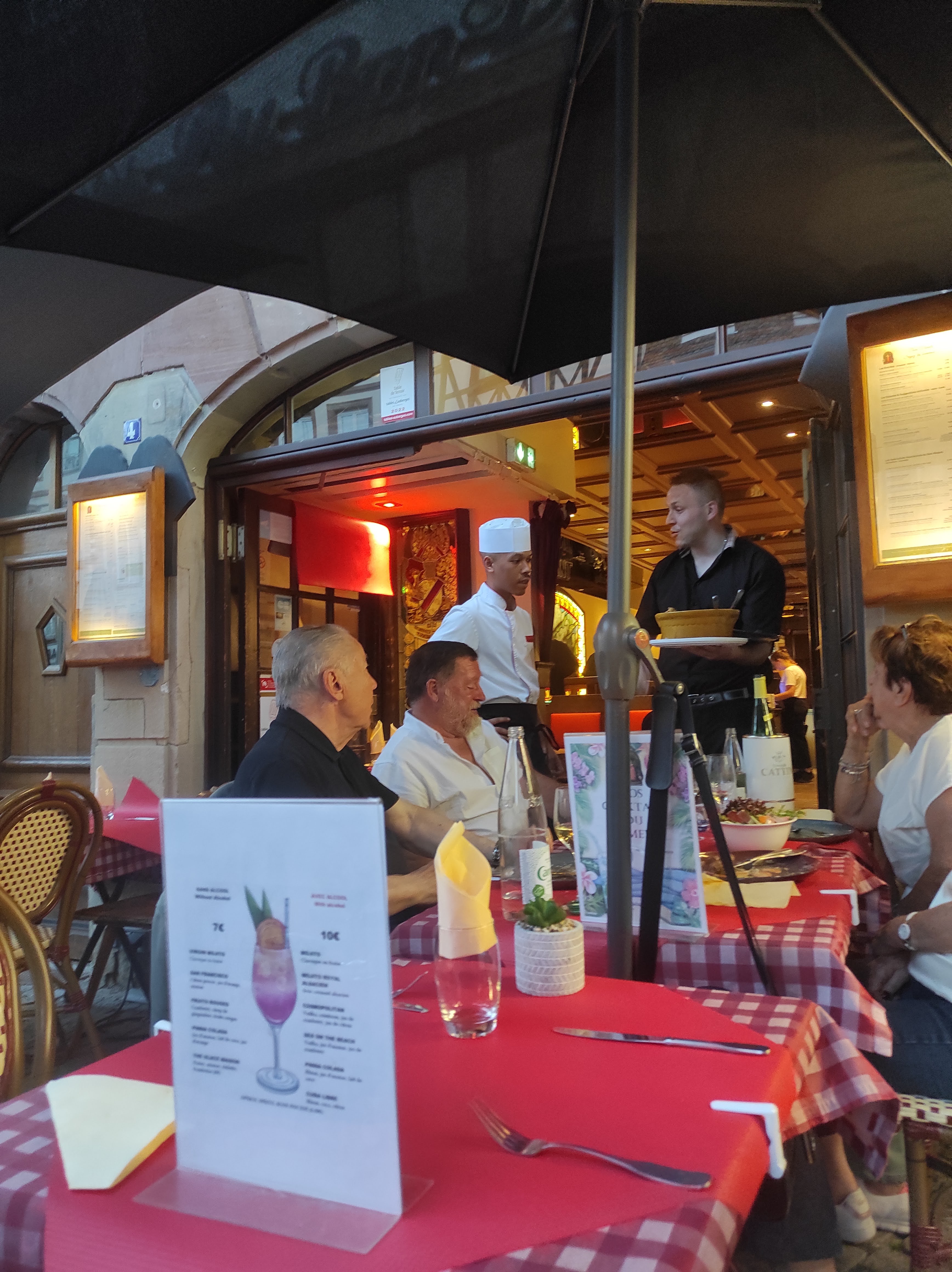 Table 1 : restaurant que nous avons découvert lors de notre séjour à Strasbourg . Restaurant qui porte bien son nom : ambiance très sympathique , les serveurs sont joviales et agréables , ils prennent le temps de répondre à nos attentes avec un grand sourire et amabilité . Le chef Cuisto est formidable : des plats typiques Alsacien et des rostis Suisse , plats savoureux , qui sont faits maison et qui ont vraiment du goût en bouche. Bonne carte des vins . Restaurant que je recommande fortement et où je retournerais à l’occasion !!!