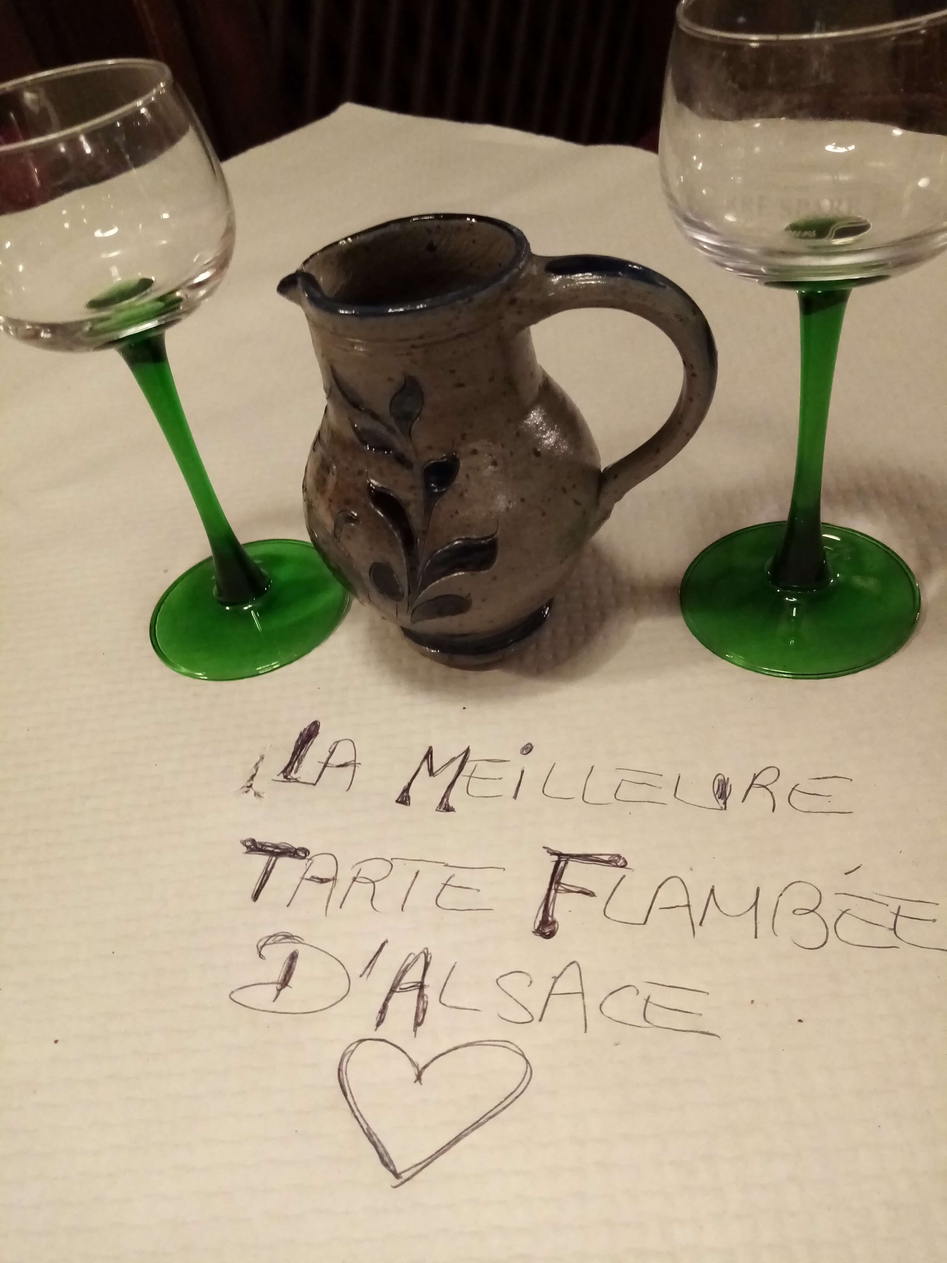 Notre première visite en Alsace a été une totale réussite. Ambiance, nourriture et service tout simplement géniaux. Il faut essayer la tarte flambée, même la version sucrée fait rêver