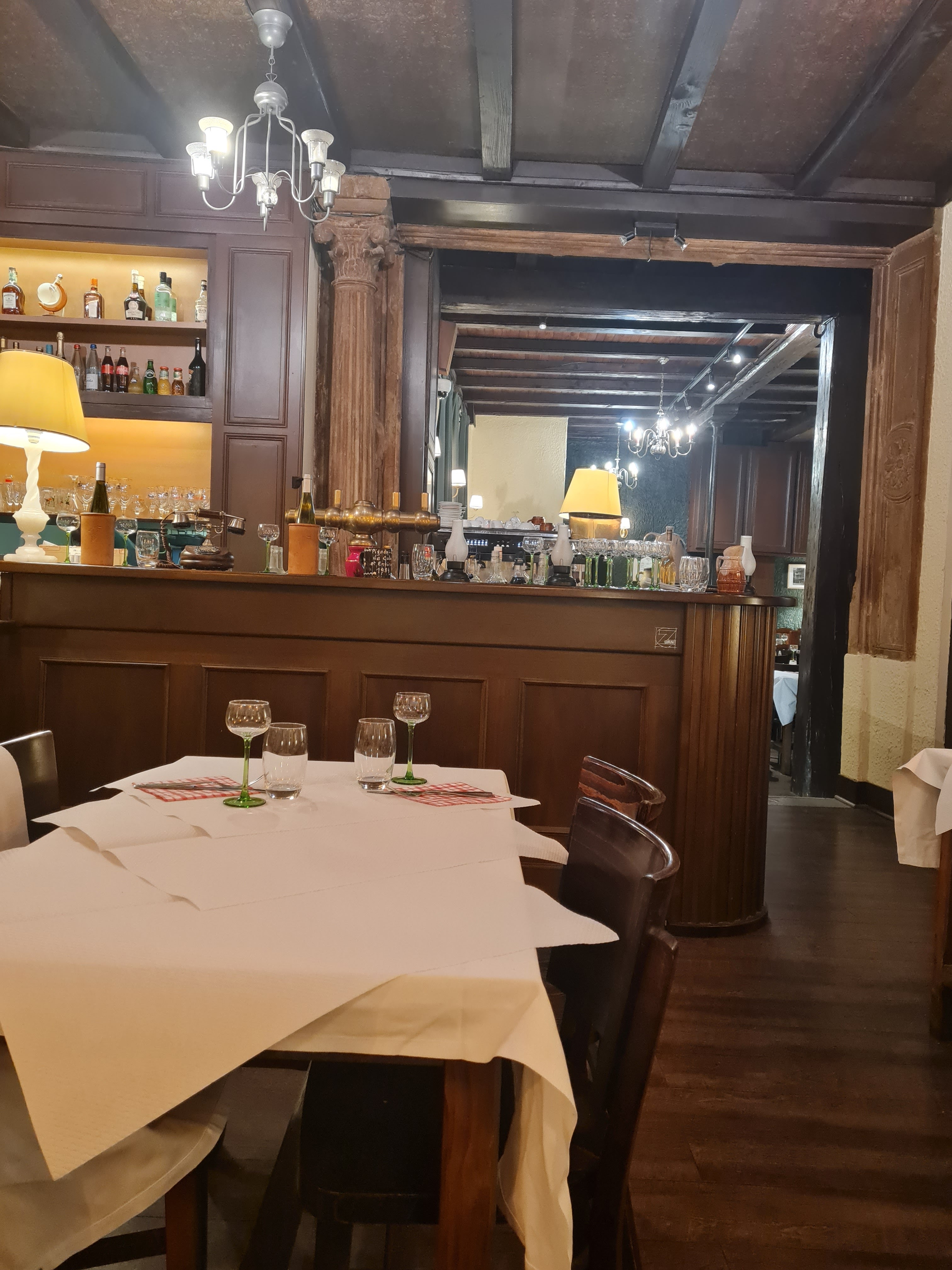 Un décor sympathique, agréable, dans une petite maison en colombage. Avec des décorations (dont une tête de sanglier) nous mettant dans l'ambiance du lieu. Le service est correct, même si une seul personne pour une trentaine de tables est insuffisant. Le serveur est tout de même sympathique, et avec de bons conseils, même si la commande n'est pas forcément celle souhaitée par manque de produit.. L'attente est longue à certains moments. Les plats sont bons, et agréables. Du côté des sanitaires, c'est limite. Une humidité se fait ressentir dans la pièce, due à son emplacement (le sous-sol).