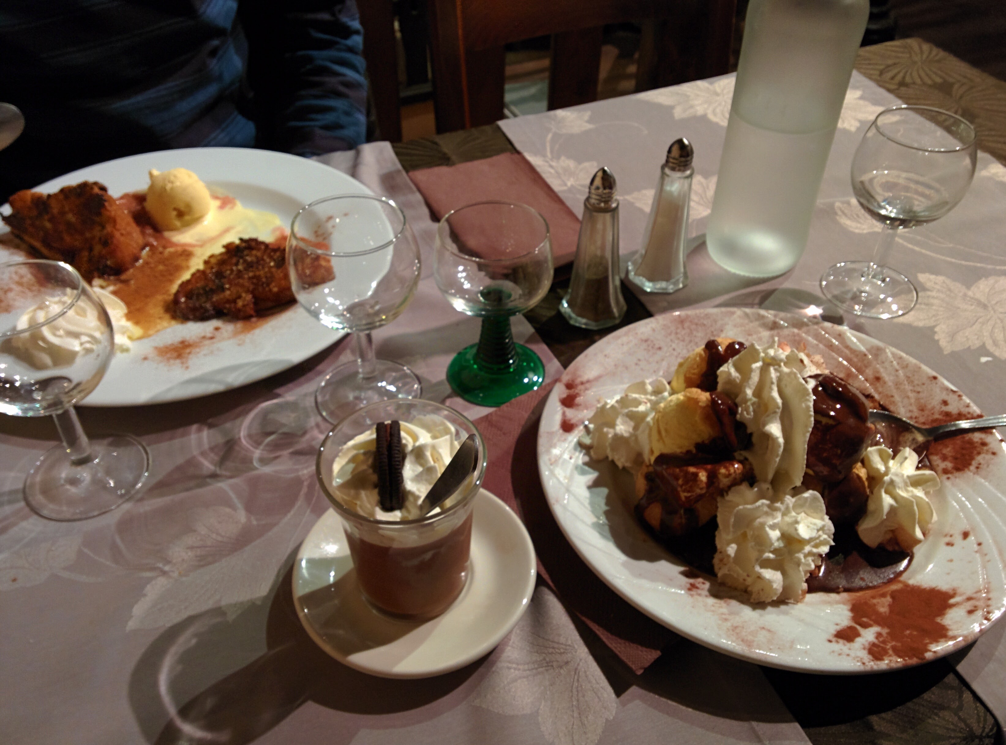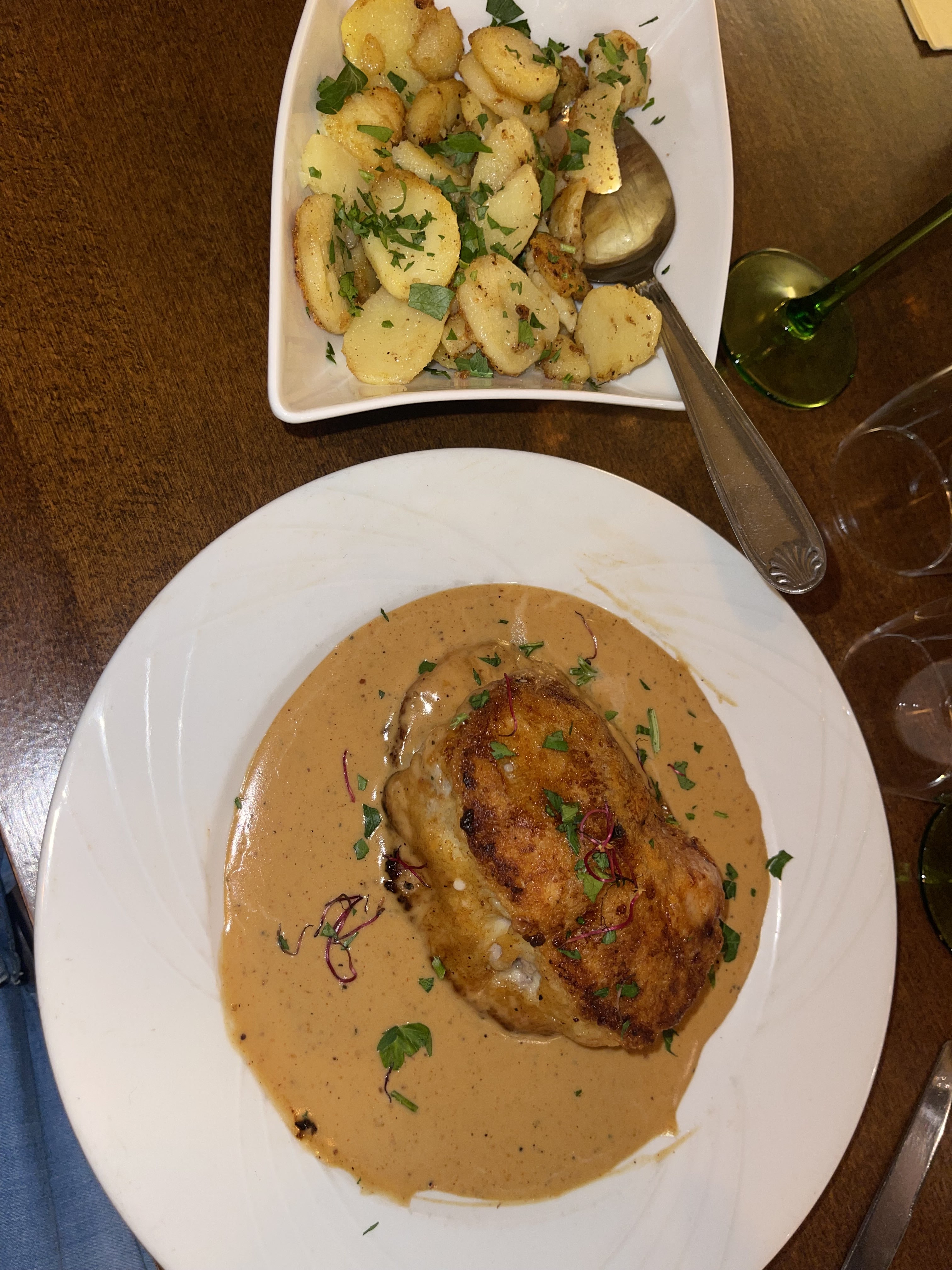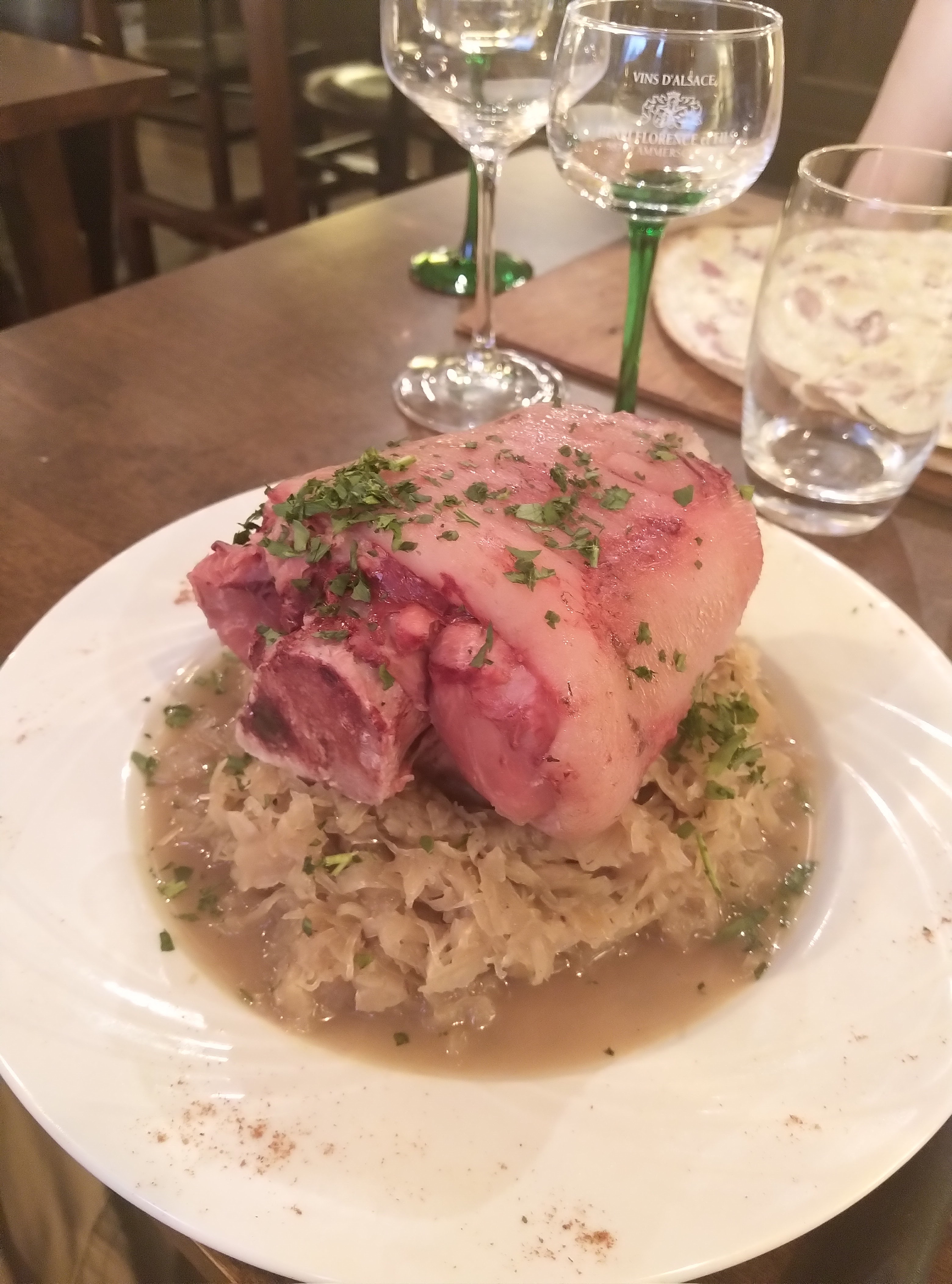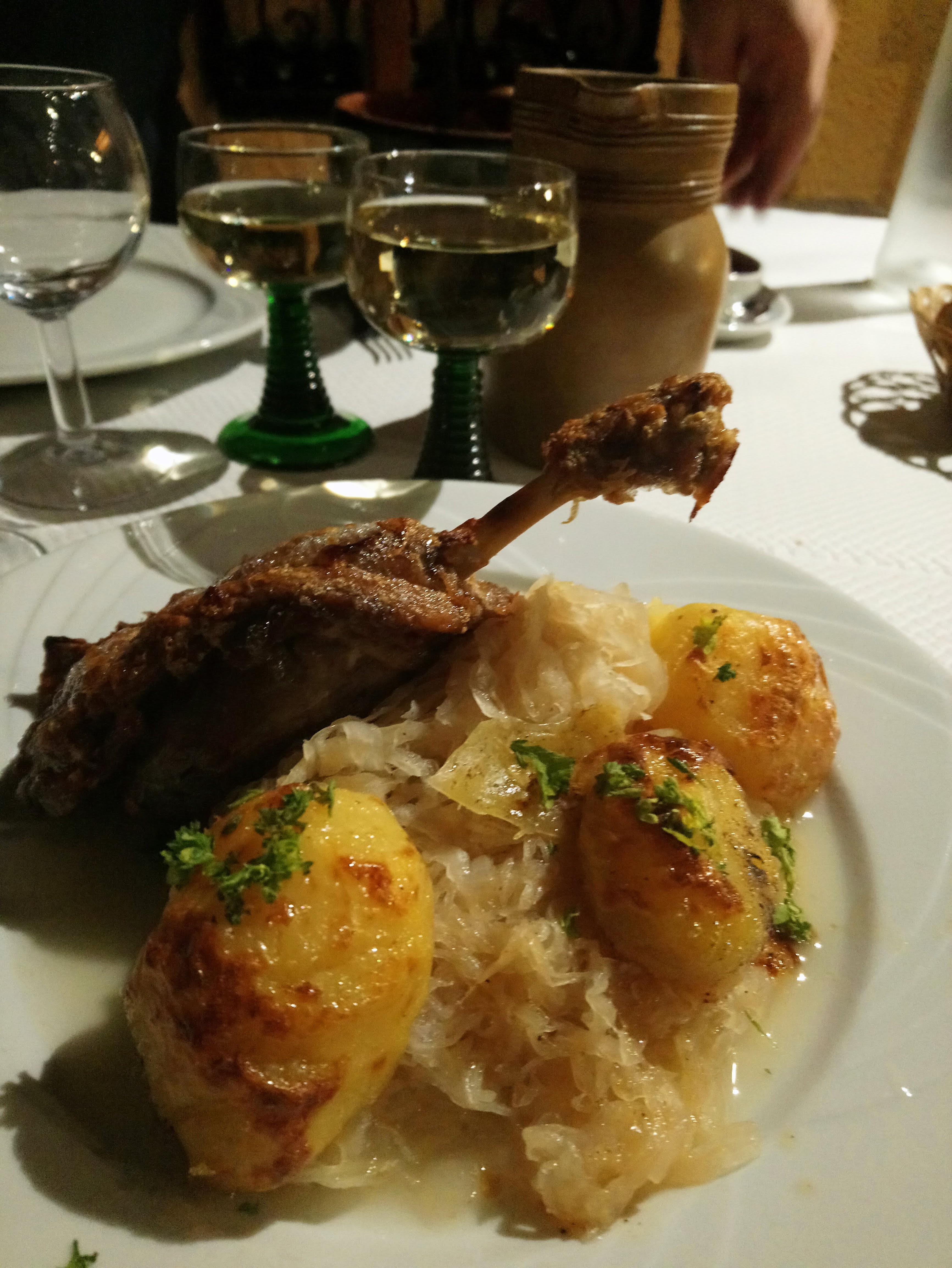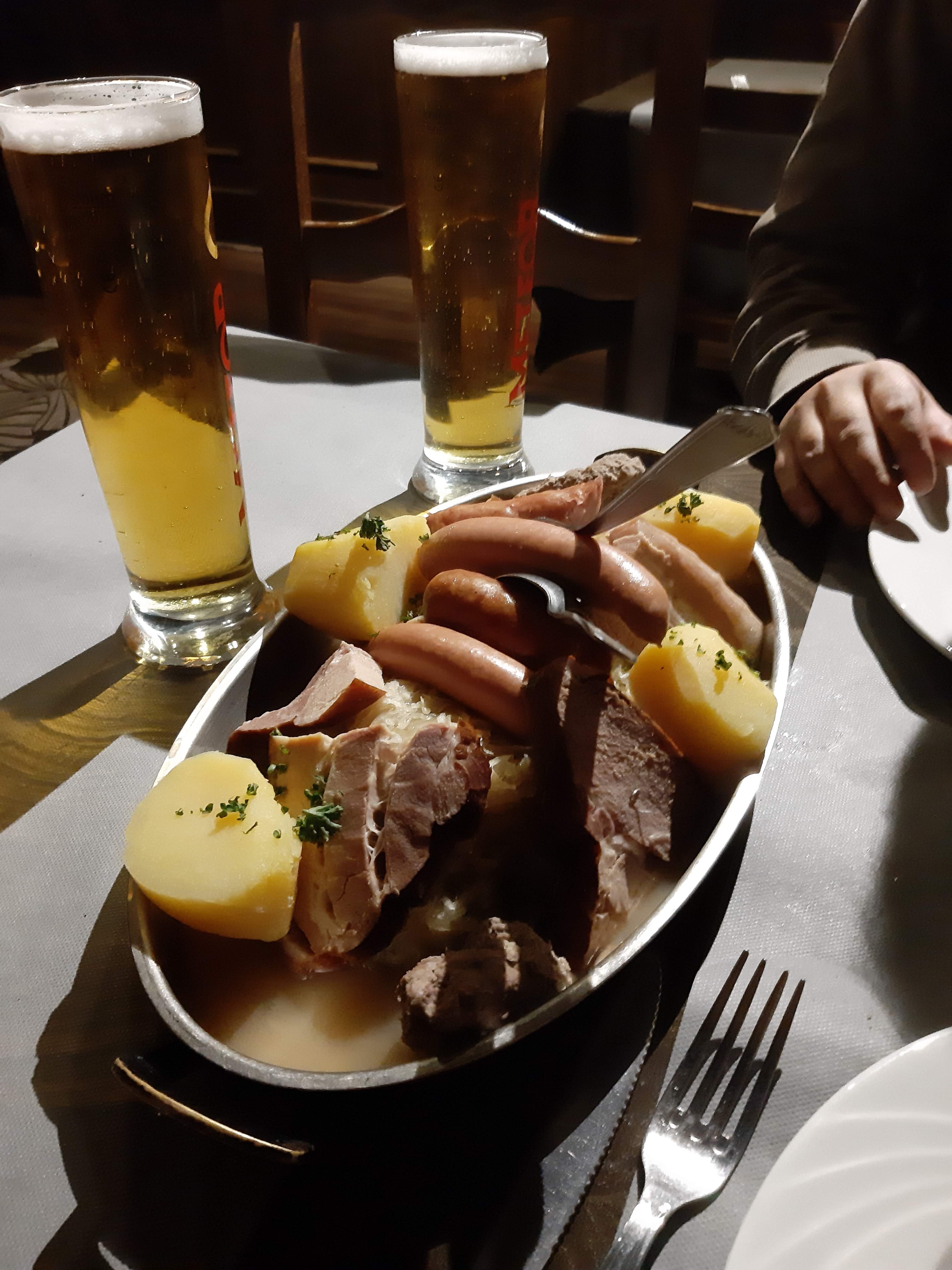 Nous sommes partis sans même manger les plats : un cordon bleu au veau industriel immangeable qui trempait dans une « sauce » indescriptible, des pommes sautées qui ne sont jamais arrivées malgré le discours du serveur et à la place des spazels réchauffées et grasses, une choucroute également immangeable, un pineau noir imbuvable. Bref : une catastrophe culinaire