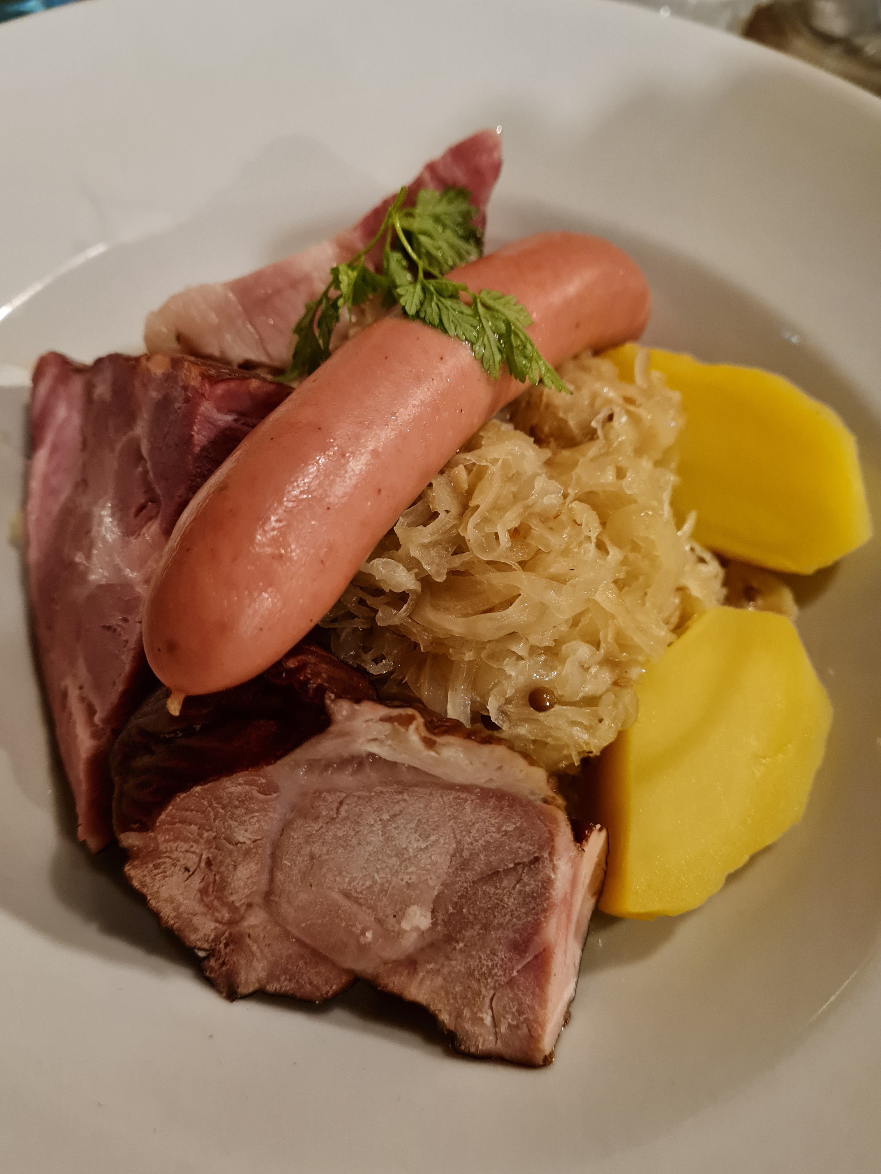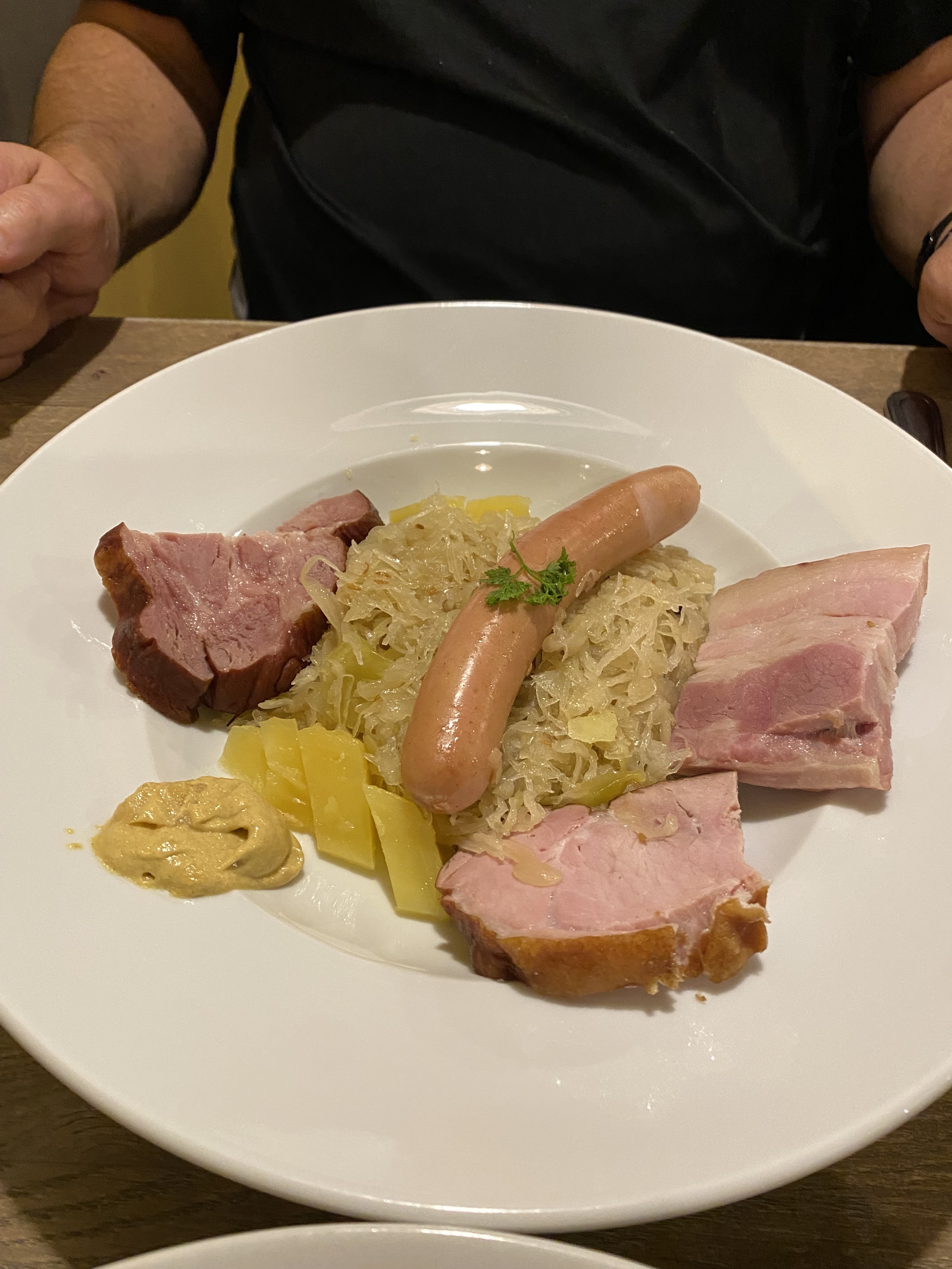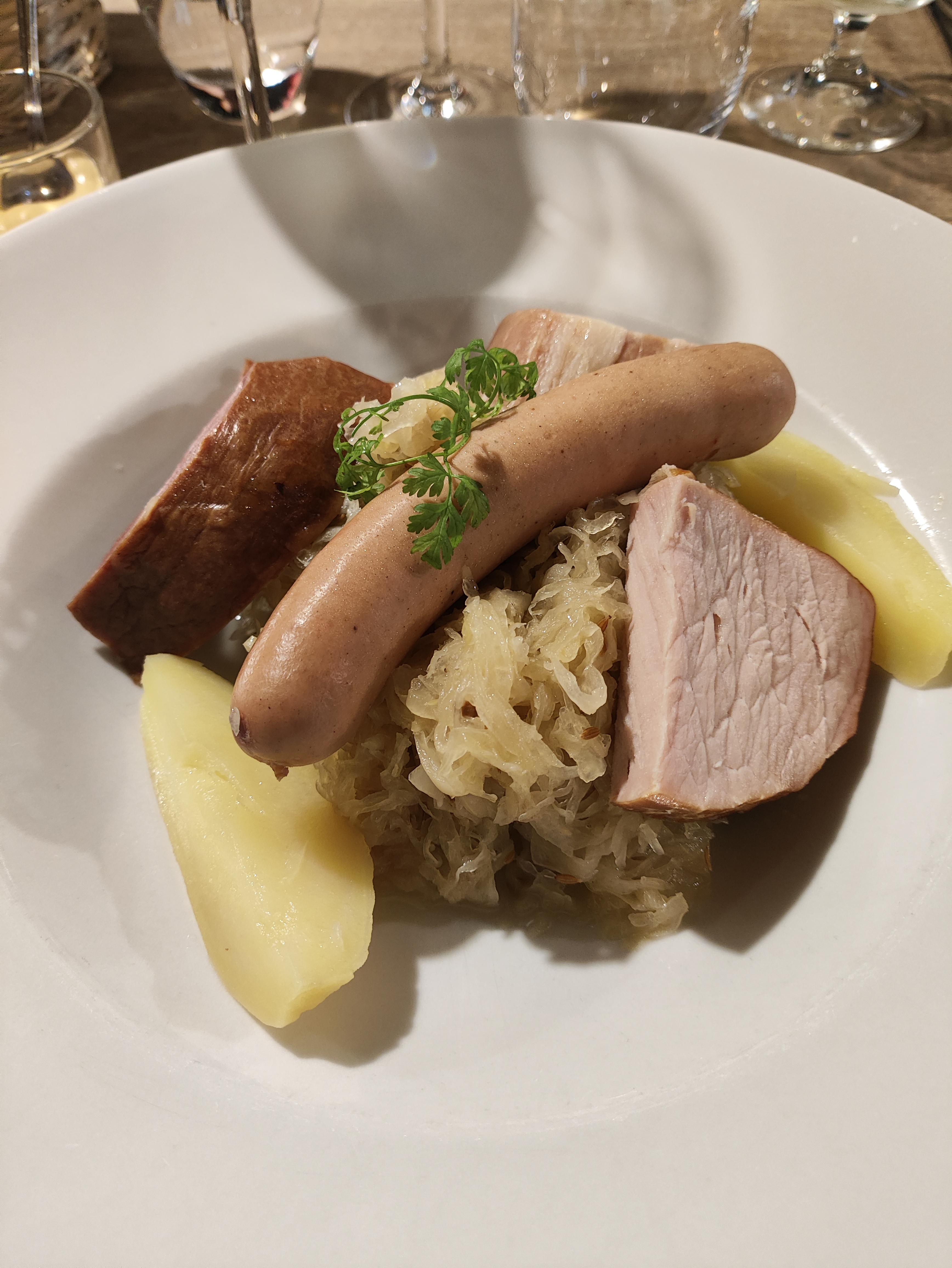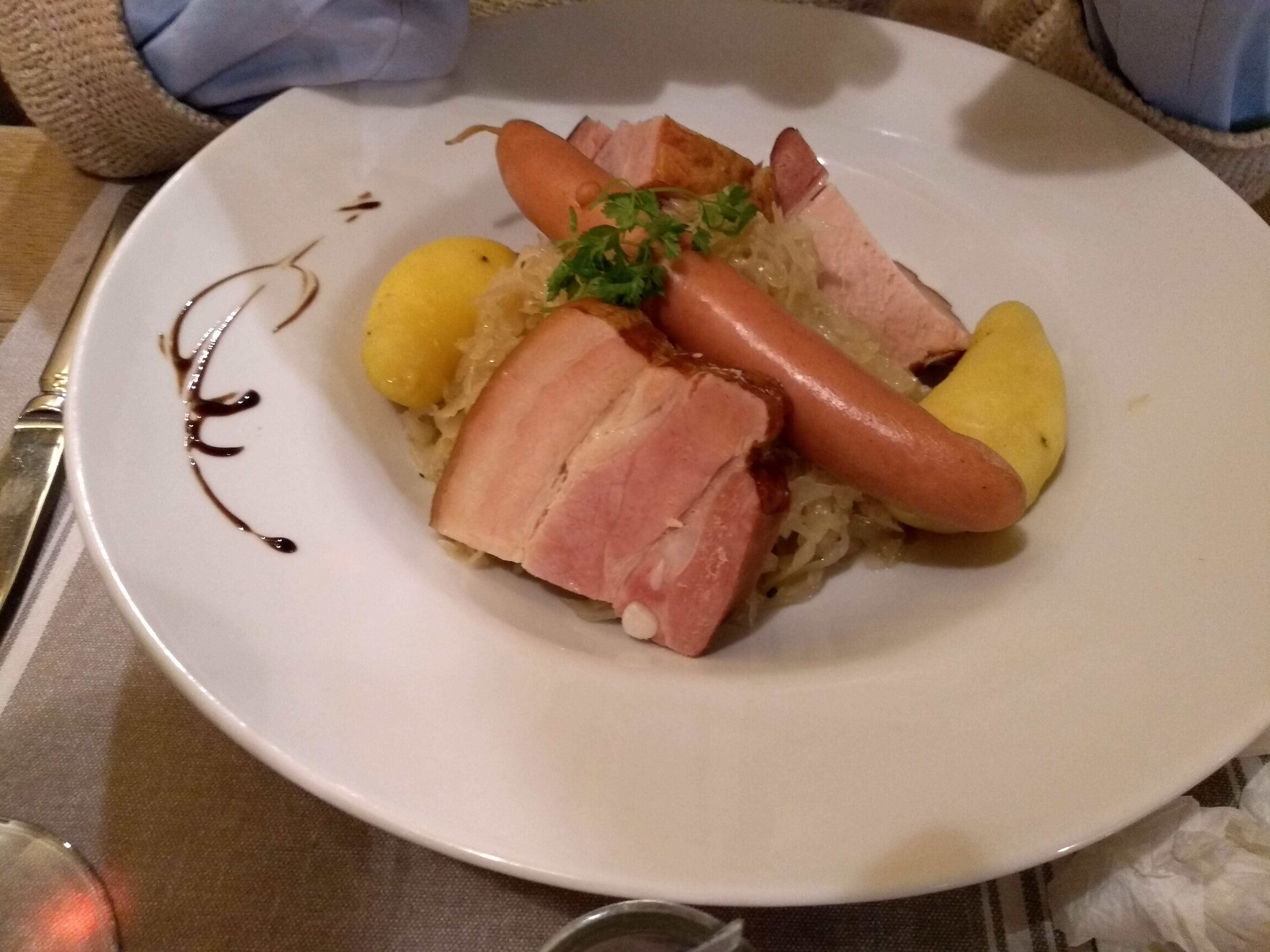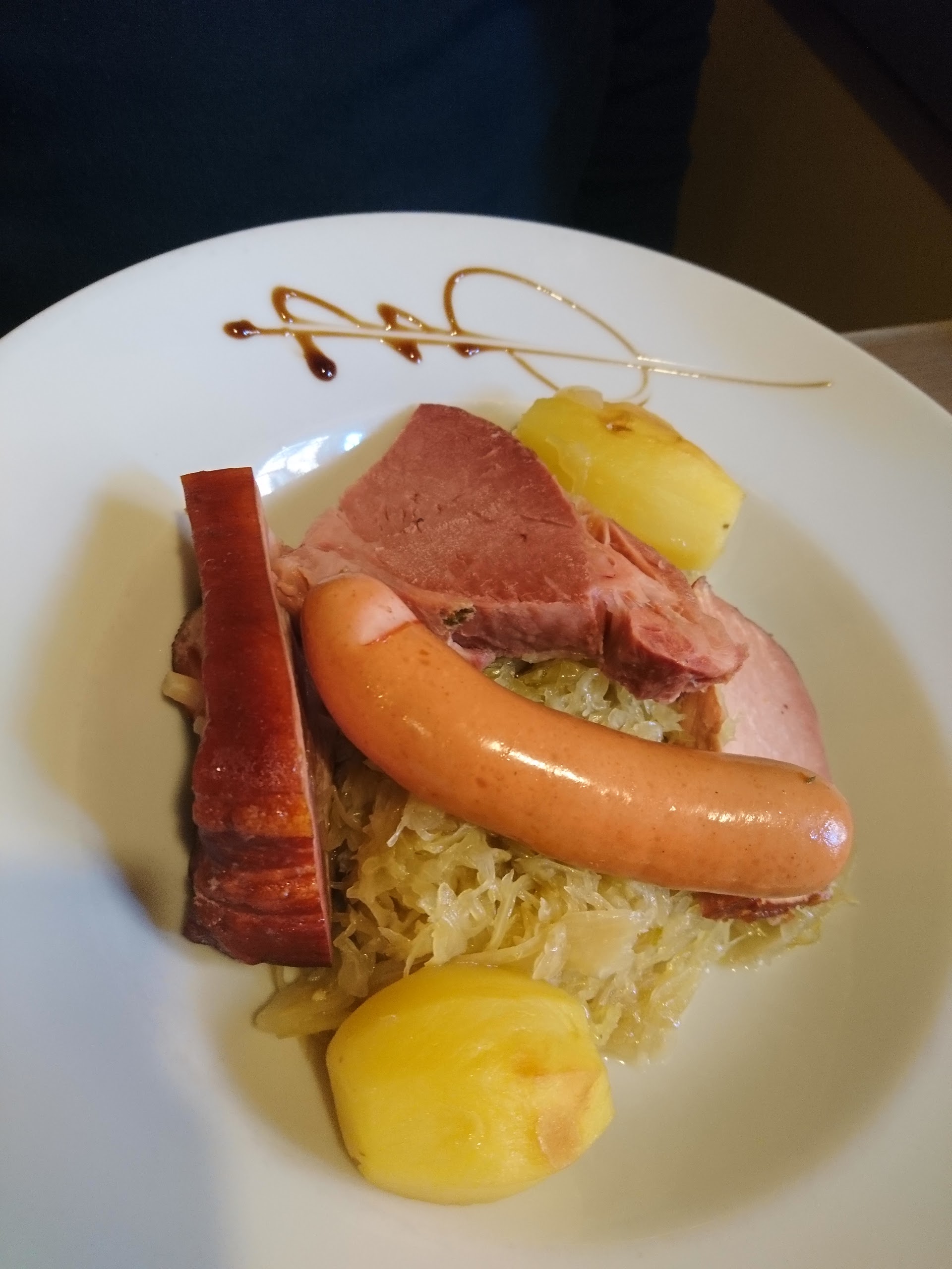 Une superbe choucroute aux 6 viandes. Pas si cher que ça finalement à 25€ par personne. Je ne regrette pas et je recommande