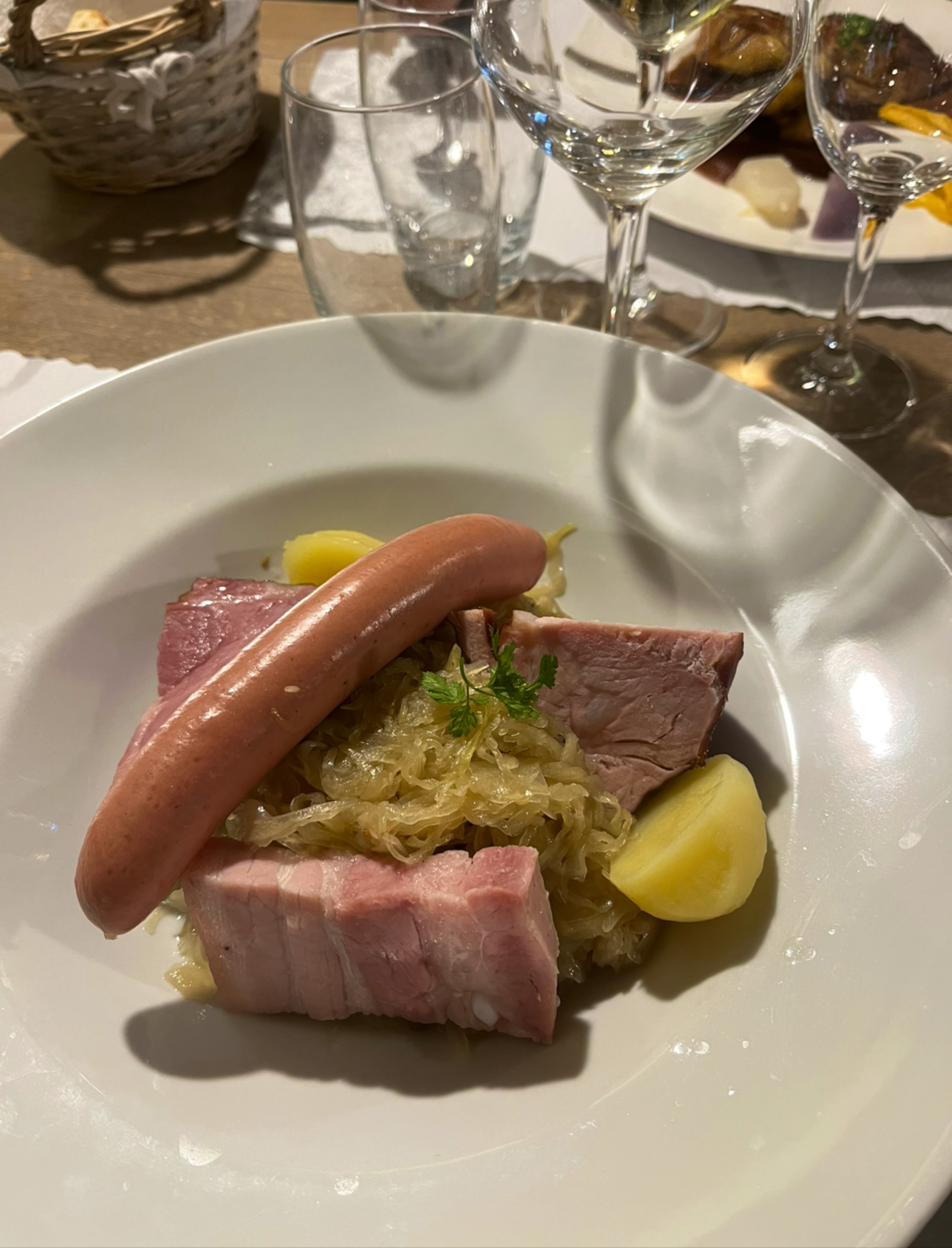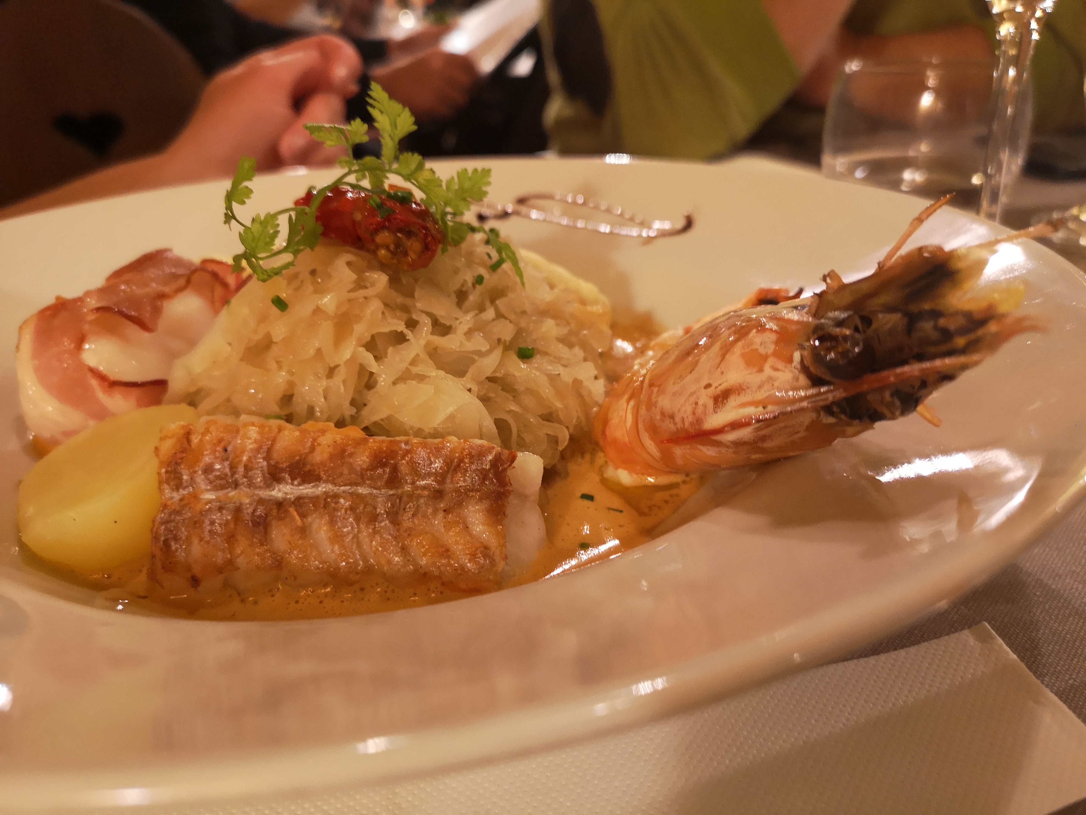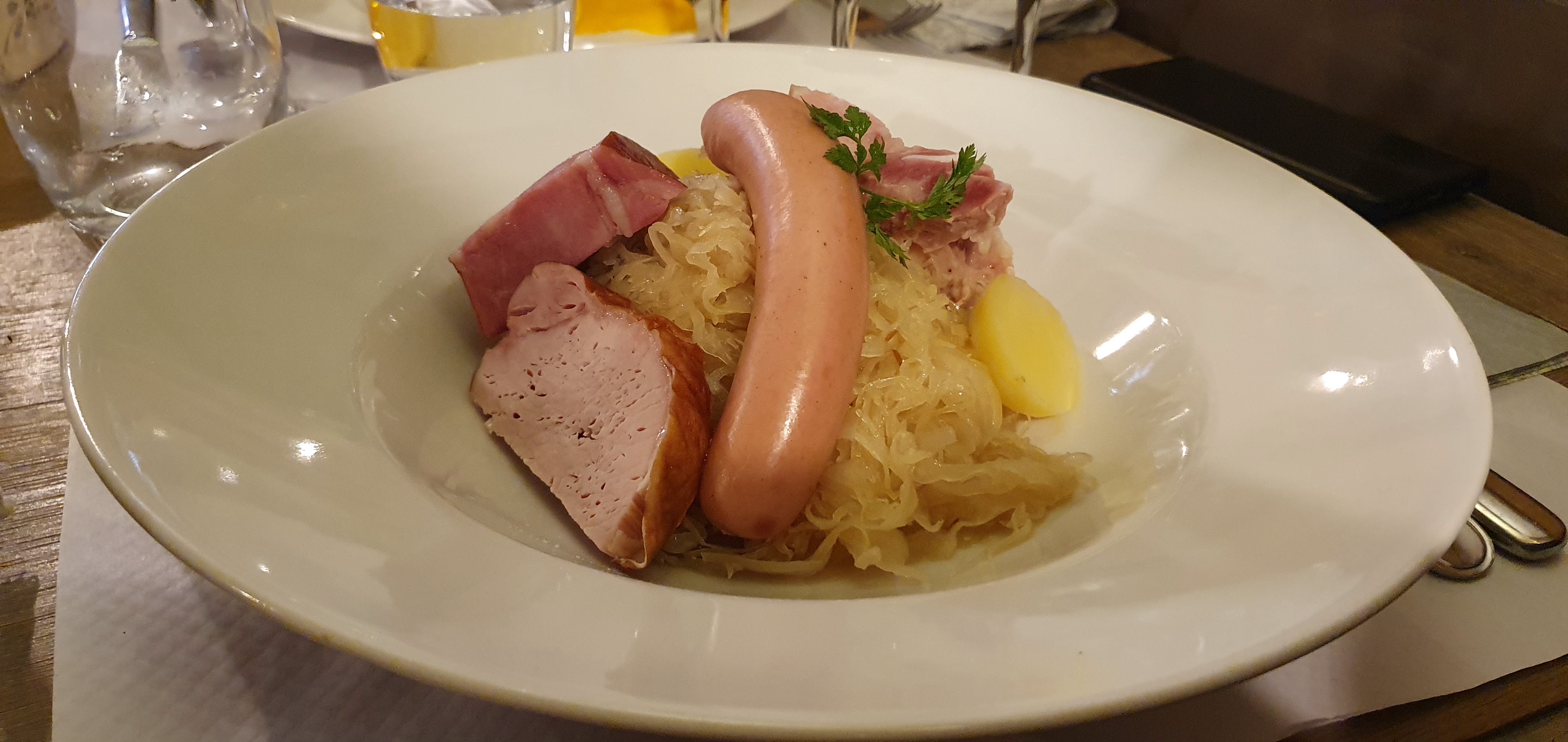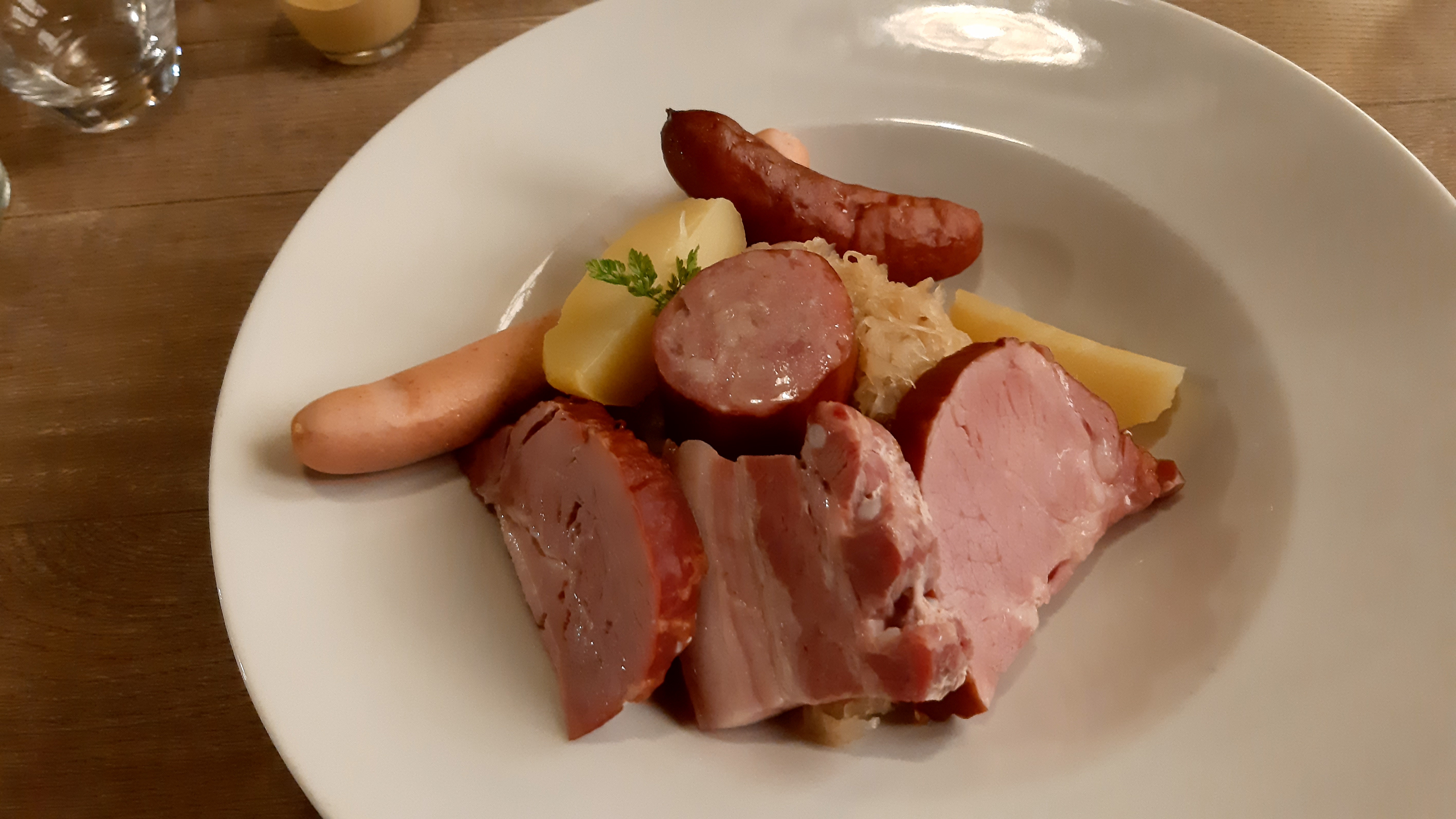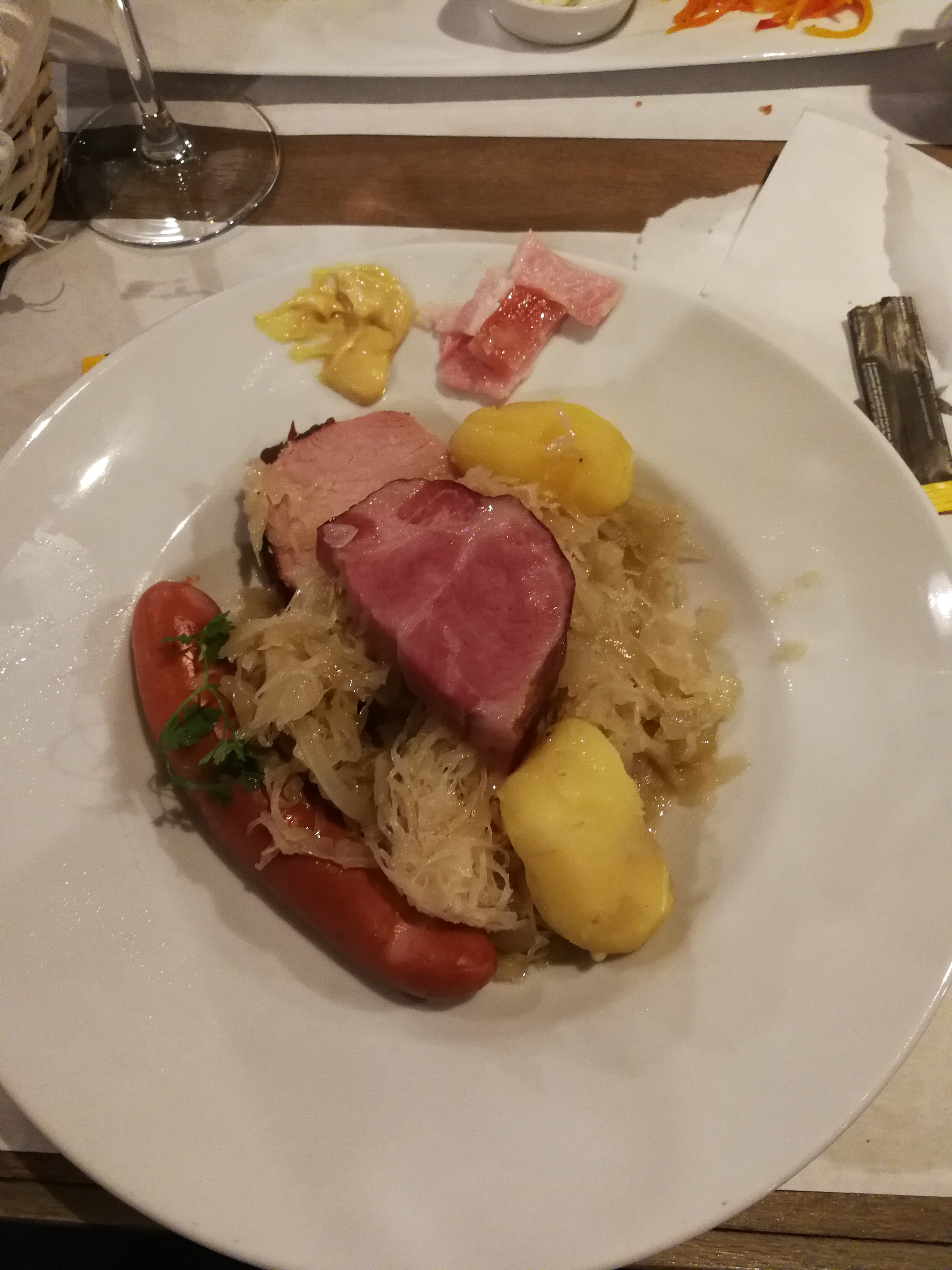 Une superbe choucroute aux 6 viandes. Pas si cher que ça finalement à 25€ par personne. Je ne regrette pas et je recommande