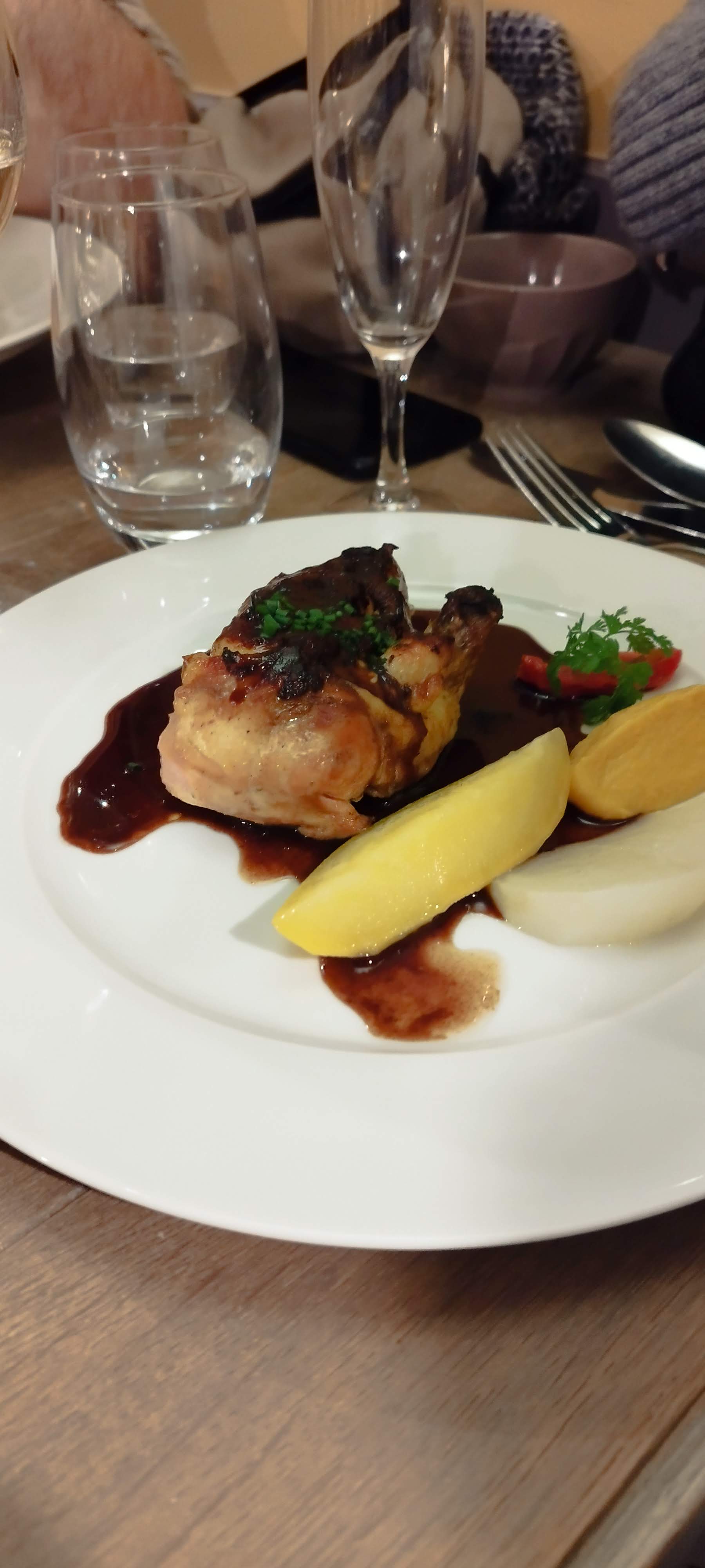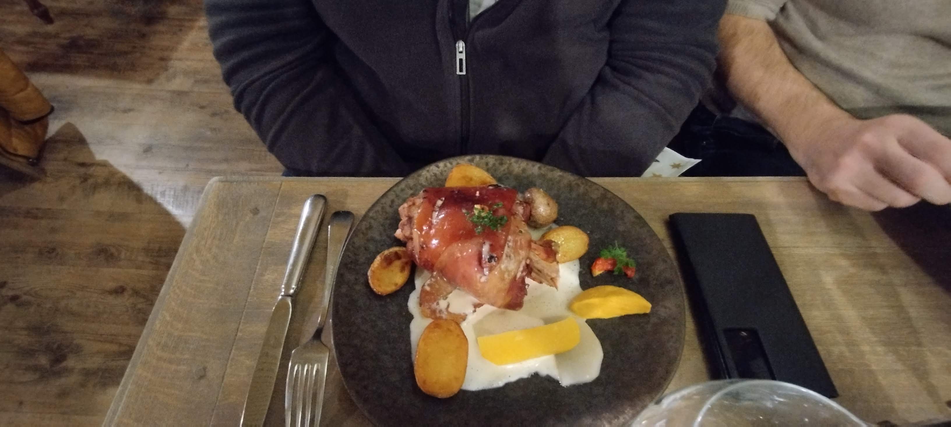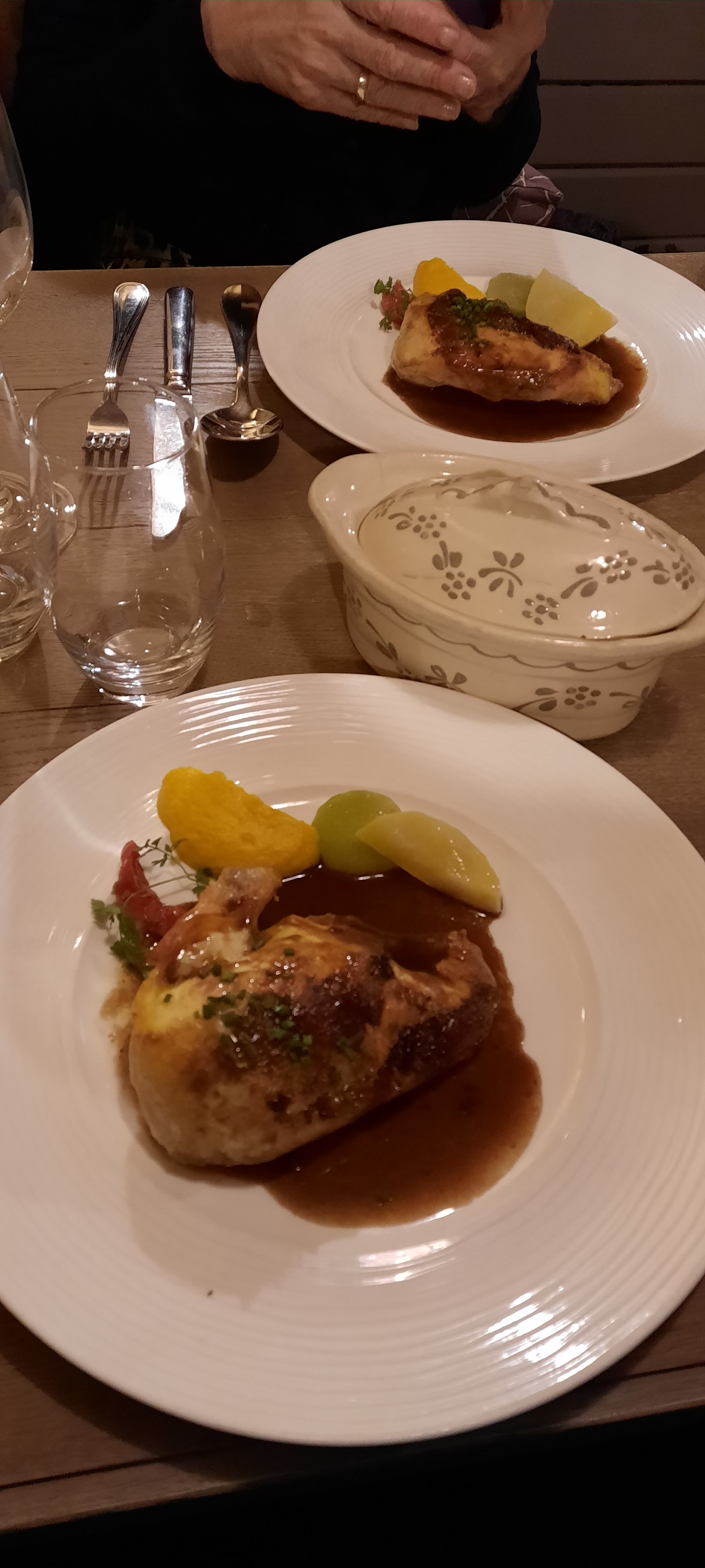 C'était très bon, mais très déçus du restaurant en période des fêtes de fin d'année... Pour un suprême de poulet, il ne faut pas avoir très faim, le jambonneau était très gras et la sauce au munster s'est perdue avec les 4 petites patates qui se battent en duel Puis pas de choix d'accompagnement.... Et pour un supplément salade (1portion), ils demandent 4 euros... Ce qui s'agit de la carte, il y a très très peu de choix comparé à la carte le reste de l'année Puis un moelleux au chocolat à 12 euros, je trouve ça très cher... En période des fêtes de fin d'année, je trouve ce restaurant attrape-touristes, ce qui est très dommage pour un restaurant alsacien