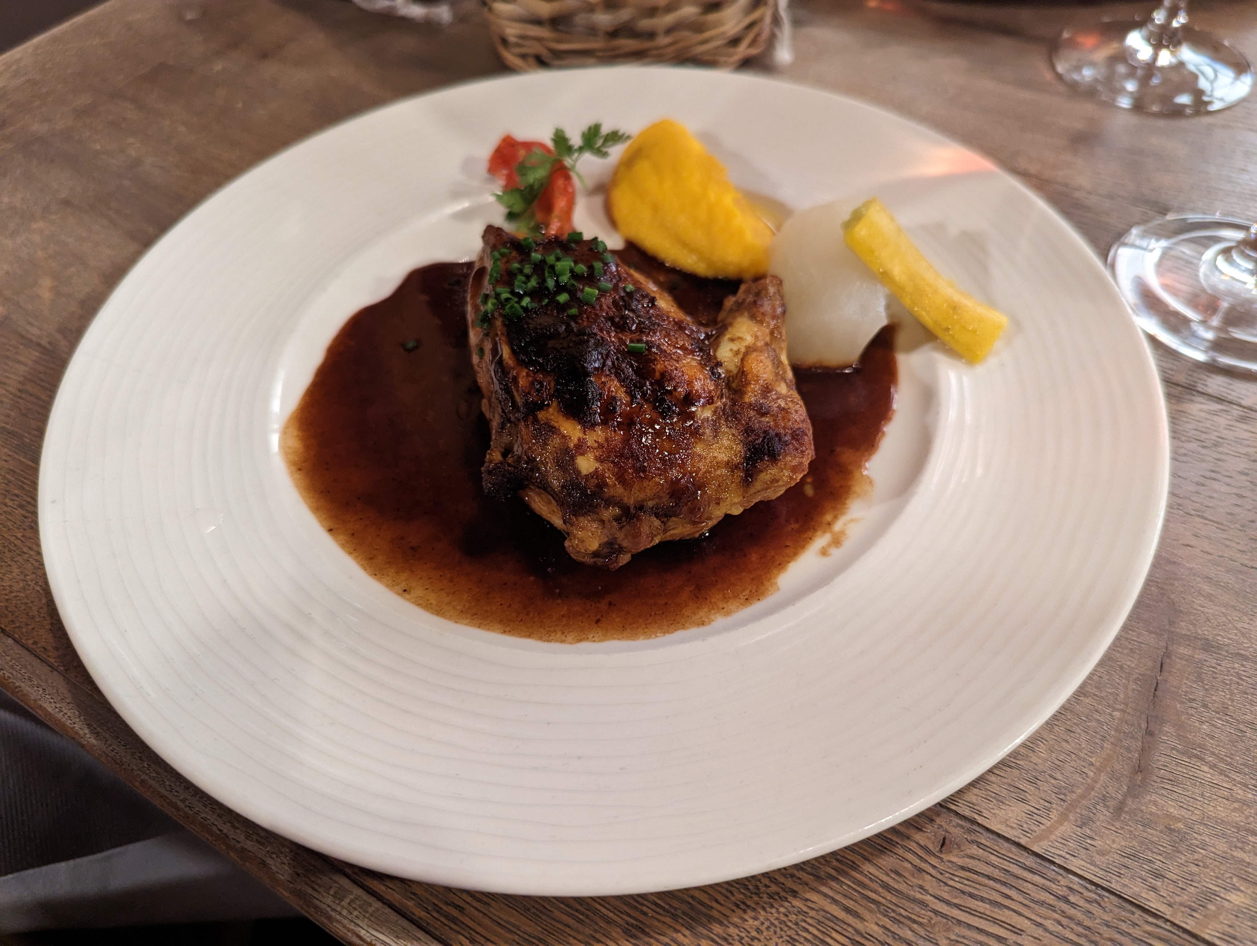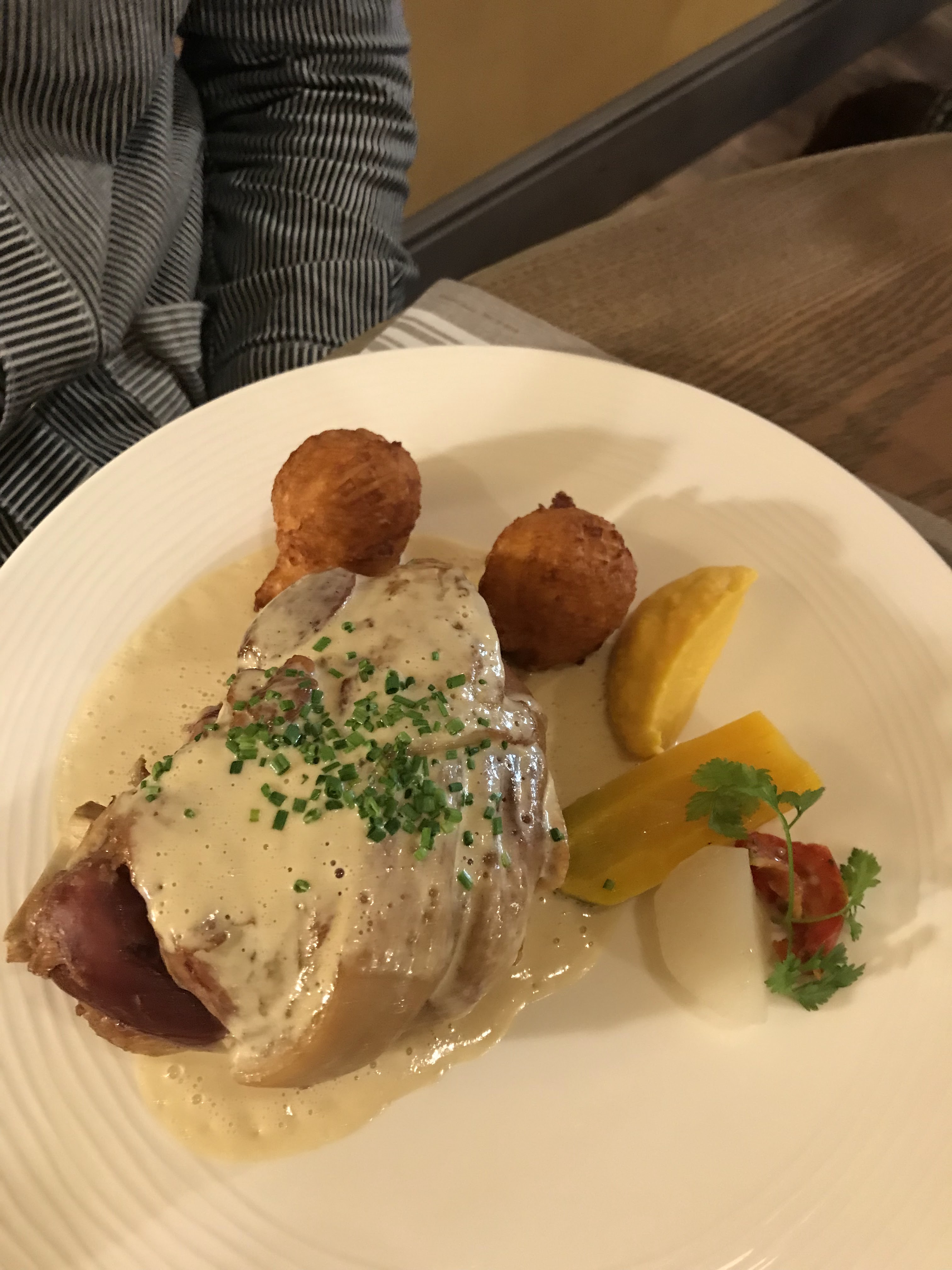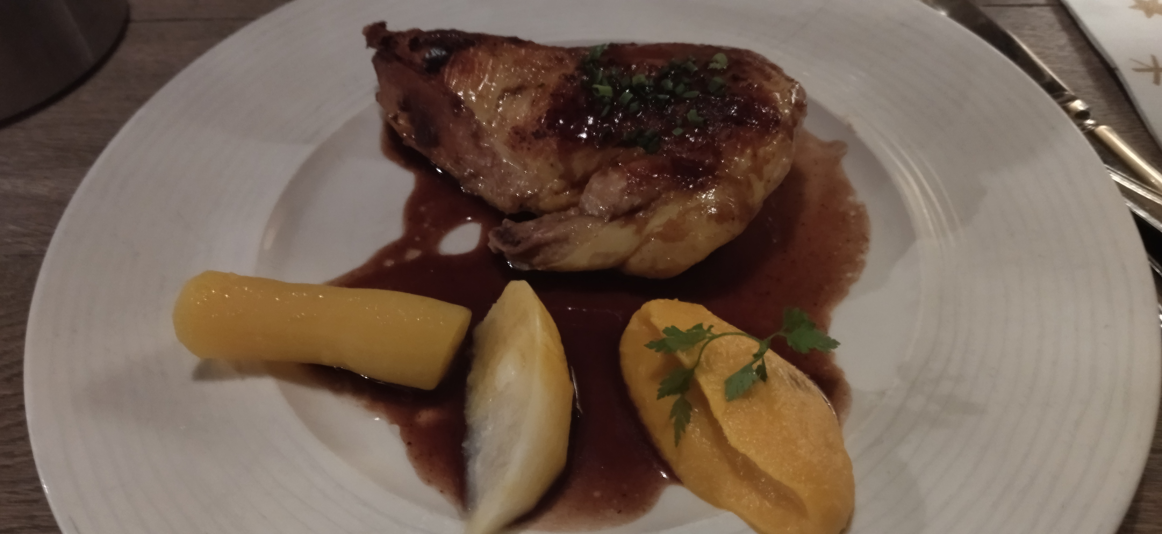 C'était très bon, mais très déçus du restaurant en période des fêtes de fin d'année... Pour un suprême de poulet, il ne faut pas avoir très faim, le jambonneau était très gras et la sauce au munster s'est perdue avec les 4 petites patates qui se battent en duel Puis pas de choix d'accompagnement.... Et pour un supplément salade (1portion), ils demandent 4 euros... Ce qui s'agit de la carte, il y a très très peu de choix comparé à la carte le reste de l'année Puis un moelleux au chocolat à 12 euros, je trouve ça très cher... En période des fêtes de fin d'année, je trouve ce restaurant attrape-touristes, ce qui est très dommage pour un restaurant alsacien