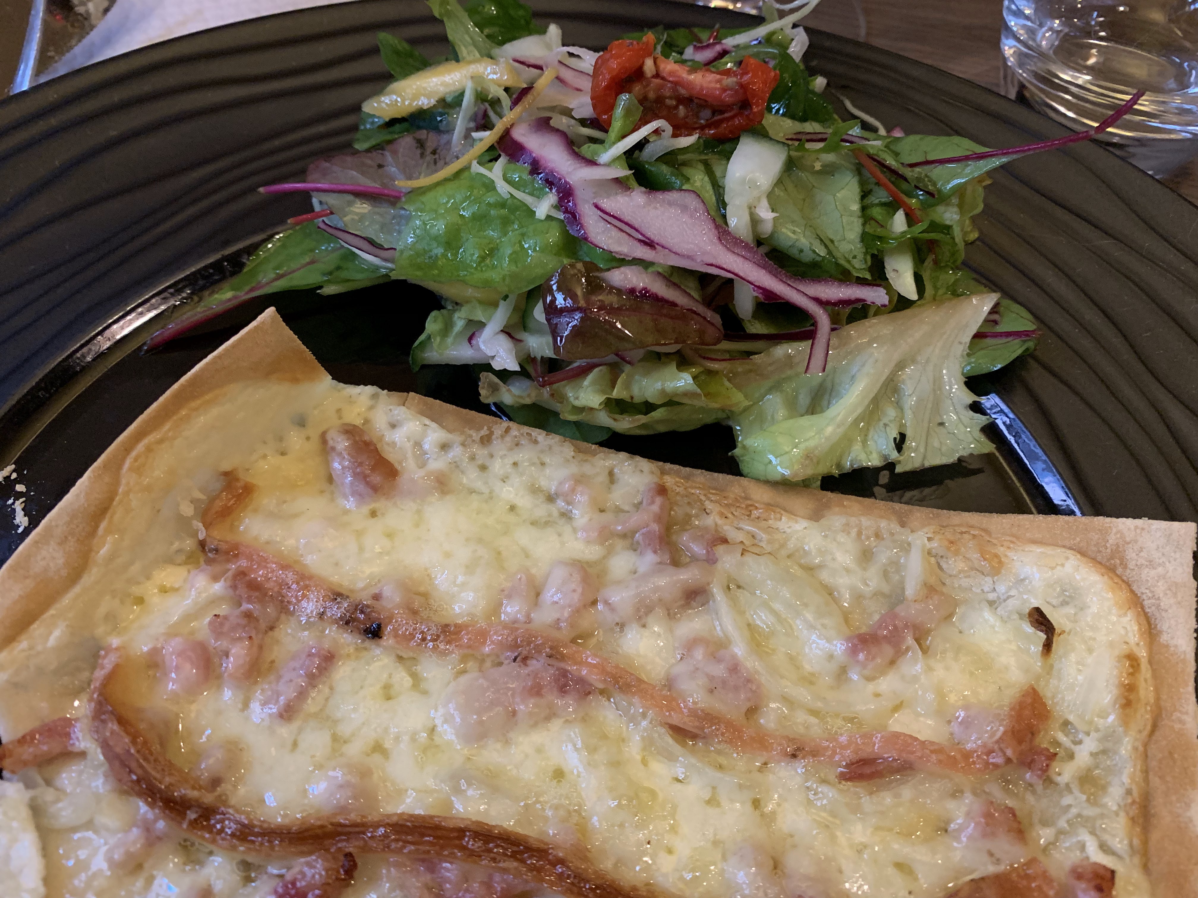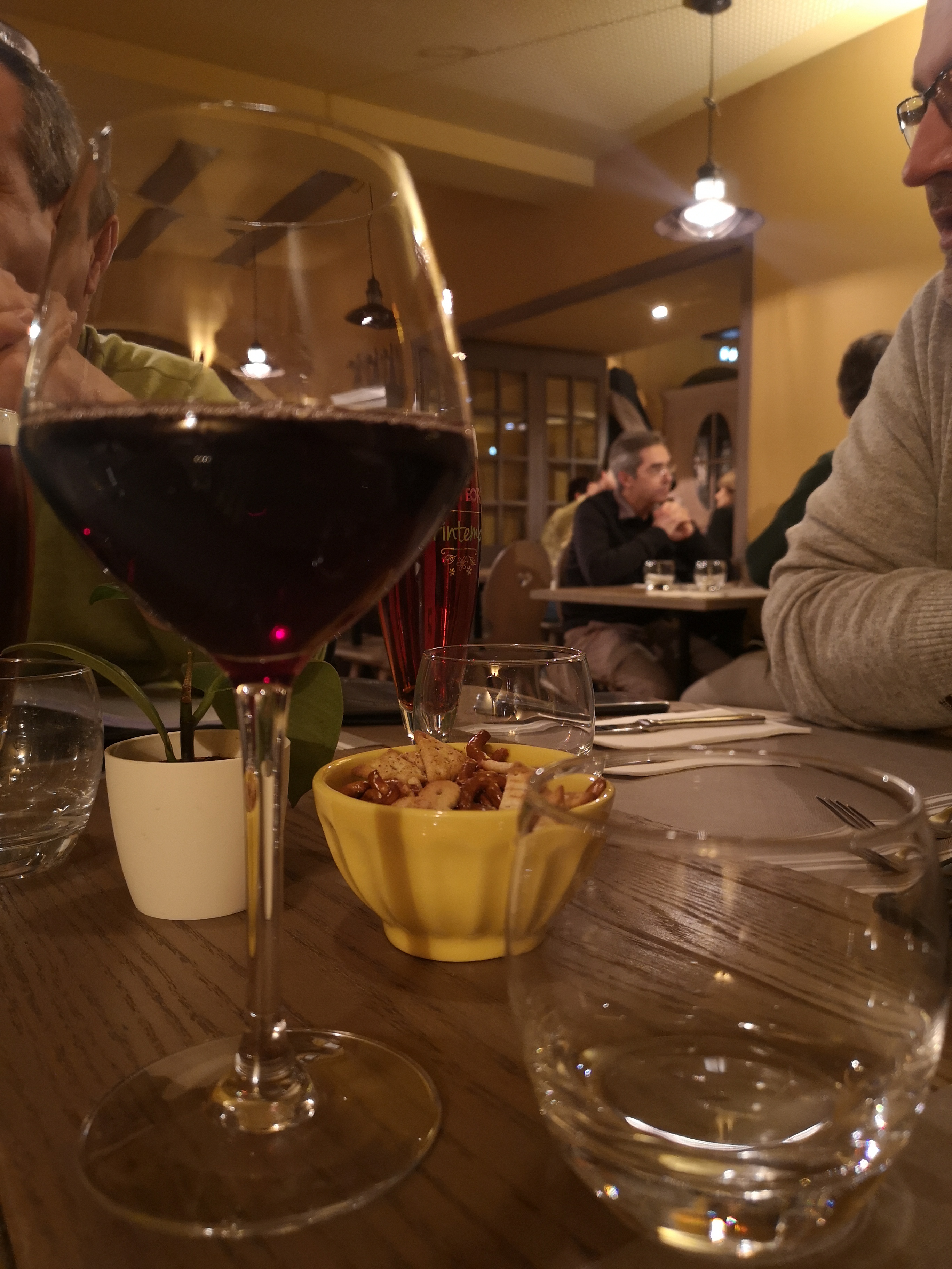Diner en couple. Réservation obligatoire un samedi soir. Cuisine délicieuse : mini tarte flambée croustillante et bien chaude, les cuissons parfaites du jambonneau et du suprême pour des portions généreuses.