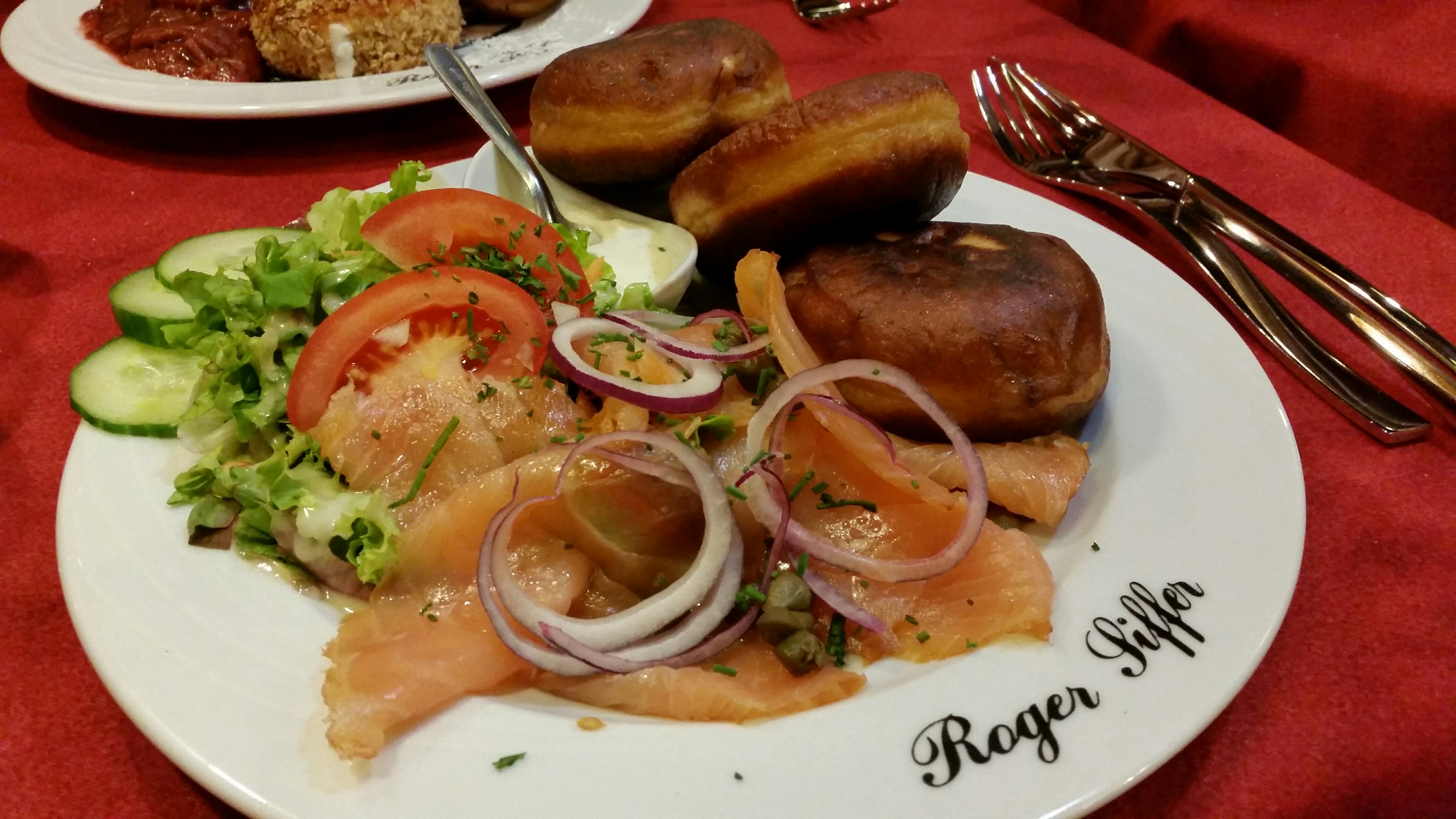 Très fâchée… notre table a été rajouté… moi même, j’avais un banc derrière moi qui m’empêchait de bouger… j’ai due mettre la chaise derrière travers pour arriver à m’assoir… quand à ma voisine, elle était coincée de même par la table d’à côté… de plus, nous avons attendu très très longtemps pour avoir les desserts, donc nous avons due les manger en 5 minutes (il y avait des glaces), ce qui a fait que l’on était les derniers au spectacle et notre groupe de 6 à été dispatché dans la salle… j’ai également demandé des légumes avec les rognons et spaetzele, cela m’a été facturé 2,50€… niveau équilibre de l’assiette, on repassera… rien a dire sur la cuisine en elle même .