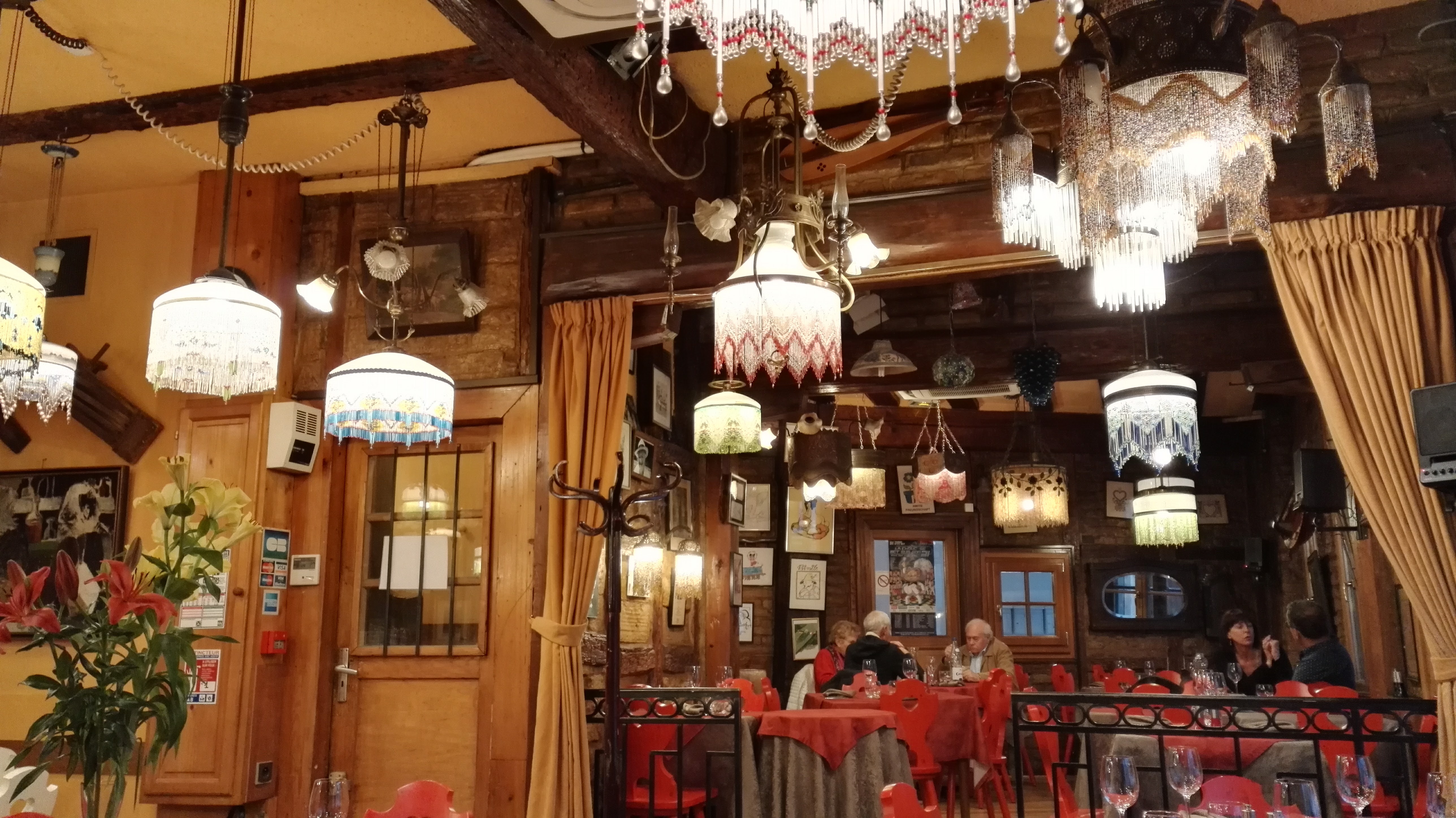 Cuisine alsacienne, sympa et goûteuse. Service topissime : Efficace et très agréable, belle performance pour que tout le monde soit à l'heure au spectacle. BRAVO ! et MERCI. Cadre chaleureux, agrémenté d'une magnifique collection de lampes.