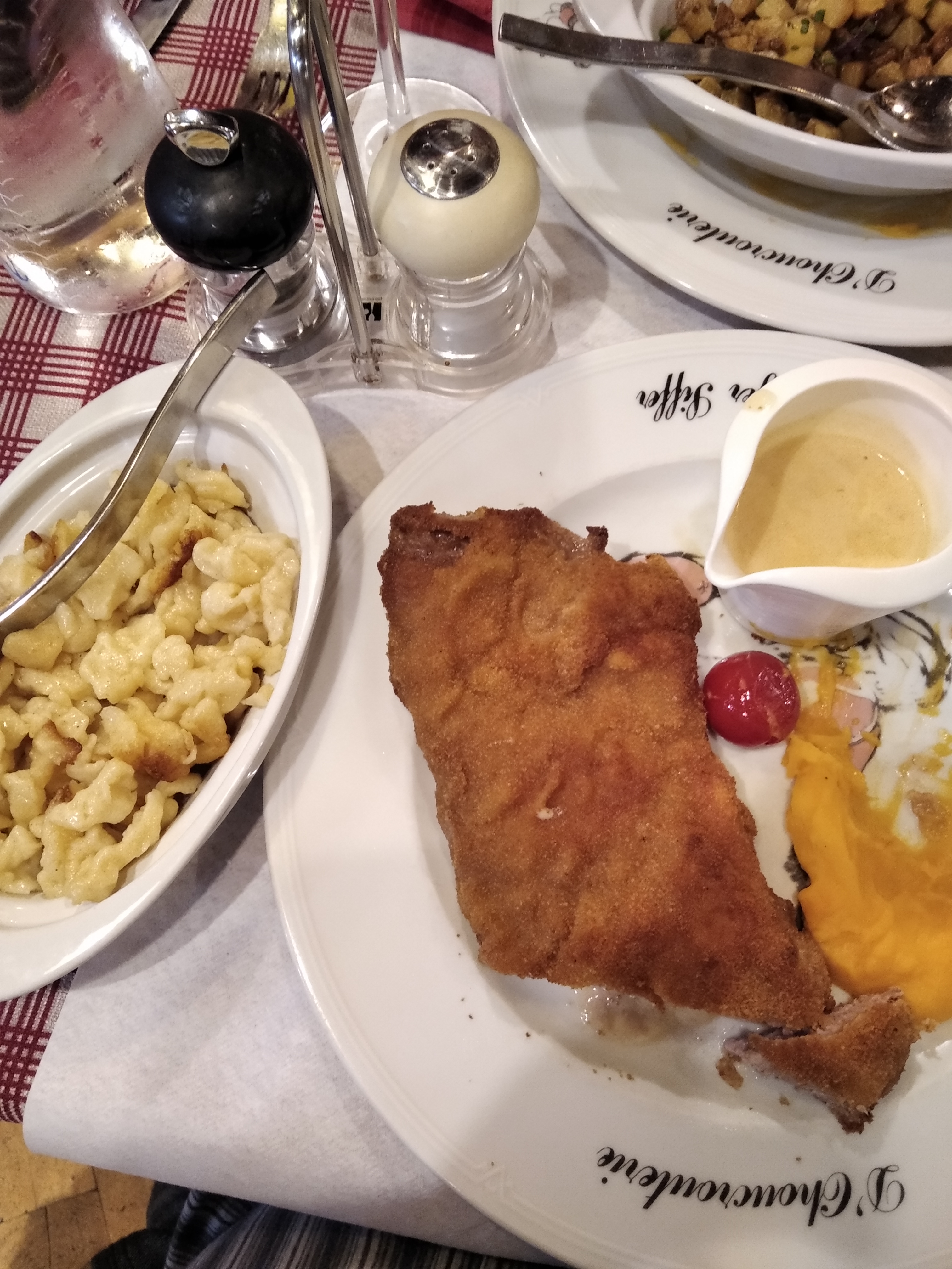 Notre table a bien aimé les cordons bleus mais trouver que les spatzles étaient insuffisants. Moi et une amie avons pris des Fleischkiechle que j'ai trouvé un peu trop sèche. Service et ambiance impeccable