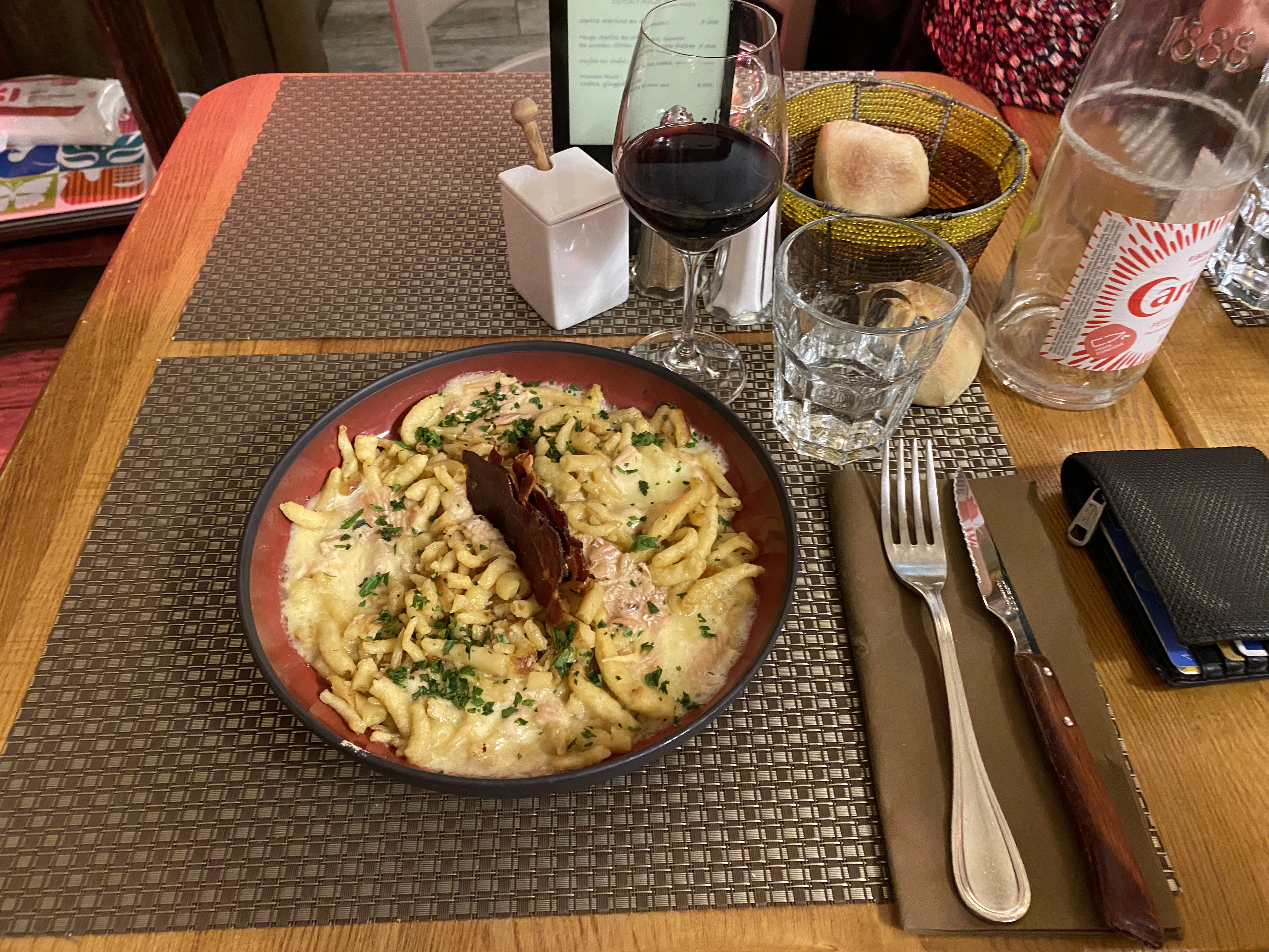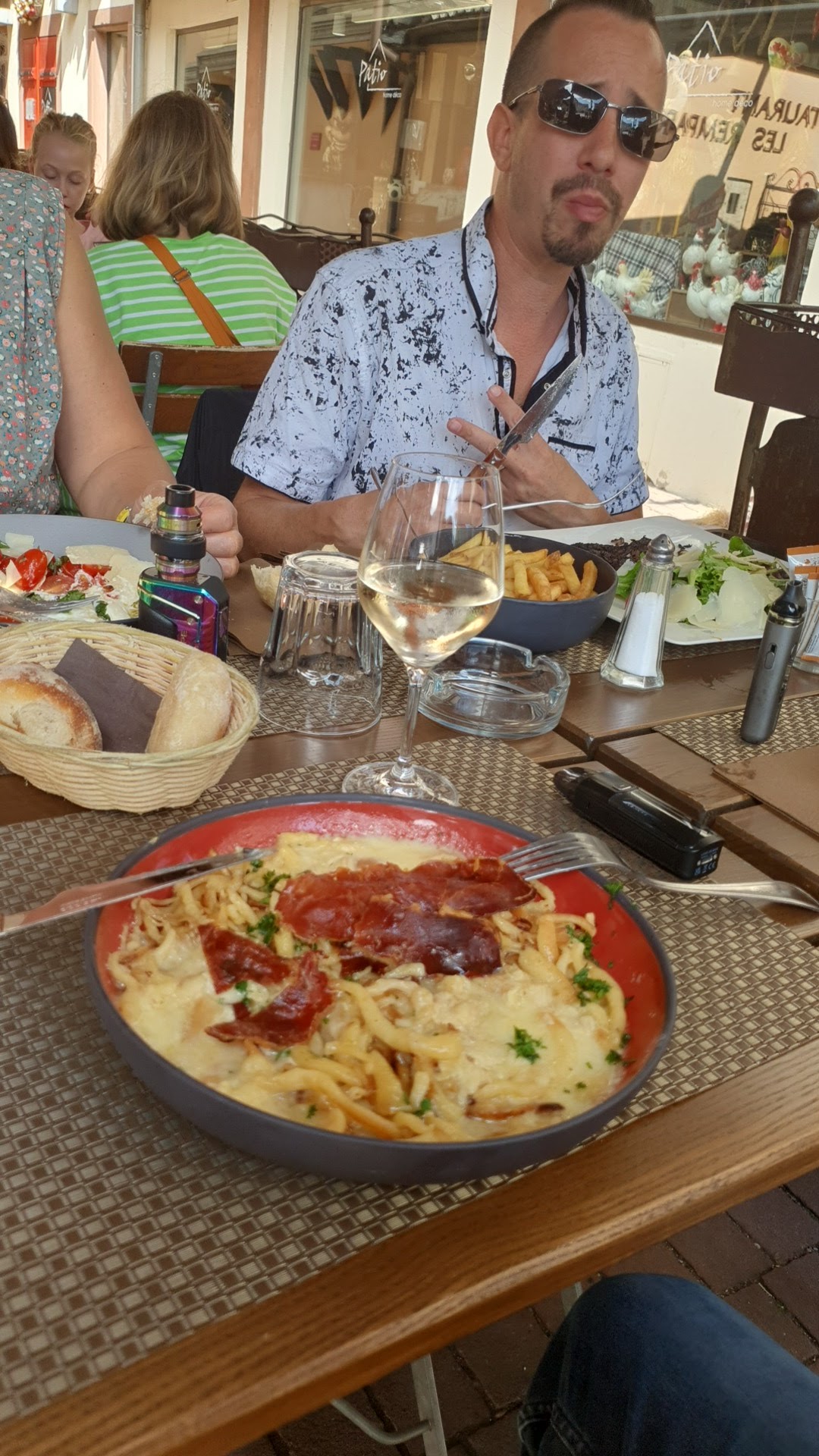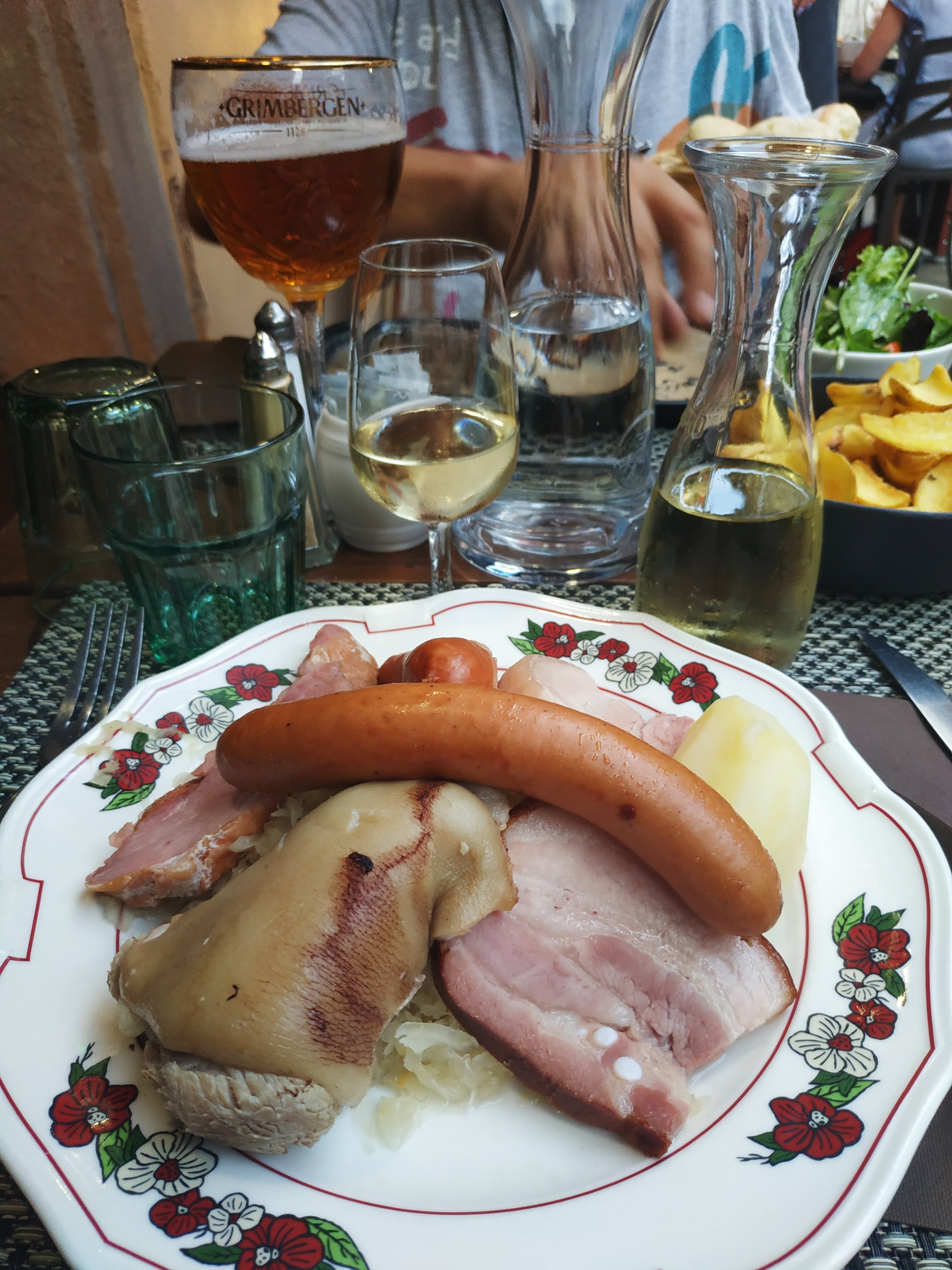 Restaurant de la vieille ville. Beaucoup de monde donc un peu à l’étroit. Service sympa. Menu alsacien fort copieux. J’aurais préféré que la peau du jarret soit grillée mais sinon : bon. Tarif compris dans notre nuitée d’hôtel.