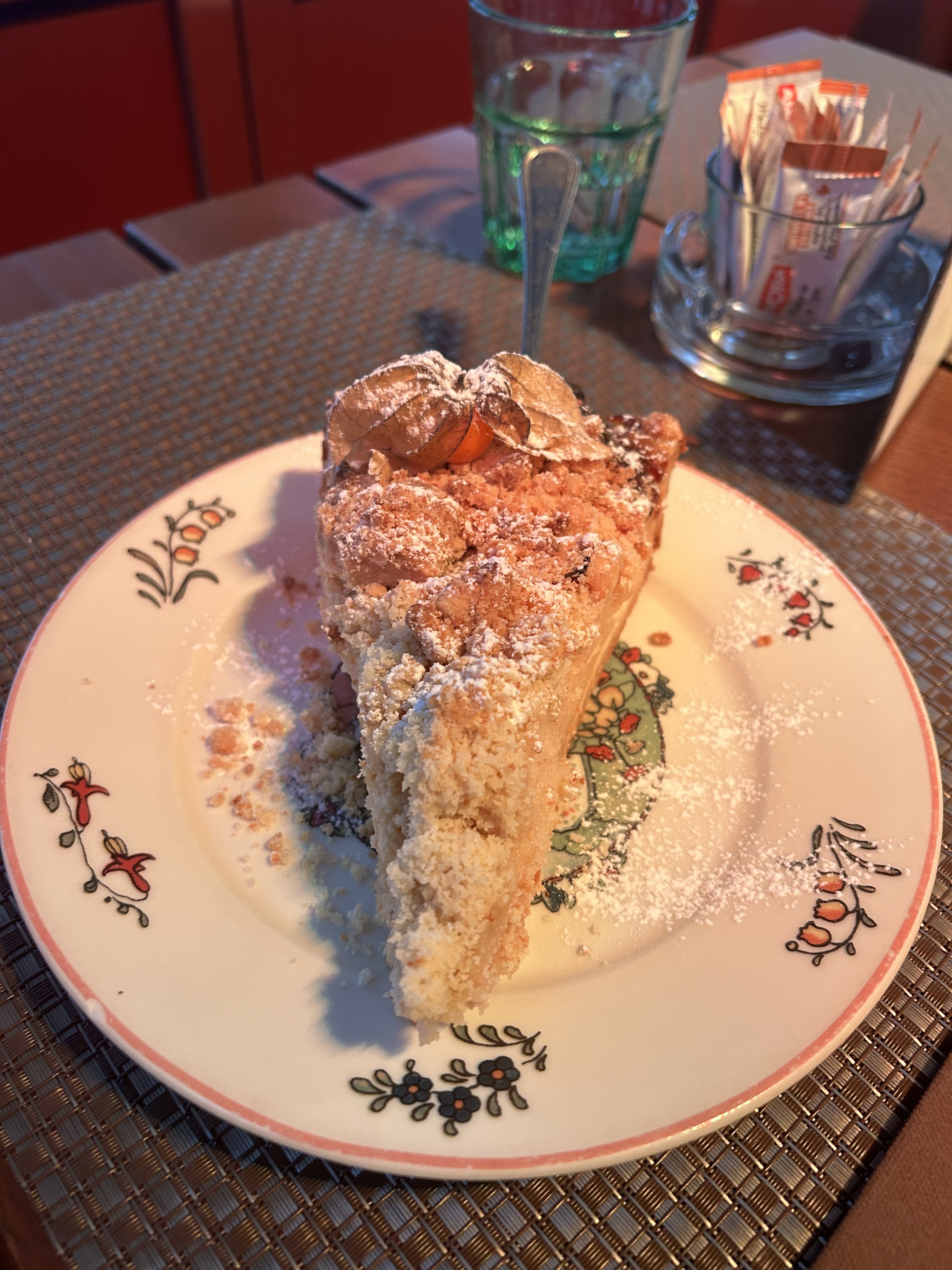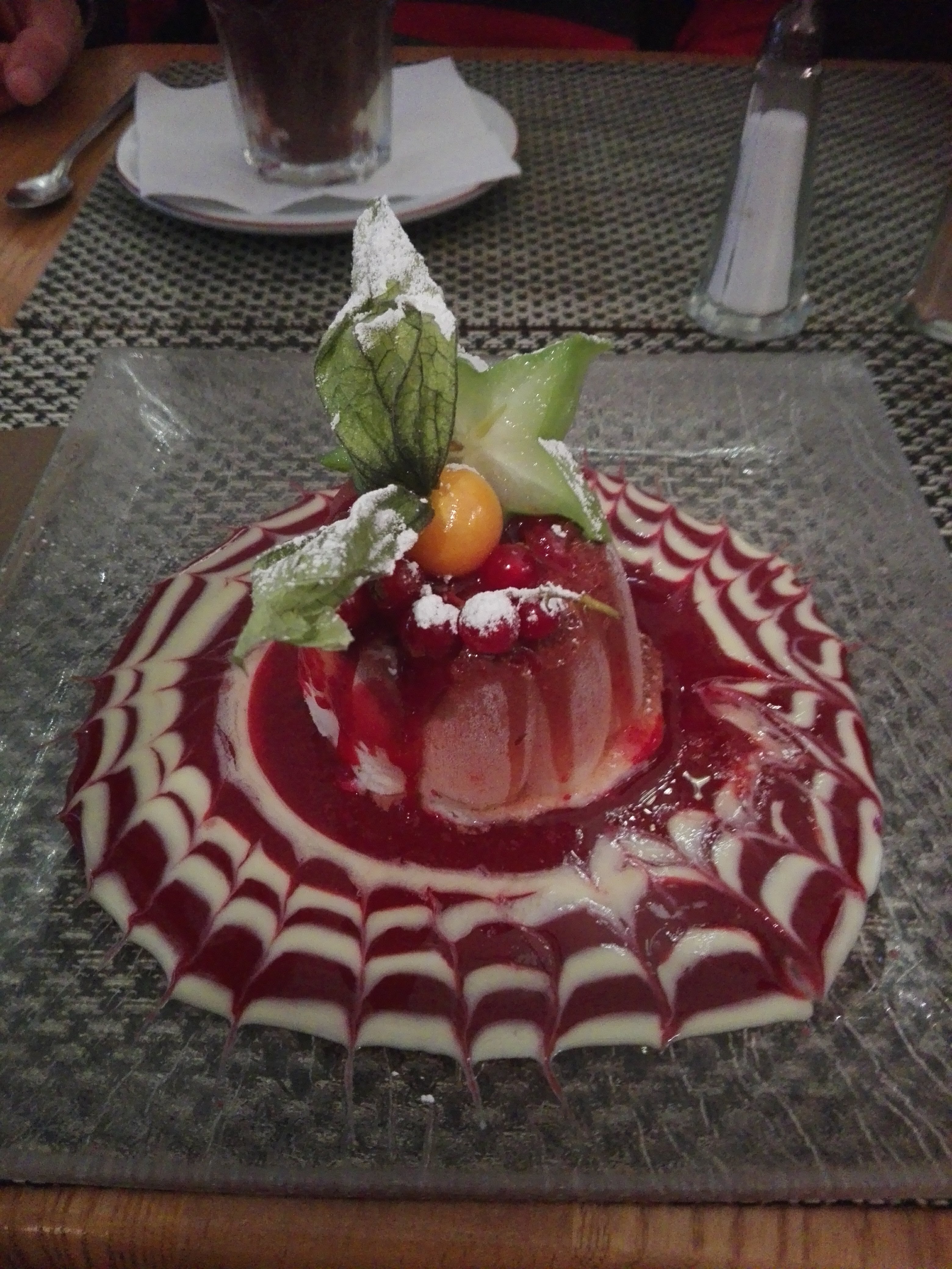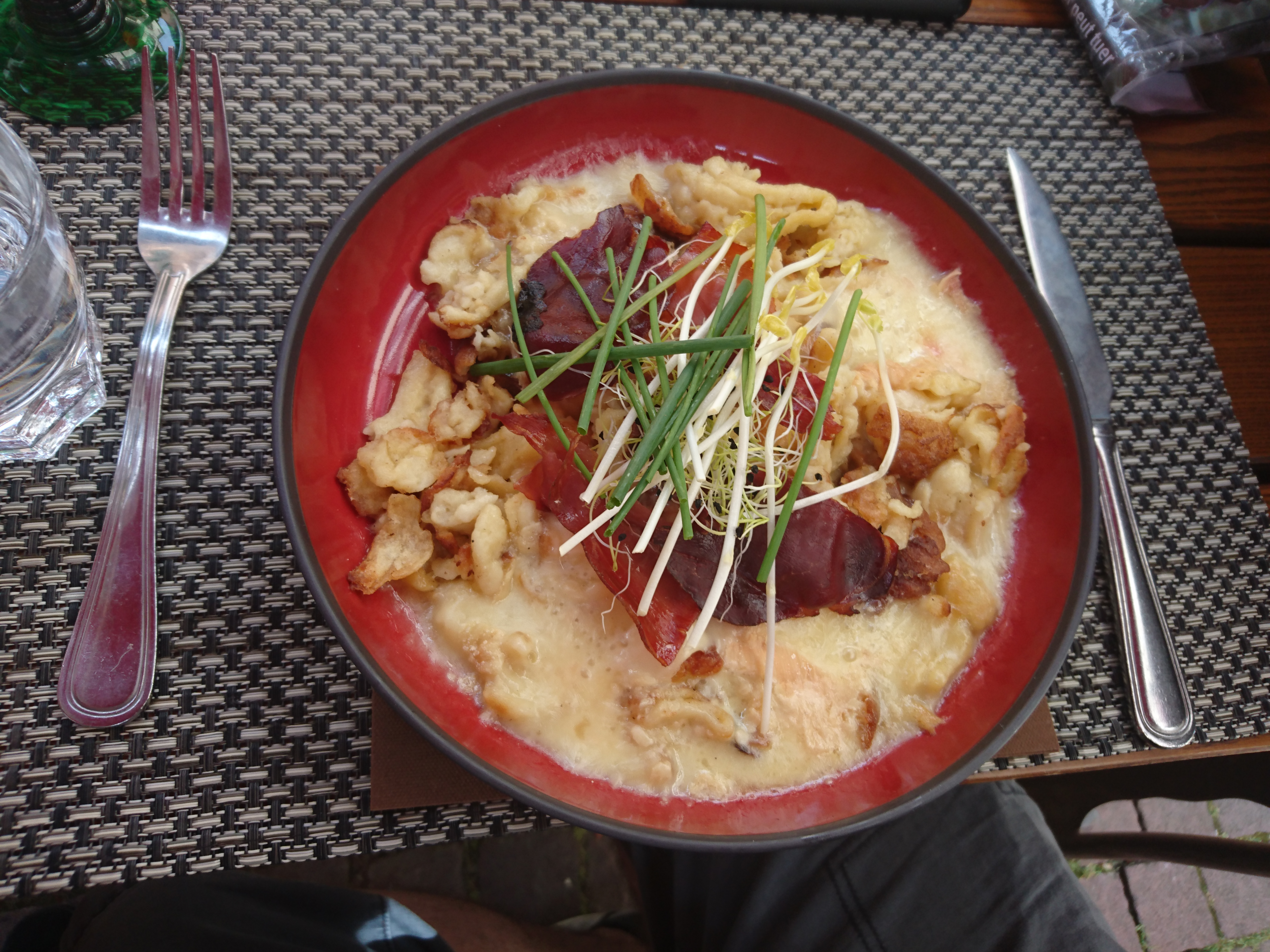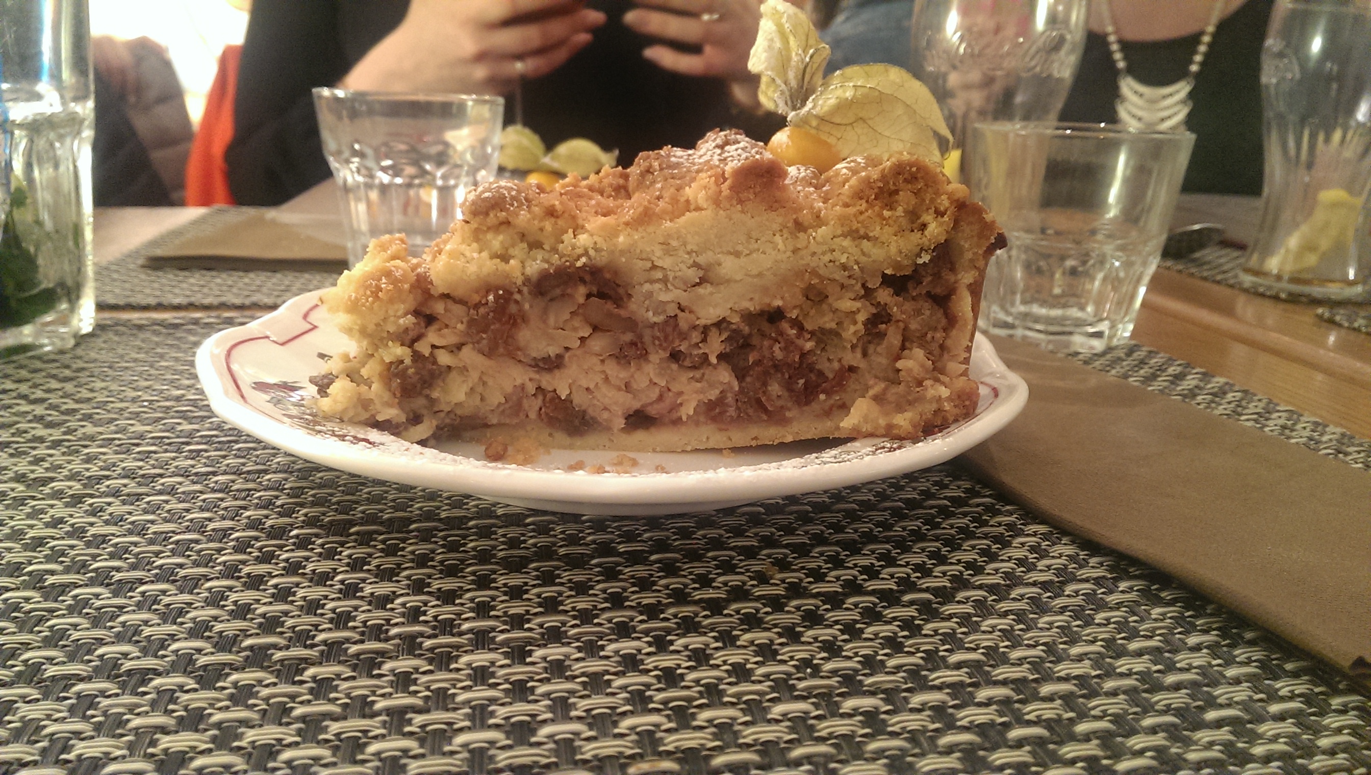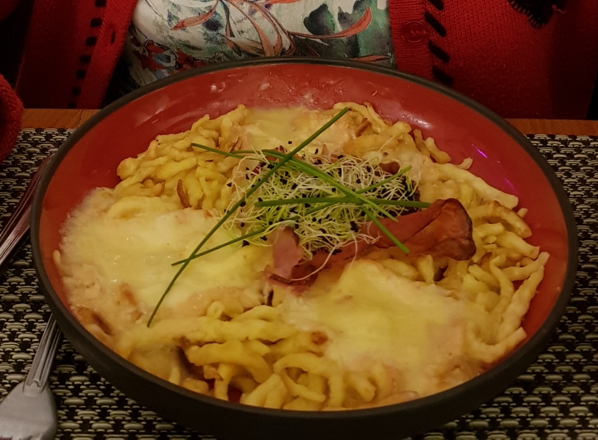 Nous avons mangé en terasse, elle était bien aménagé (plaid, chauffage). Nous avons pris les spaetzles au munster, c'était très bon, ça manquait juste un peu de jambon pour mieux équilibré le plat. Les plats sont assez copieux. J'ai mangé un délicieux cheese cake pour le dessert, il était lui aussi bien copieux.