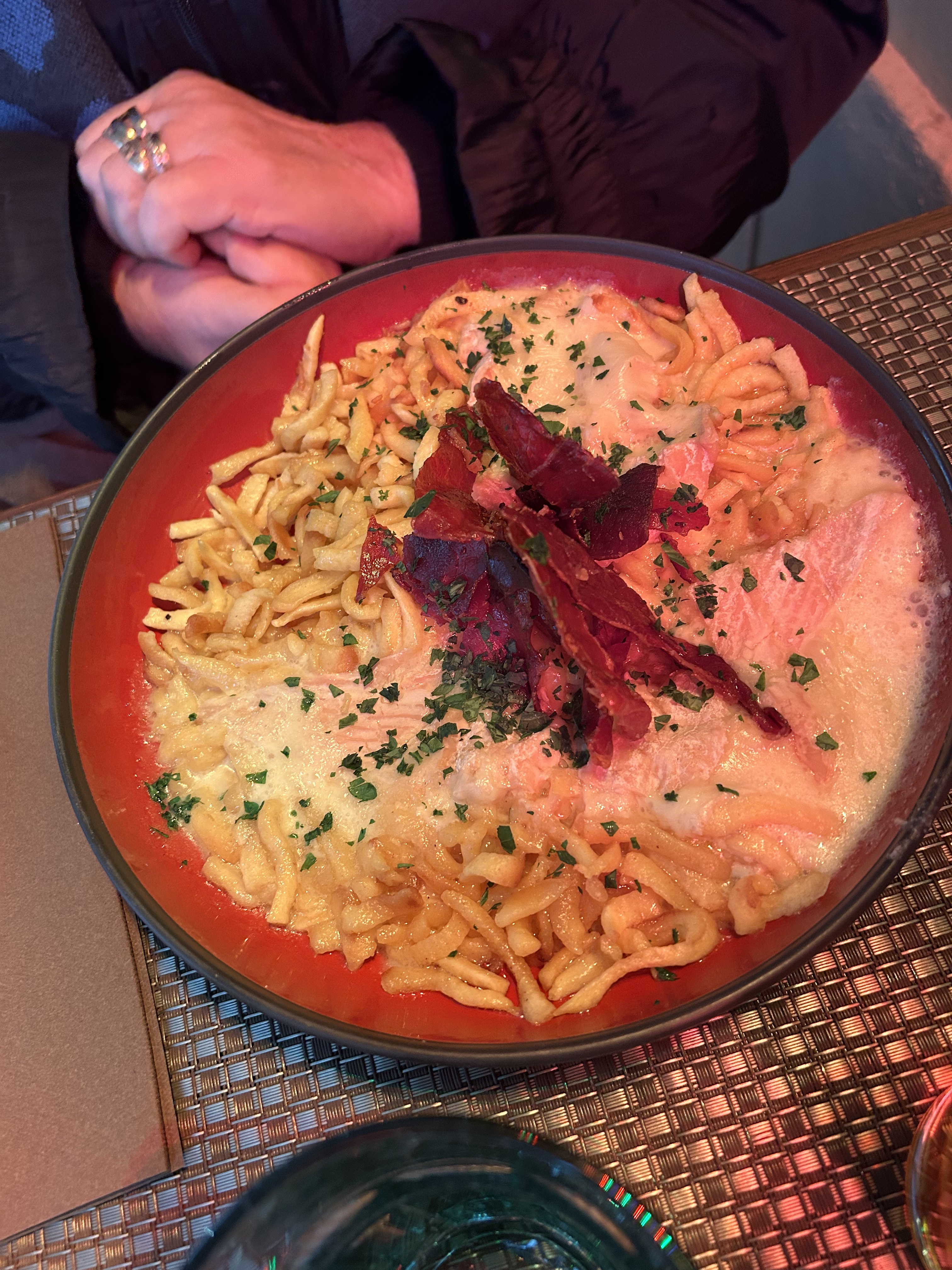 Nous y avons déjeuner la semaine dernière lors d'un passage au marché de Noël .. Pour moi... jarret avec choucroute et pour mon épouse späetzel gratiné au munster... c'était parfait Service rapide et personnel agréable