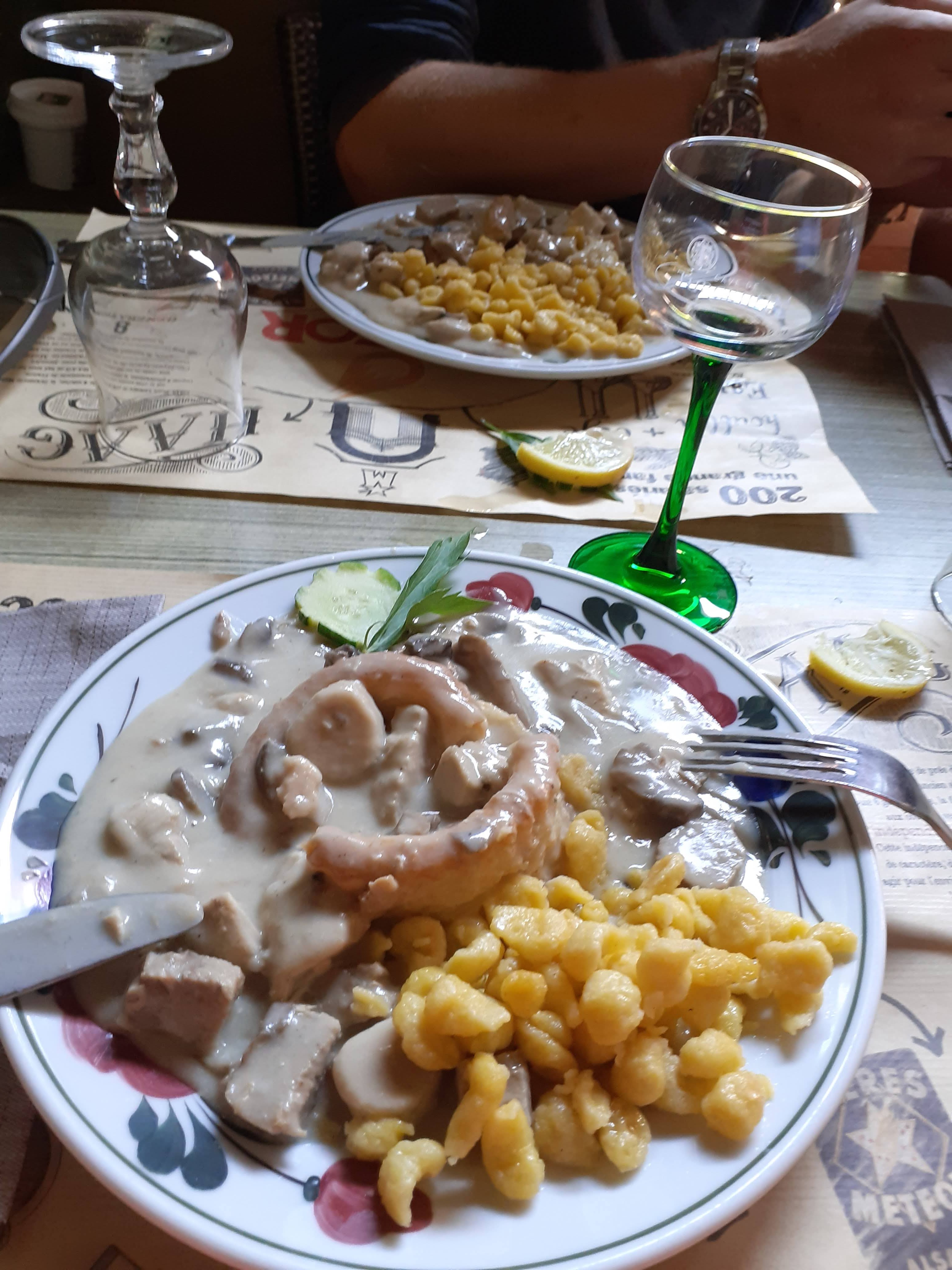 J'avais entendu parler de ce restaurant grâce à un reportage sur le royal palace où le patron du cabaret invitait ses danseurs et danseuses pour leur faire découvrir la cuisine alsacienne. Profitant d'un passage par ce célèbre cabaret, nous avons mon mari et moi profiter de l'occasion pour aller y faire un tour. Nous avons très bien mangé. 12 escargots chacun pour commencer, ils étaient parfaitement cuits, tendres et savoureux. Mon mari a opté ensuite pour les rognons et moi pour le sandre au raifort accompagné de choucroute. Rien à dire, franchement très bon. La déco est chaleureuse, on a l'impression d'être chez sa grand-mère, c'est très sympathique. Le service est aimable et souriant, proche des gens, c'est fort agréable. Nous reviendrons l'année prochaine assurément lors de notre prochaine visite au royal palace.
