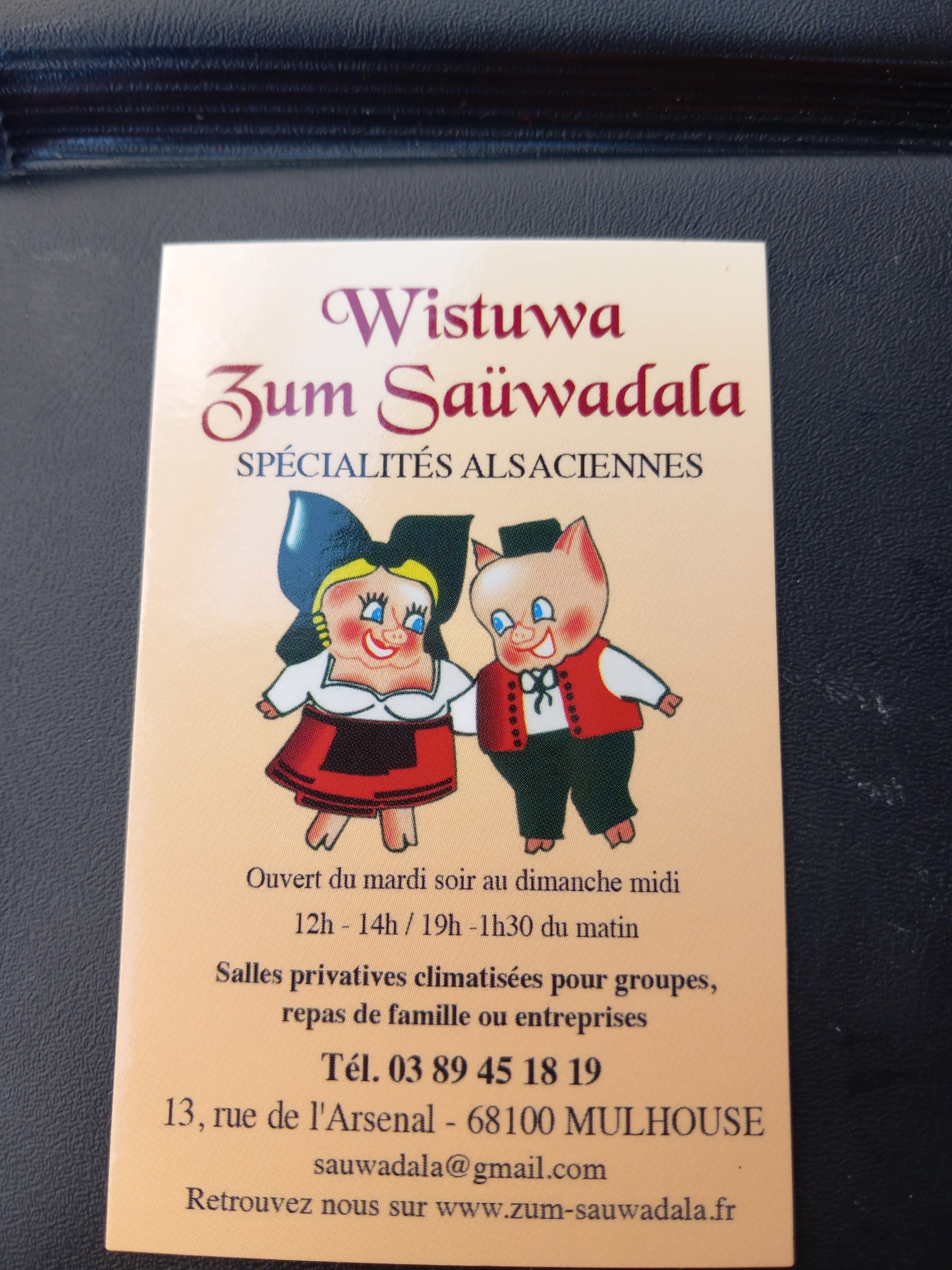 Que dire de plus qui n'a été dit ? Zum Sauwadala : The place to be ! Une institution à Mulhouse, ne passez pas à coté sans vous arreter !! C'est Sandra qui nous accueille avec son délicieux accent Lusitanien ! Mais ne vous detrompez pas !!! C'est bien ALSACIEN que vous allez manger !!!! Et du bon SVP !! Je craque d'abords pour une biere agrémentée de liqueur, puis flambée !!! Le tout , à la paille !!! Puis recraquage pour le jambonneau braisé !!! Une tuerie !!!! Venez et revenez !!!! Grace au père lolo et à ma voisine du jour, Béa, on se tapera une franche rigolade !!! Merci ! et encore Merci !!!