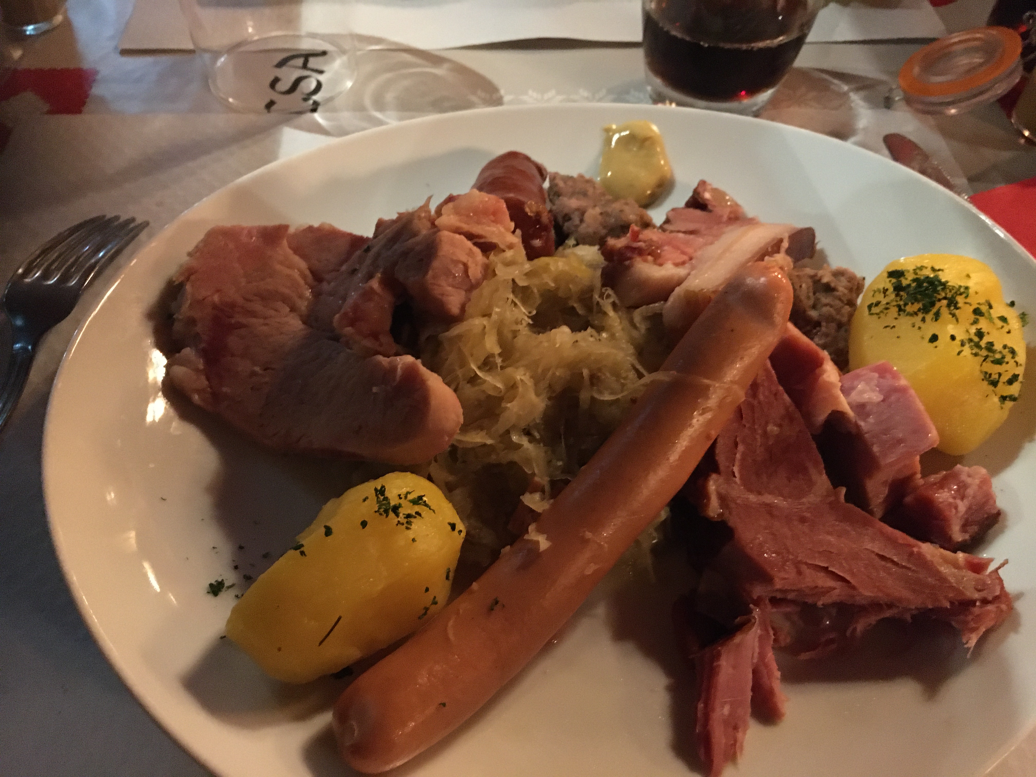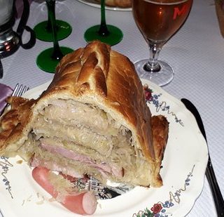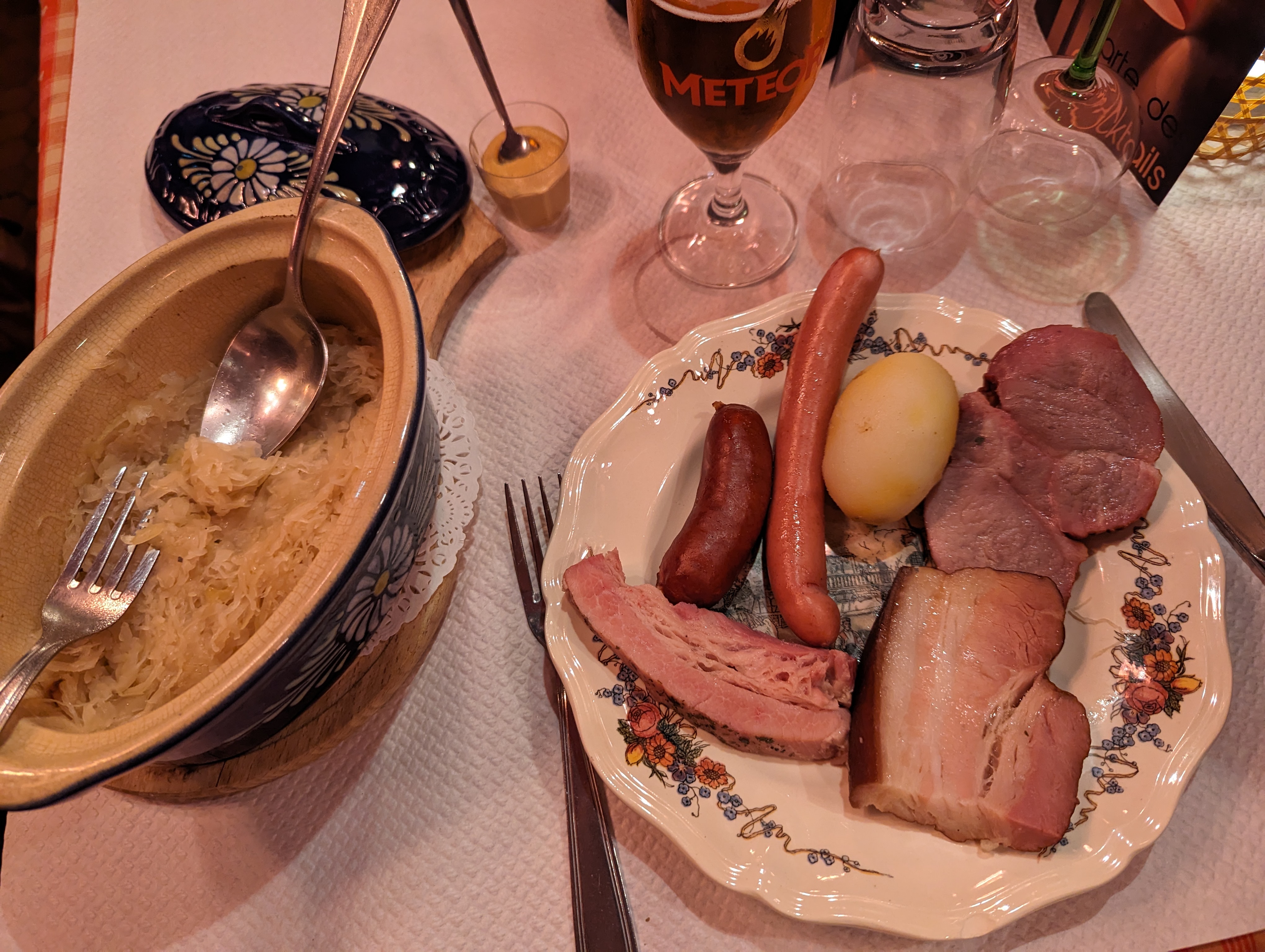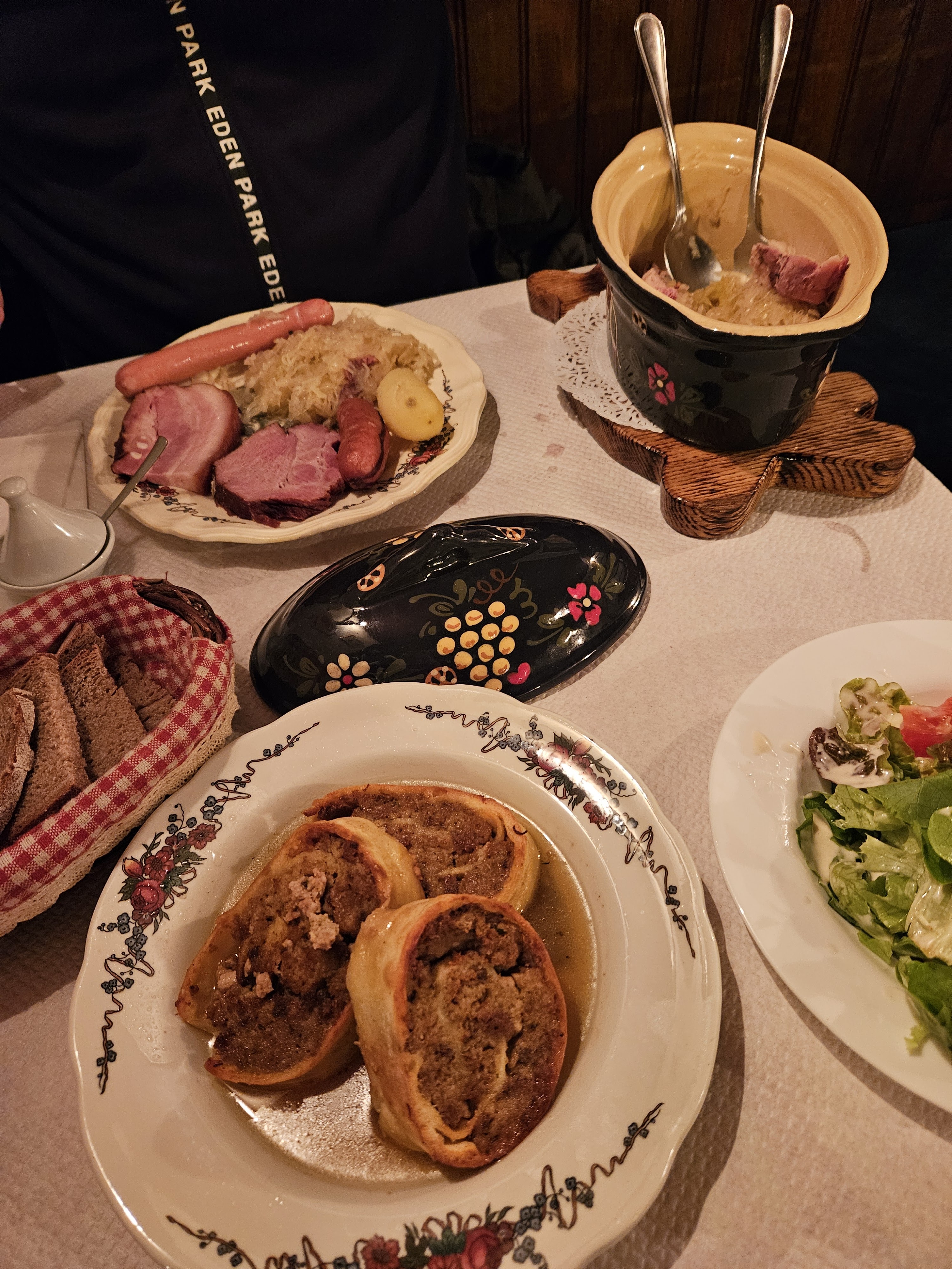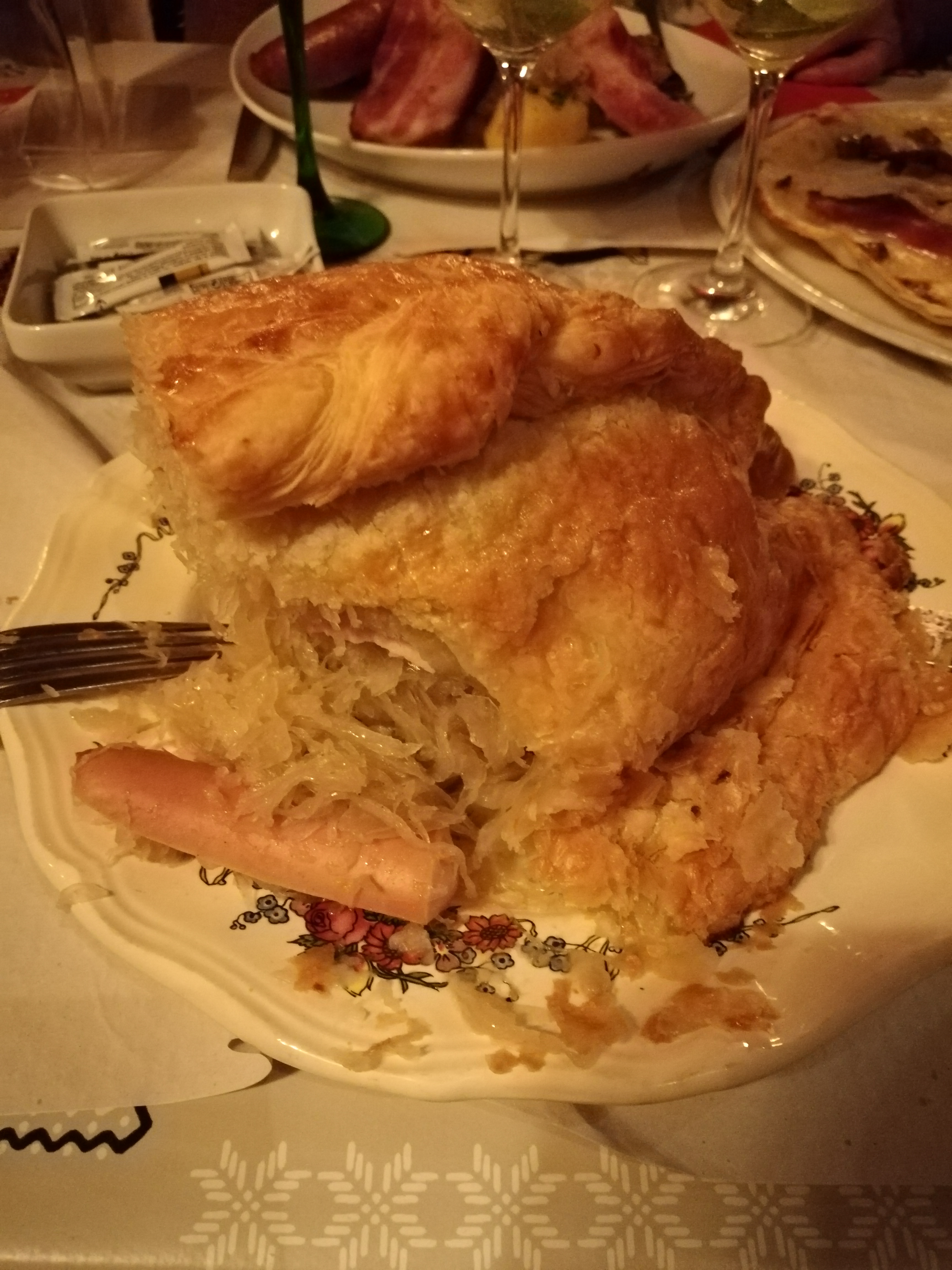 Choucroute en croûte au menu de ce dimanche, la spécialité de la maison, à réserver à l'avance. Un pur bonheur pour notre déjeuner ! Ambiance très agréable. Serveur avec beaucoup d'à-propos et d'humour. A recommander si vous passer à Mulhouse !