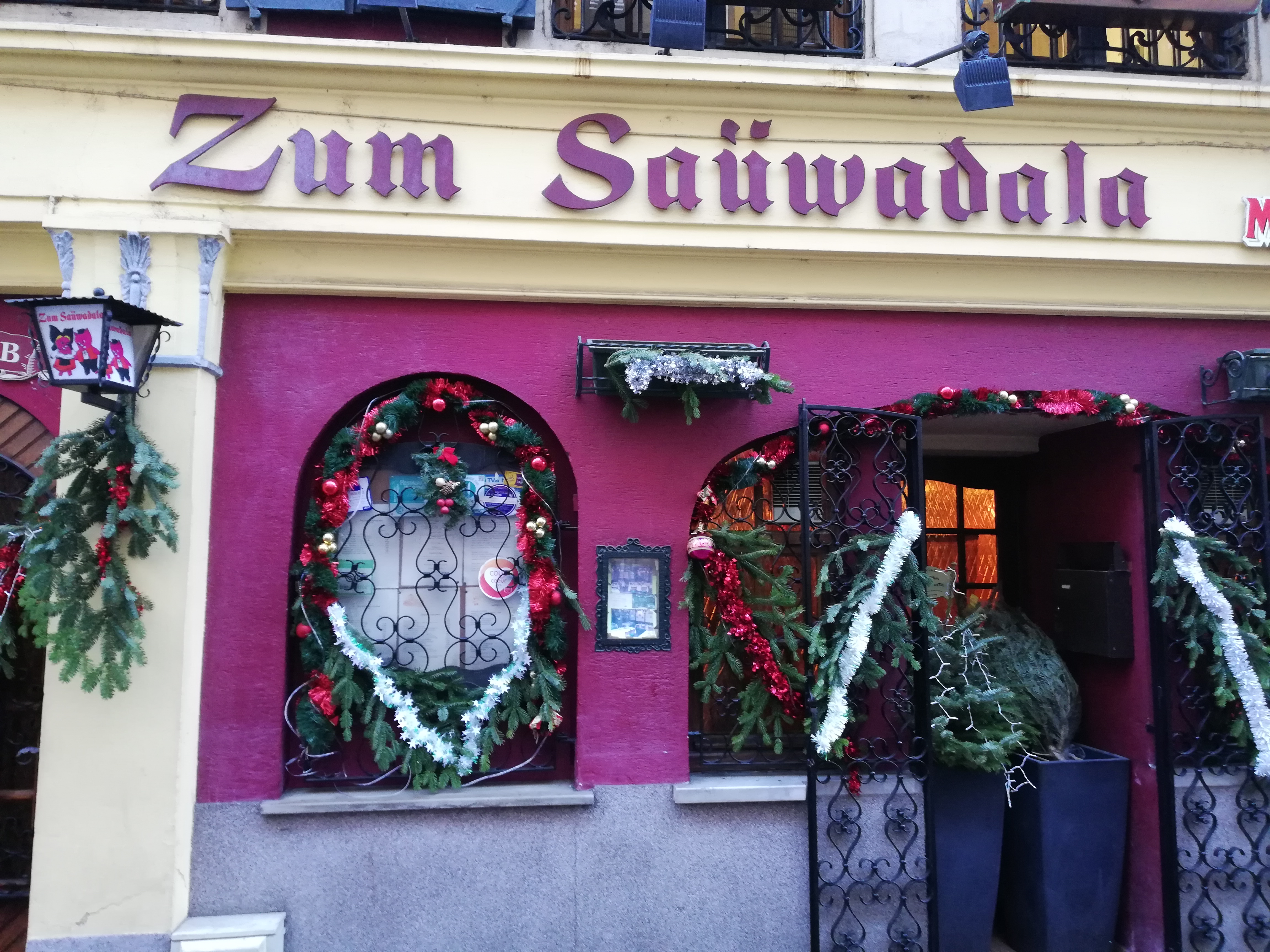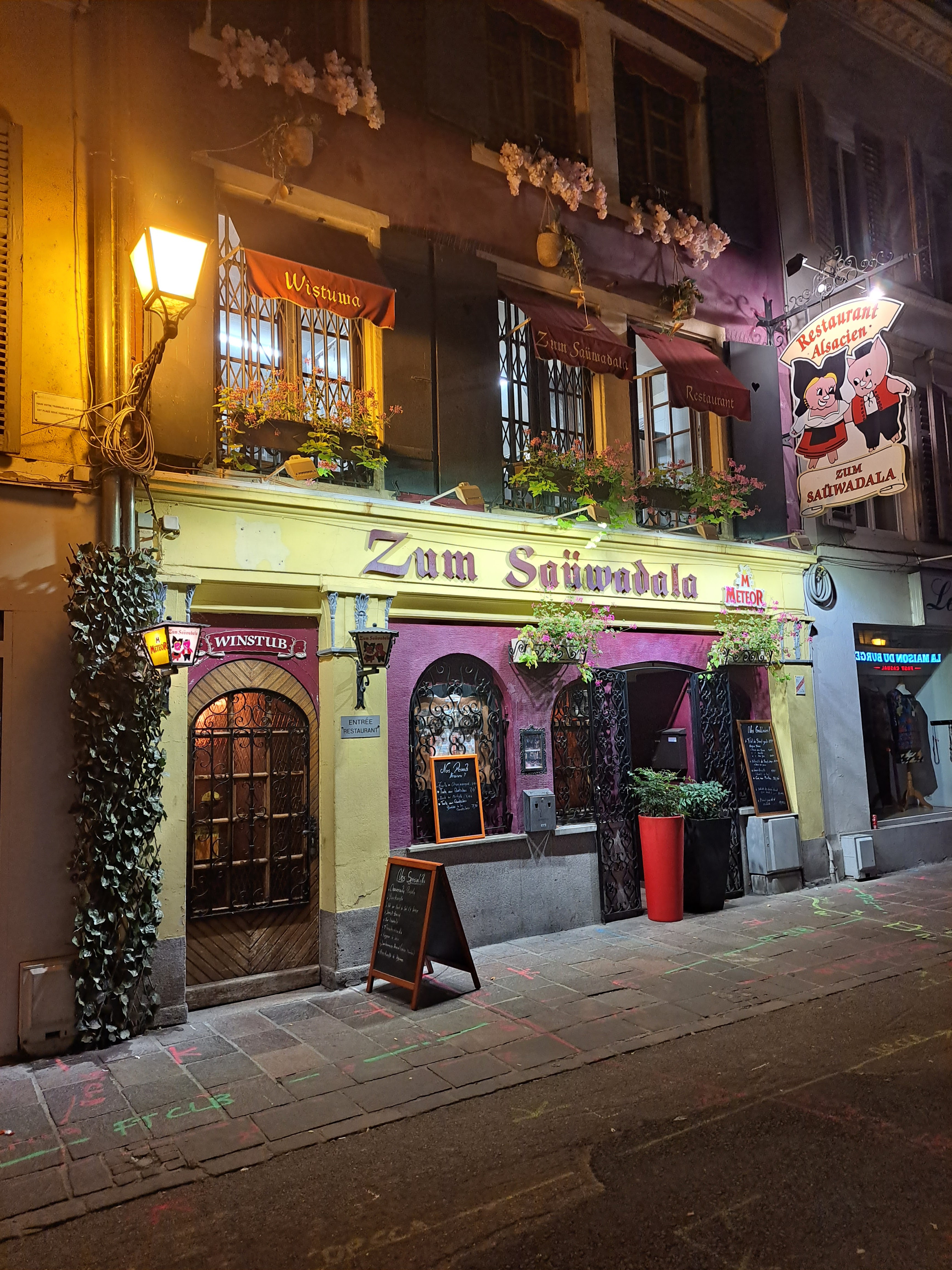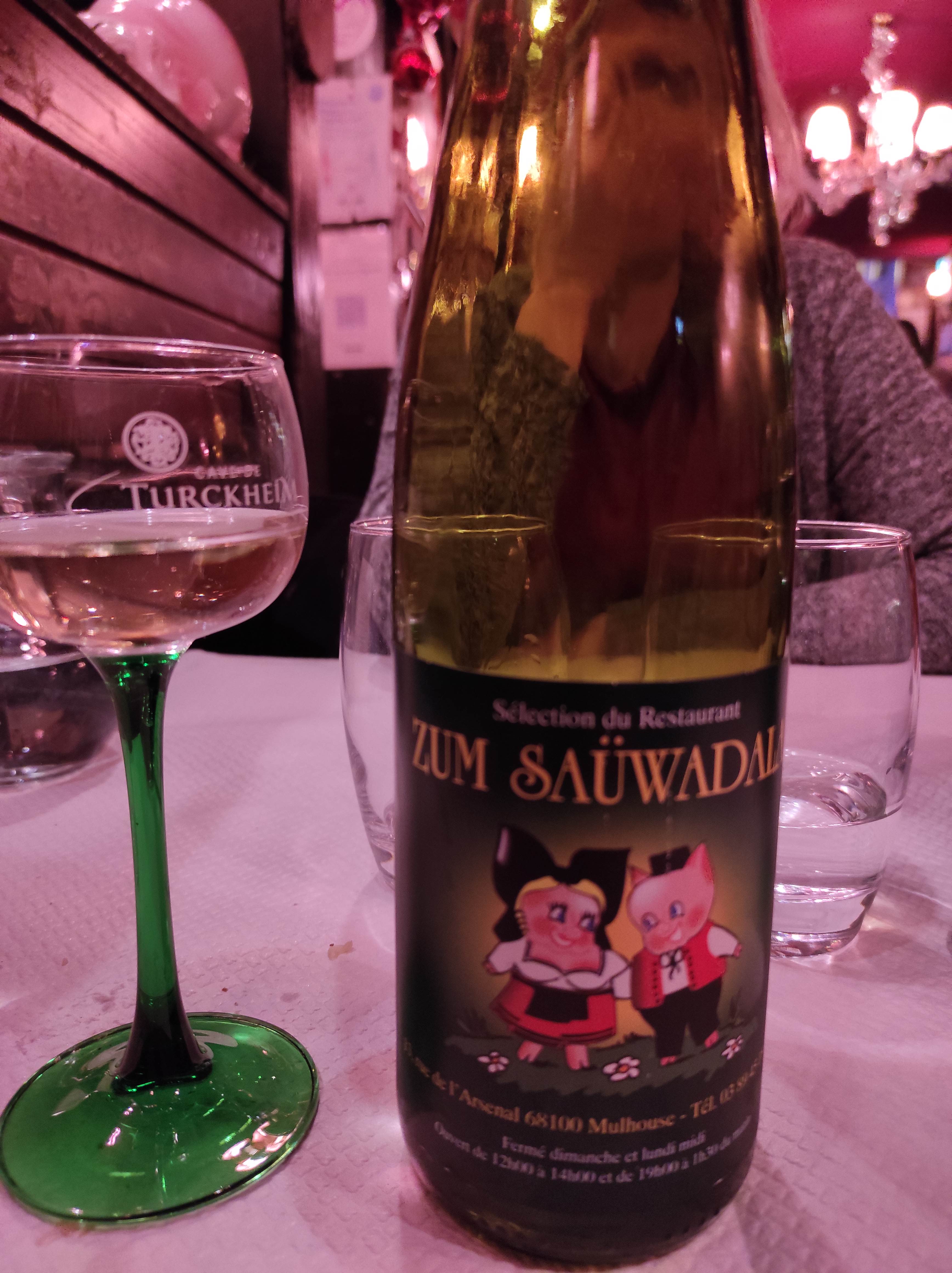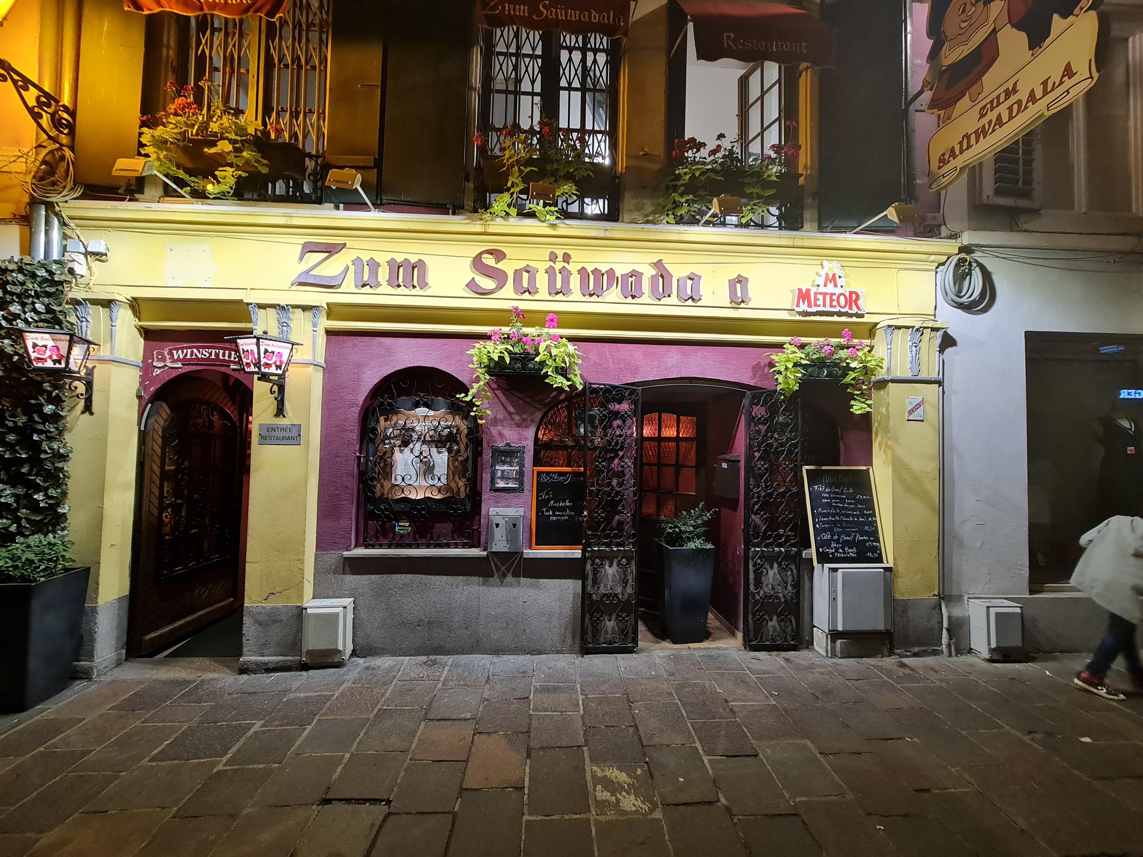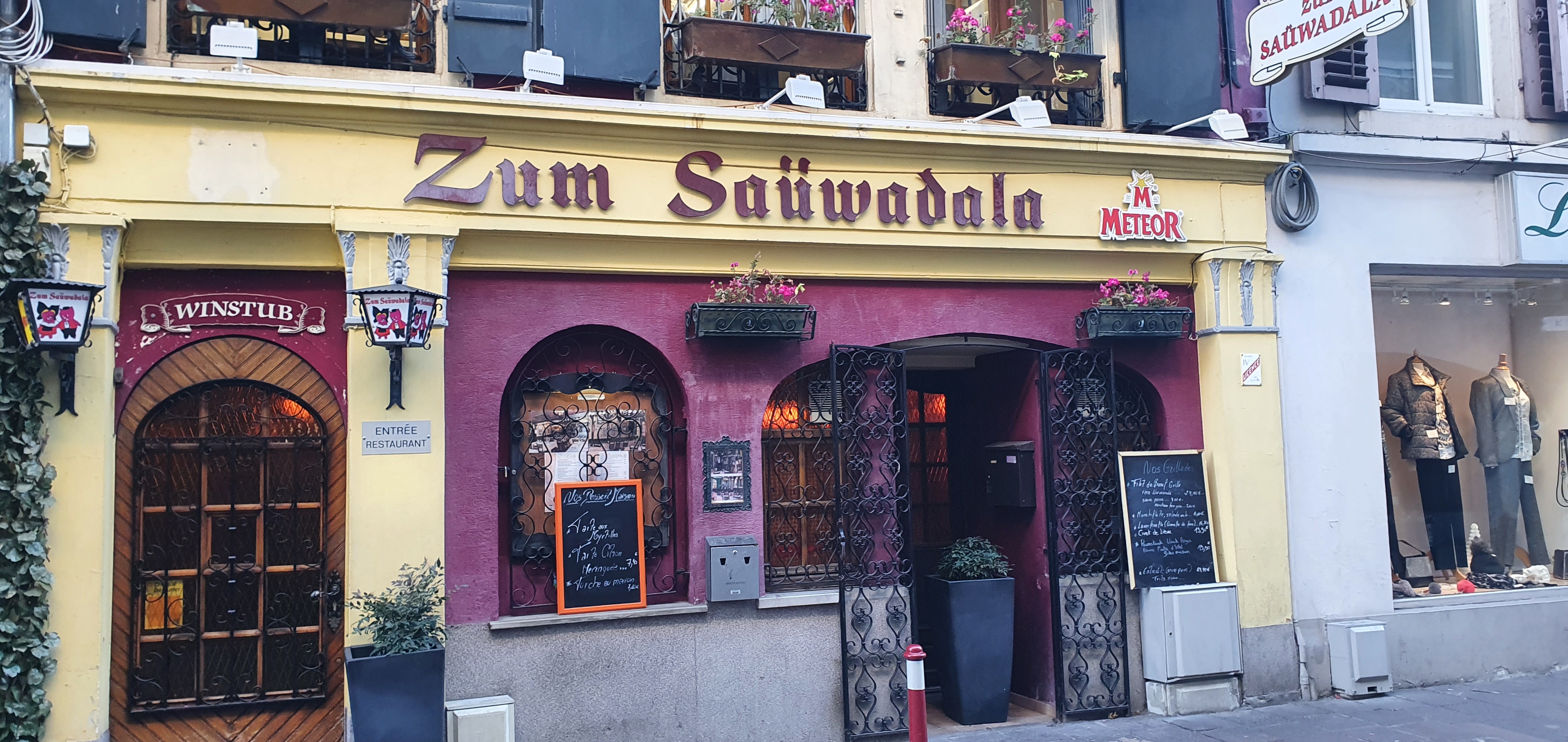 Un restaurant alsacien pittoresque dans une rue qui l'est tout autant : tout mulhousien ou sundgauvien a déjà entendu parler du Sauwadala. Il faut aimer le côté kitsch de la déco avec sa lumière tamisée et orangée digne d'une taverne à l'ancienne : mais soyons honnêtes... n'est-ce pas ce que l'on recherche quand on va dans un restaurant alsacien ? La lumière associée à la déco donne une impression fantasque d'avoir quitté Mulhouse pour le charme rupestre d'une auberge de montagne, ou du fin fond d'un village, donnant presque - aidé par les liqueurs - un sentiment hallucinogène à la sortie en se rappelant que l'on est en plein centre-ville. Évidemment la cuisine est riche, grasse, généreuse, à faire bigler convenablement en été. Mais une fois encore : est-ce que ce n'est pas ce qu'on est presque en droit d'attendre d'un bon resto alsacien ? Je me suis laissé tenter par une bonne salade vigneronne en entrée (une anti-salade, typiquement alsacienne, ou le nom de salade trahit plutôt la froideur de l'alimentation que la présence de légumes). Avec un amer, c'est parfait. Puis, après un long conclave, j'ai commandé un cordon bleu au munster généreux avec de délicieuses pommes de terre sautées en portion gargantuesque (l'ami avec qui je m'y suis rendu, bon mangeur, n'a pas pu finir à cause de l'entrée. J'ai donc donné de ma personne pour finir la mienne, non sans mal, mais sans douleur. Ça glisse tout seul !) Le service est sympa et efficace, mais est d'une convivialité variable selon qui vous sert (sans jamais être antipathique cependant) Alors oui, c'est de la cuisine familiale, servie dans un lieu qui l'est tout autant, avec une salle bruyante, de la bouffe copieuse. On évite malgré tout le côté trop piège à touristes de ce genre d'établissements, quand bien même il serait un peu too much dans la déco. On notera que même si la cuisine alsacienne n'est pas celle qui se prête le mieux aux végétariens, le restaurant fait l'effort de servir quelques classiques comme le baeckoffe format végé. Une attention louable que l'on ne peut que saluer.