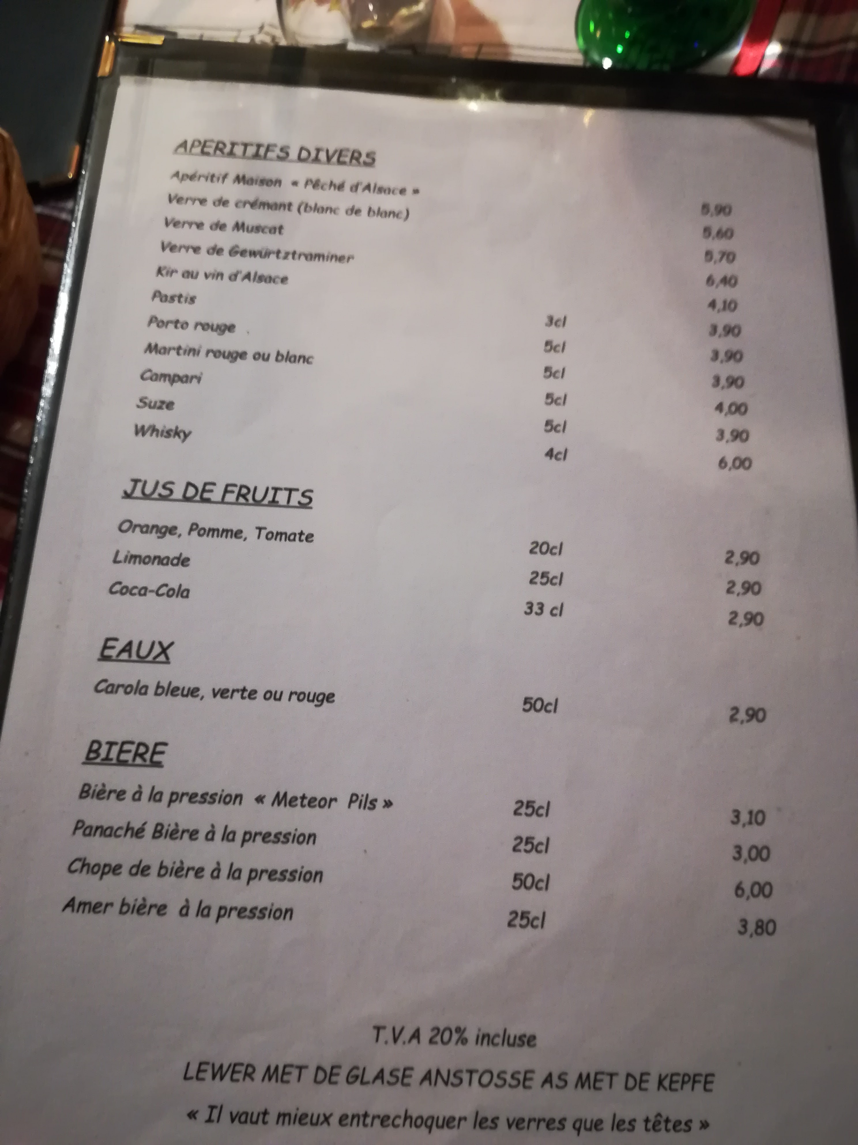 Lieu très convivial gens n'ayant pas le sens de l'humour s'abstenir! j'adore car le patron s'évertue à créer une atmosphère des bistrots alsacien d'antan un régal