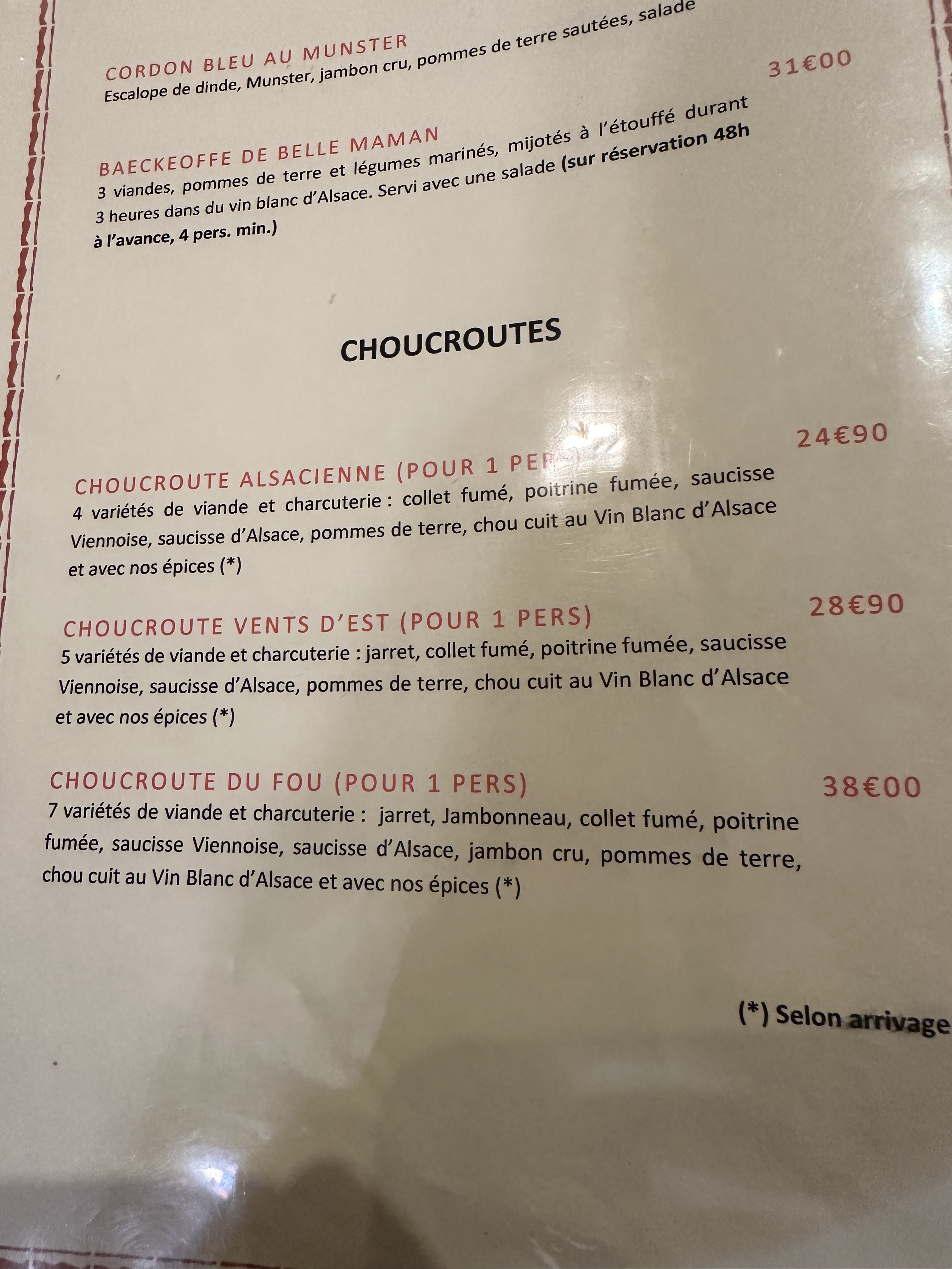 J'ai été déçu, je me faisais une meilleure image de la cuisine alsacienne. Seul intérêt le personnel est sympathique. La carte est très réduite en choix, et de fait quand nous y sommes allés (samedi soir à 20h), il ne restait plus que des choucroutes et des flammekueches, les plats cuisinés ont disparus de la carte, place à la facilité. je dis les choucroutes mais en fait c'est bien la même à chaque fois à laquelle ils rajoutent un bout de viande différente pour les 3 déclinaisons. Au final, c'est très cher (28euros la normale par personne!!!!!) pour 2 petites patates, du choux et de la viande certes assez bonne mais très grasse (et puis on va pas se mentir, la choucroute c'est pas non plus incroyable). service : 1h d'attente.