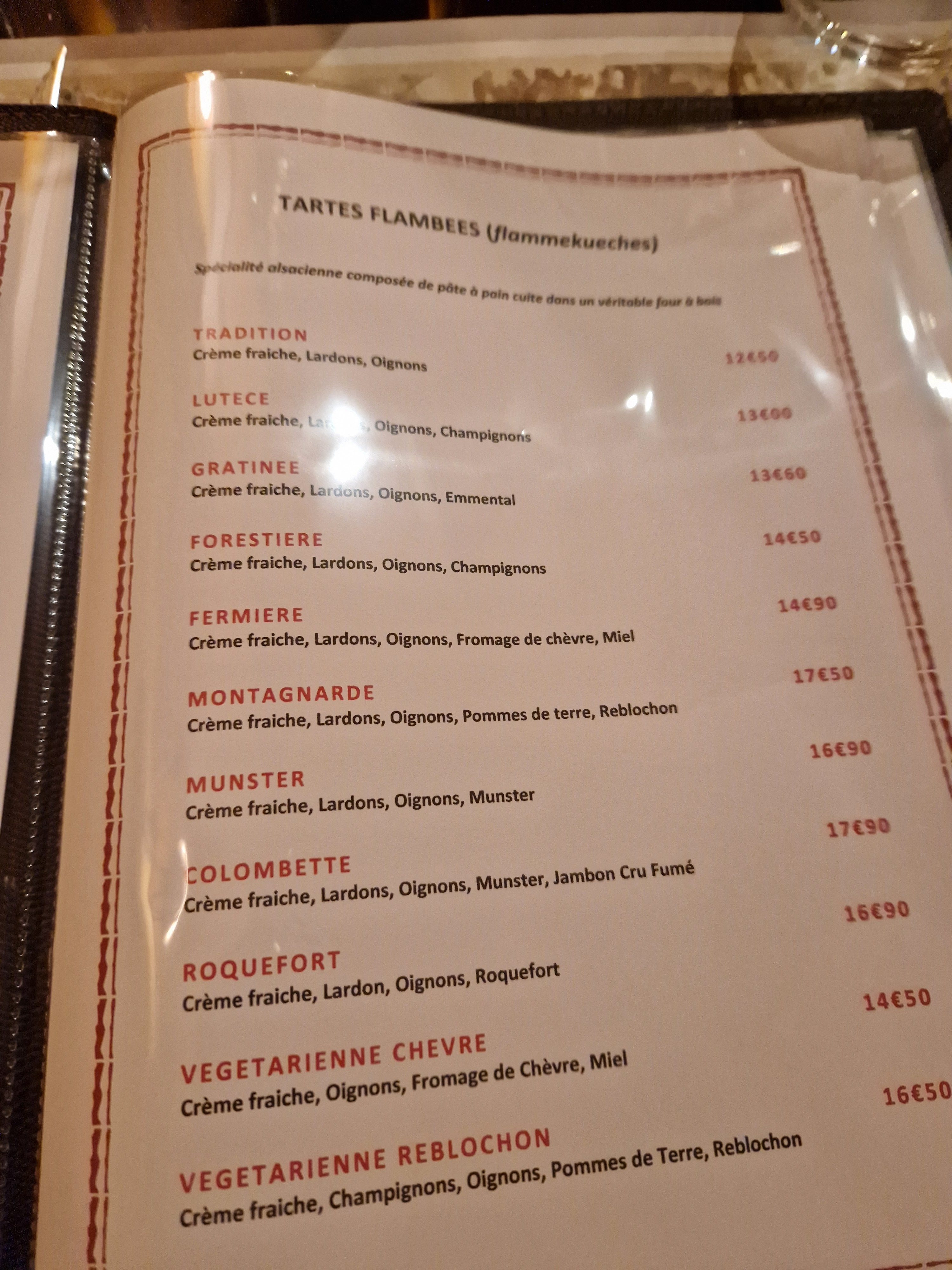 Accueil super sympa. Choix des tartes flambées/Flammkueches ou choucroute avec viande etc. Repas formidable et très authentique. A recommander fortement !