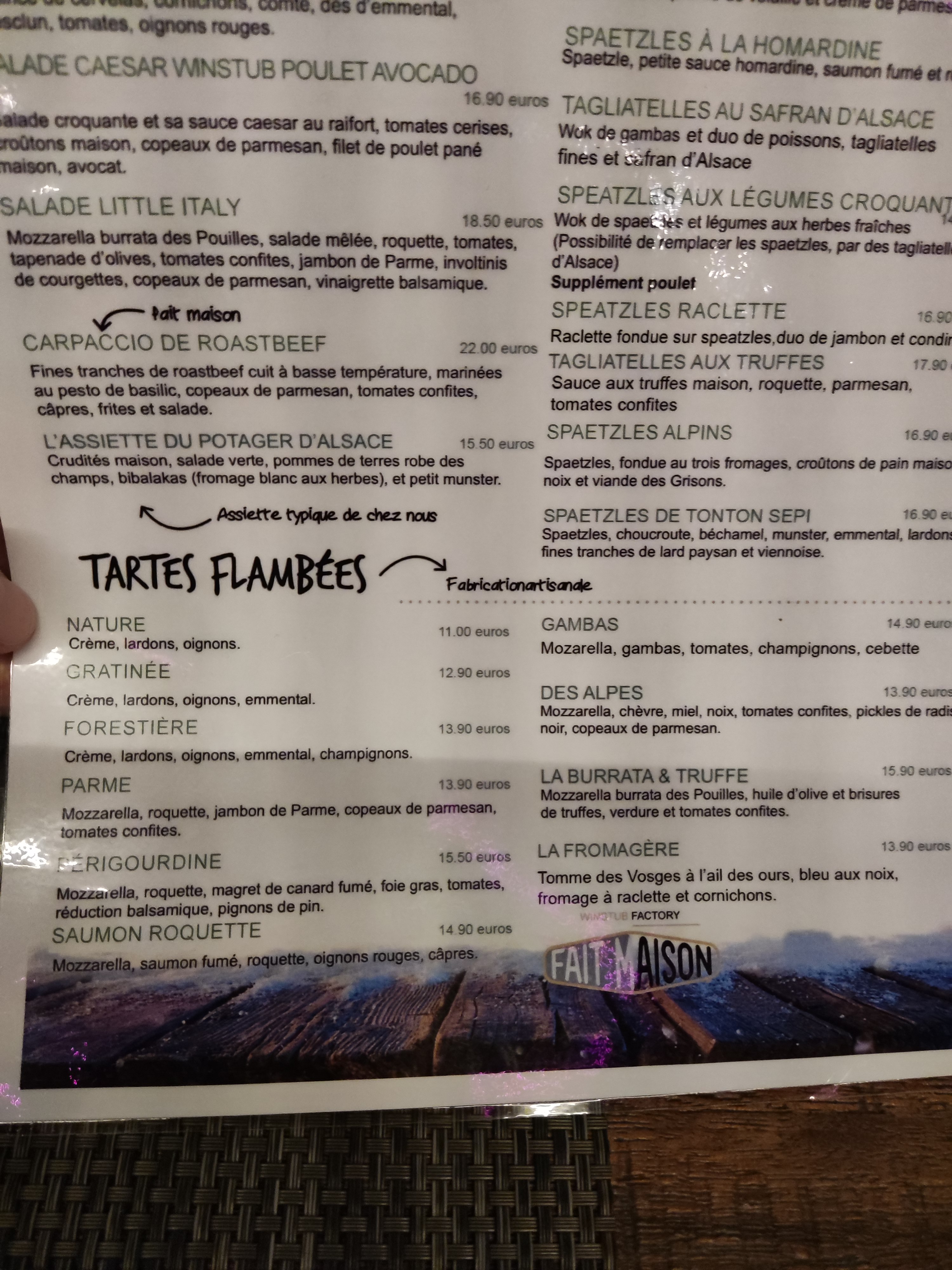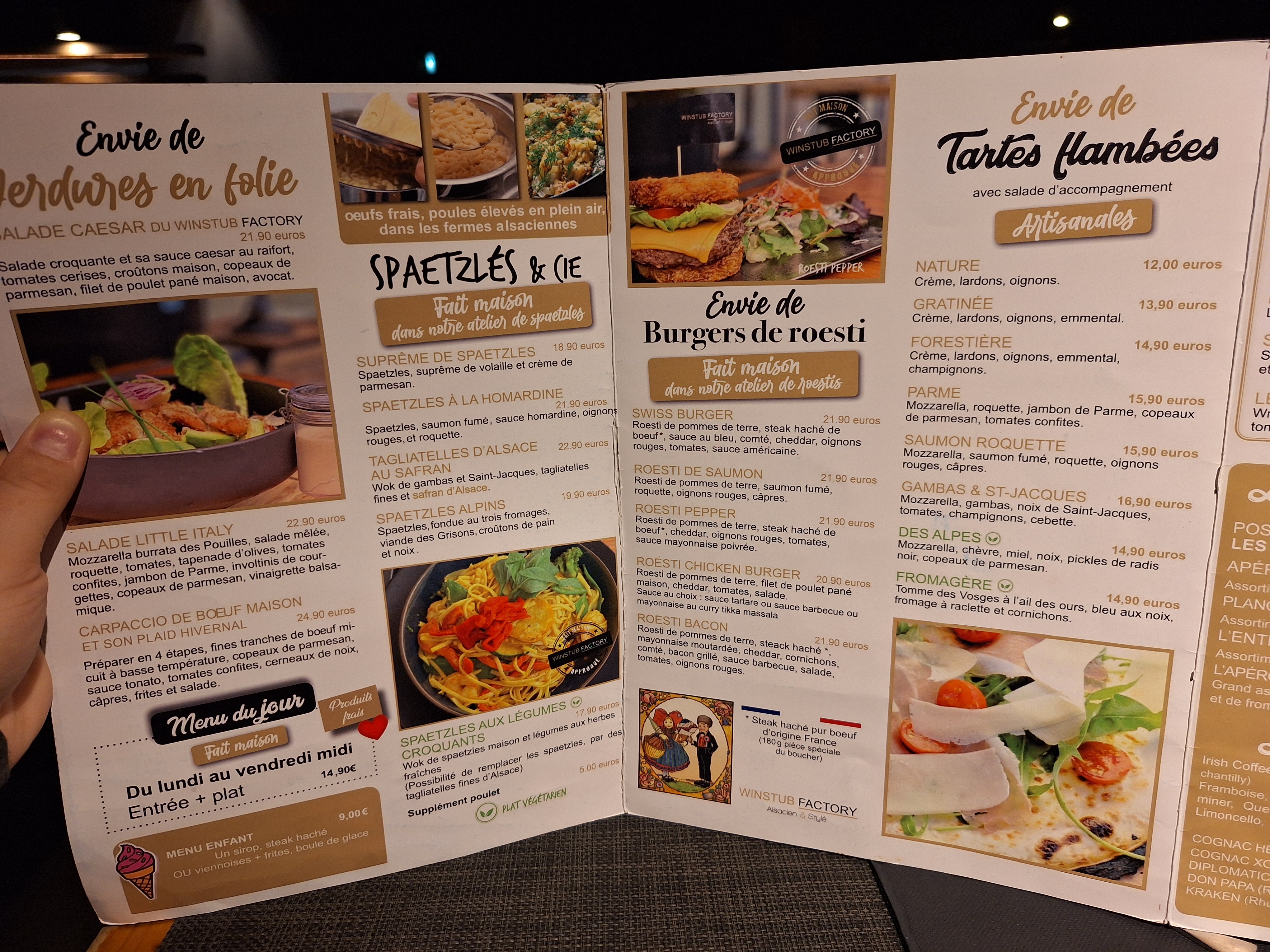 Première expérience chez Winstub Factory, plutôt satisfait, une grosse attente de 45 à 50 min pour leur deuxième service. Concernant le décor très sympa mais la terrasse manque d espace entre les tables par contre le côté lanterne près de la fontaine c'est top. Côté service accueillant, très souriant et efficace. Et pour finir le plus important le repas, et bien comme c'est précisé sur la carte tout est fait maison et on apprécie ! C'est très bon, pas trop salé et les prix restent correct par rapport à la qualité. Je ne doute pas que les autres plats plus alsaciens sont excellents. On reviendra tester leur spaetzle ou leur tarte flambées. Belle découverte