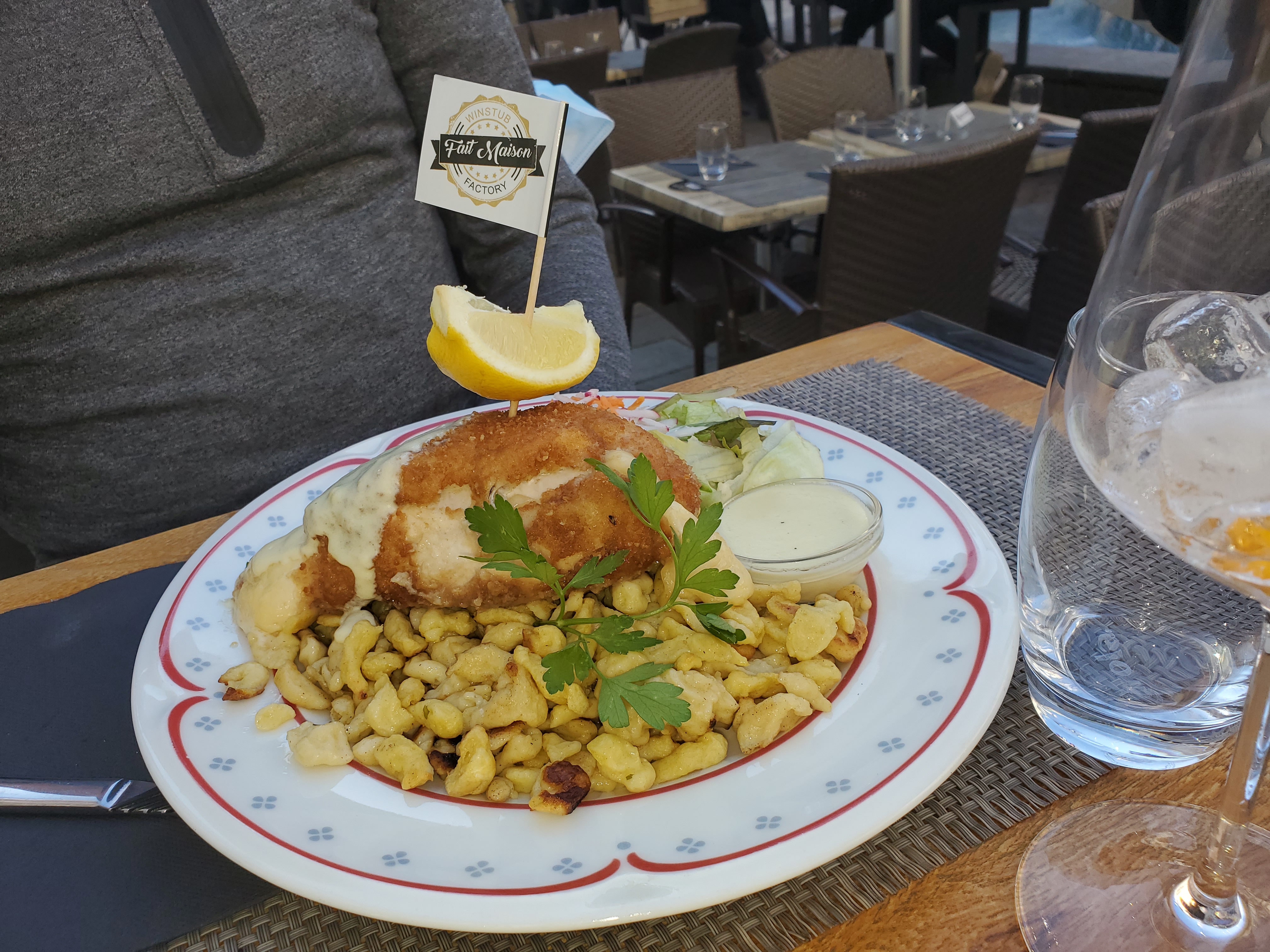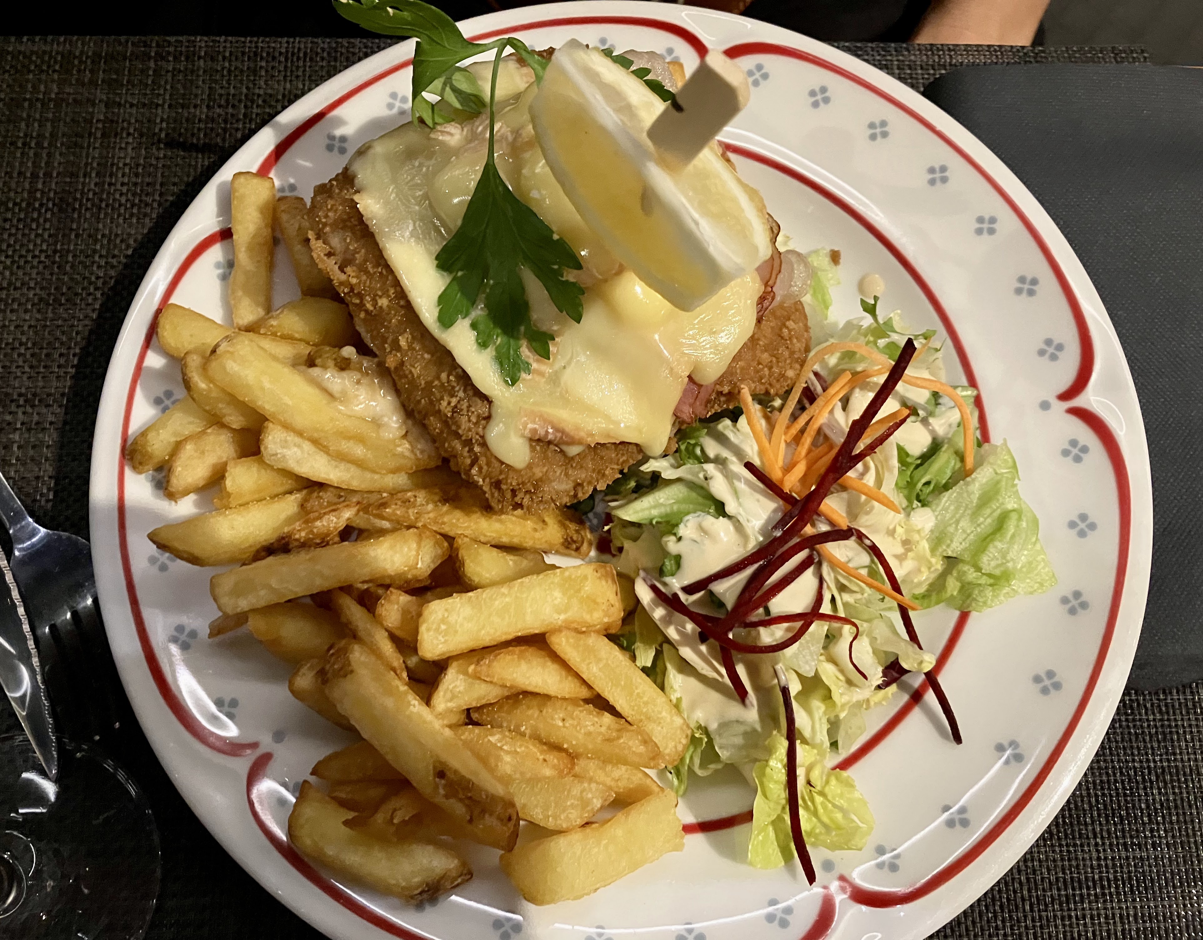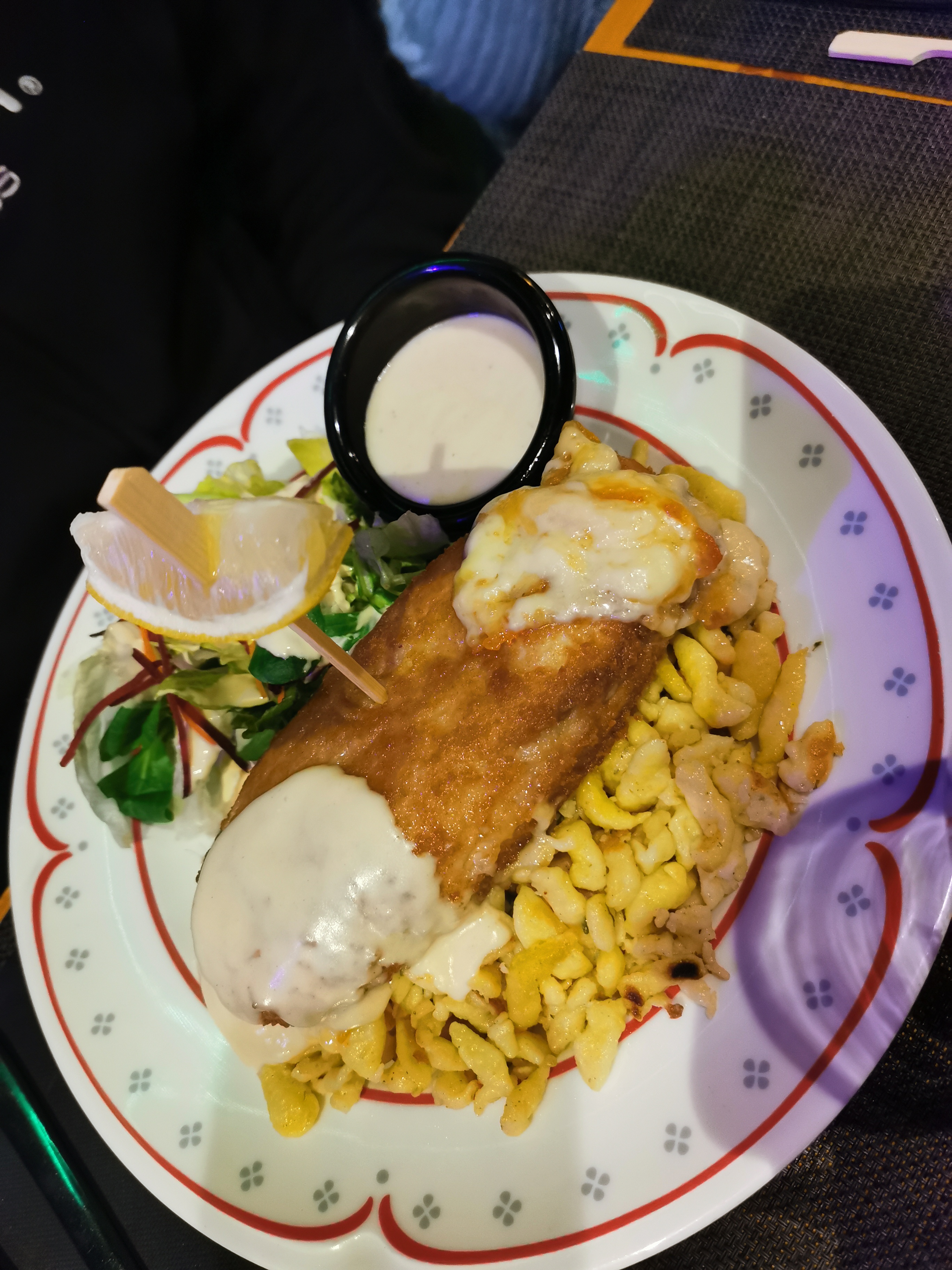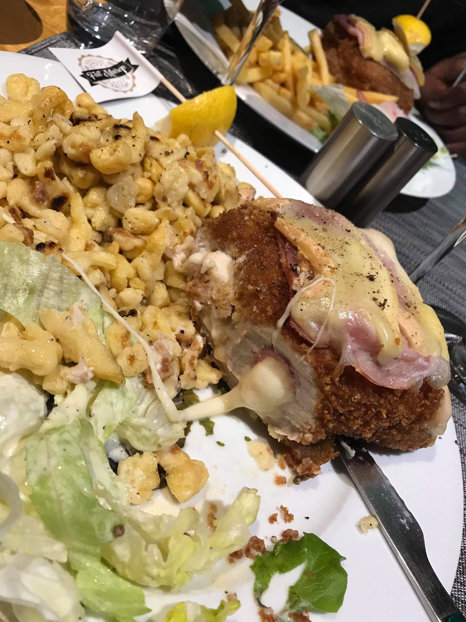 Très bon! Choix des plats variés Cordon bleu suprême très copieux, frites bonnes, assiette bien garnie Spetzeles bonnes, copieuses