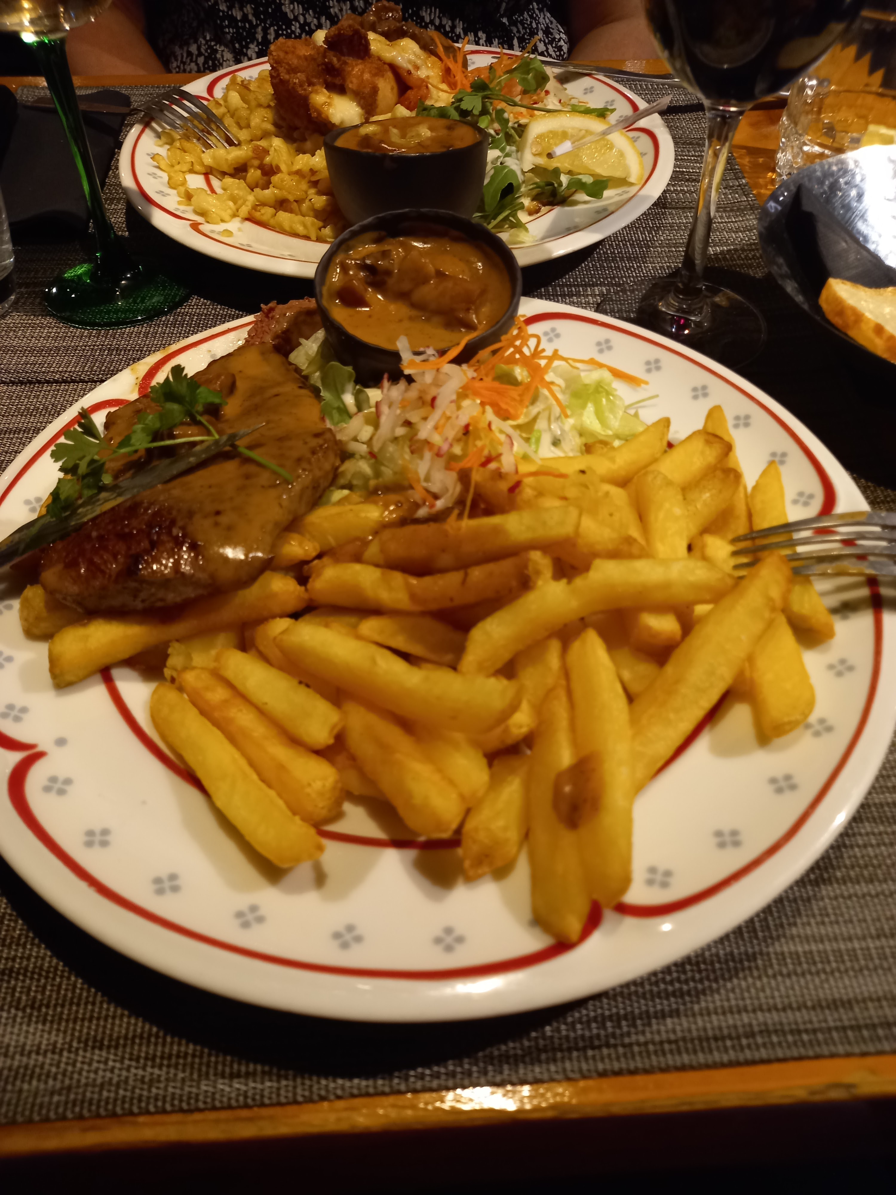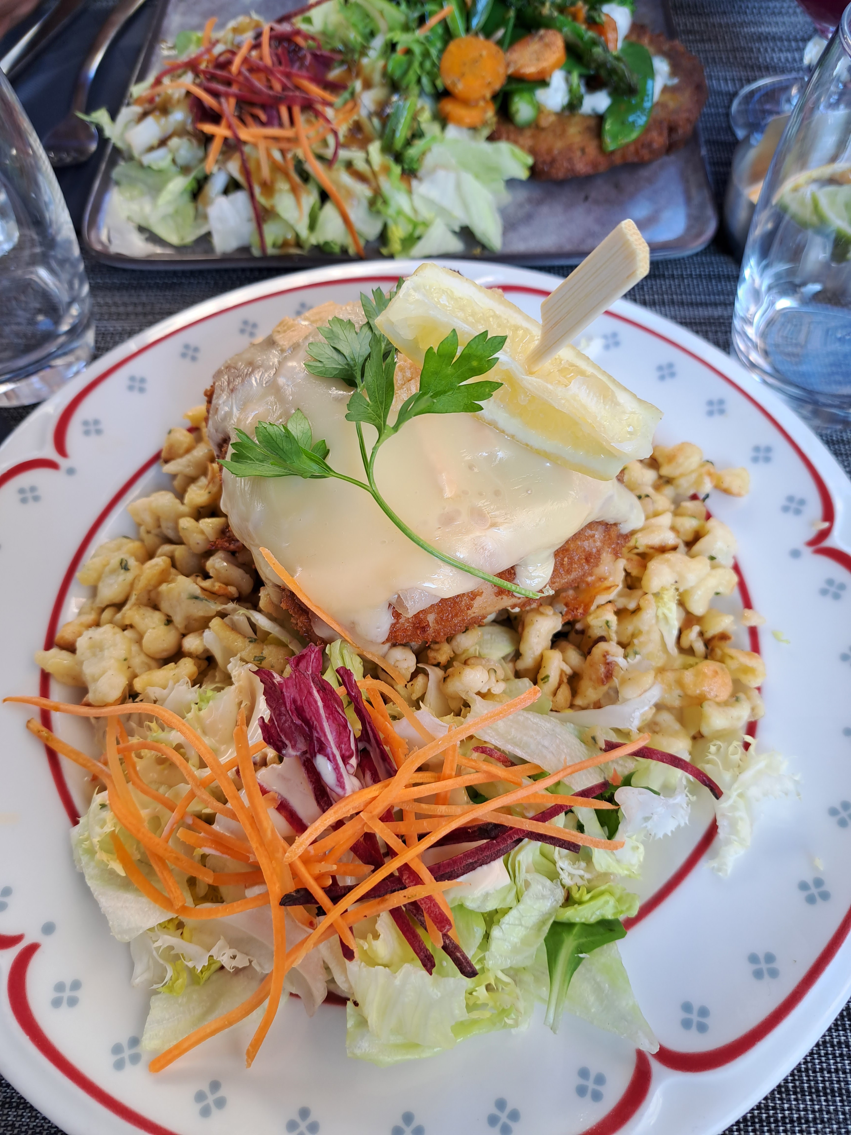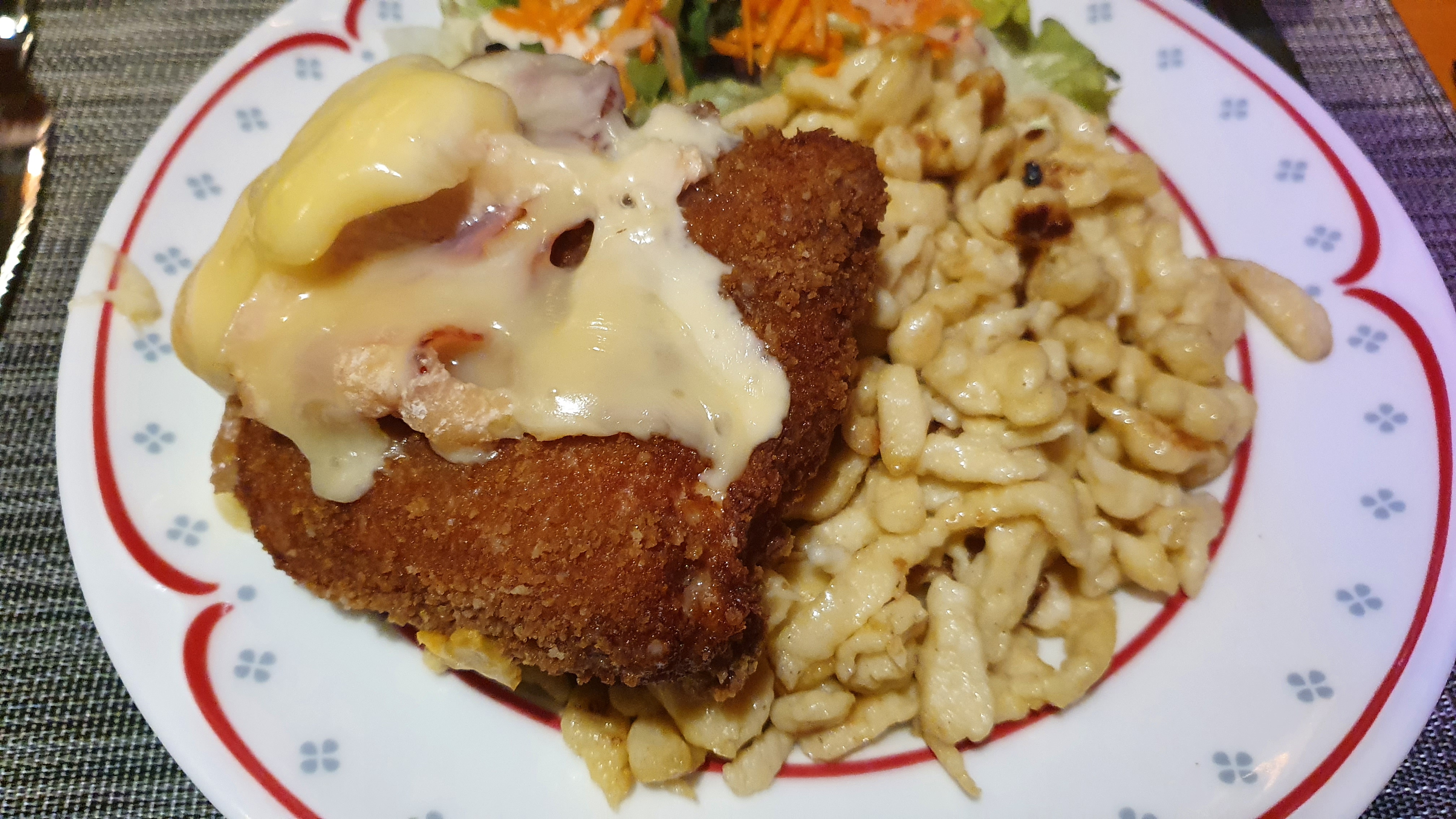 Très bon! Choix des plats variés Cordon bleu suprême très copieux, frites bonnes, assiette bien garnie Spetzeles bonnes, copieuses