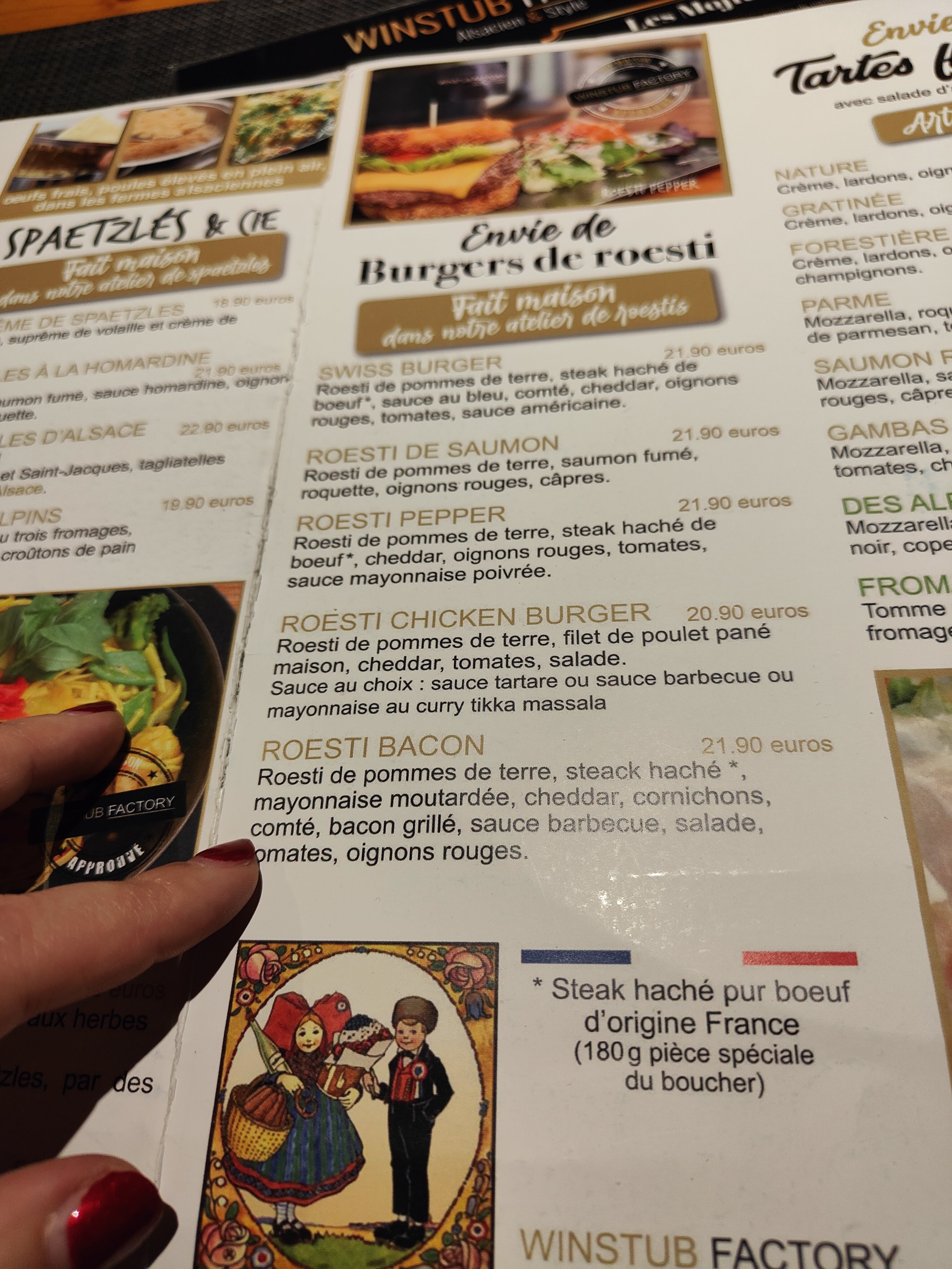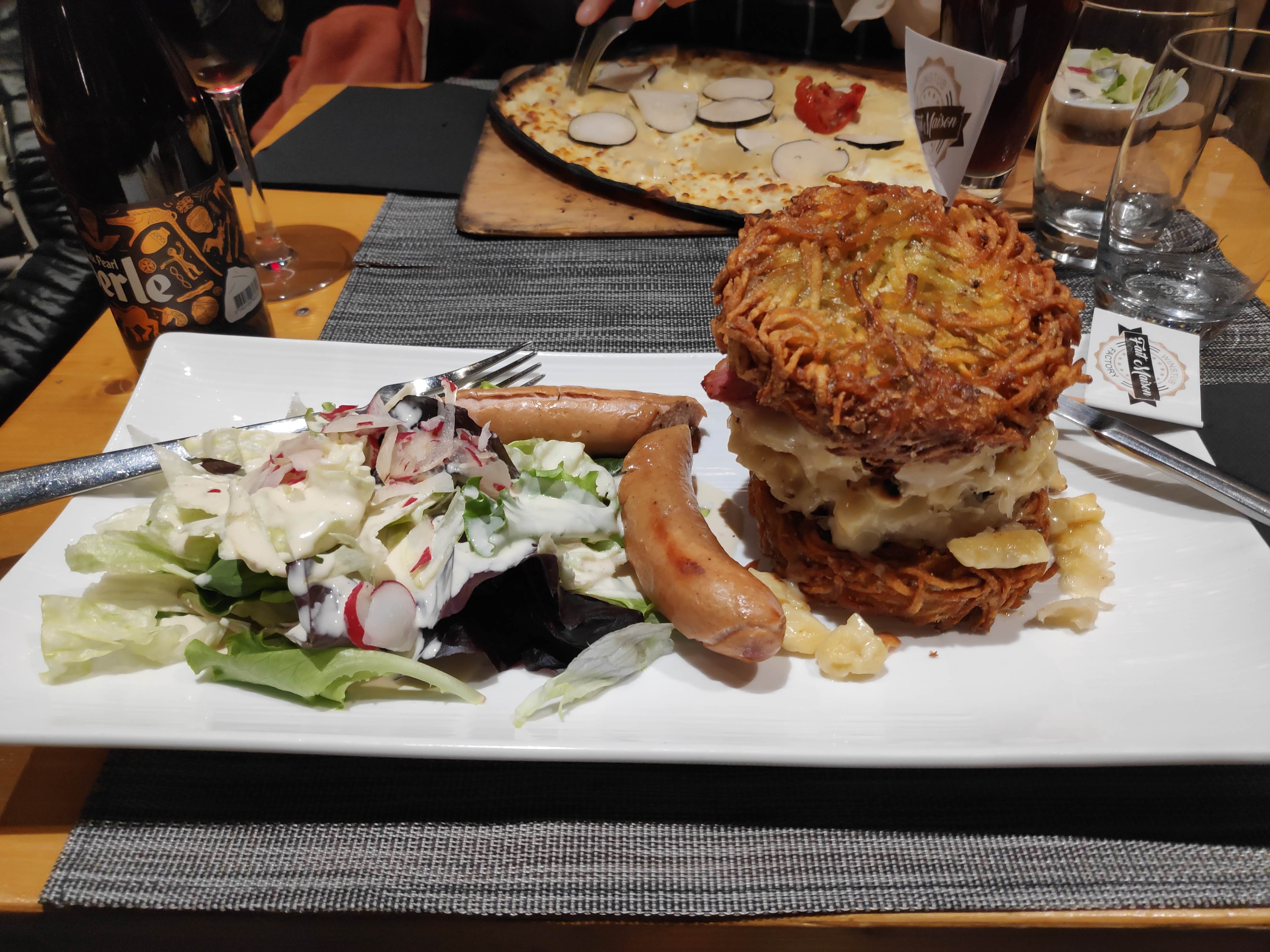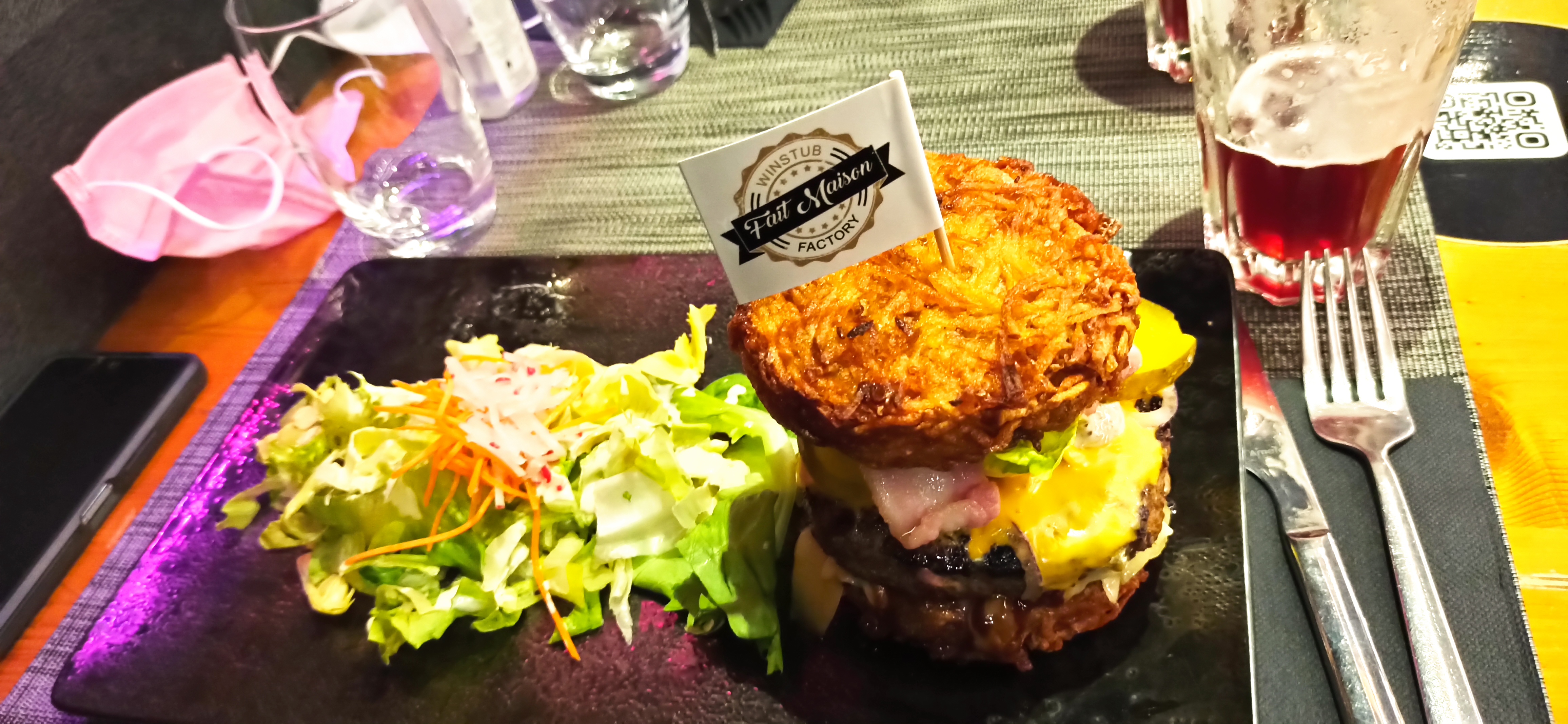 Bonjour les amis je suis allé dans ce Winstub car le Winstub m'a interpellé 🙂 je me suis installé puis passer commande pas mal de choix tartes flambé salade viande burger pâte et bien d'autres pour ma par j'ai pris un burger roestis bacon accompagné de frites je me suis régalé bien avoir l'estomac vide car assez consistant mais particulièrement bon je ne peux que vous le conseiller