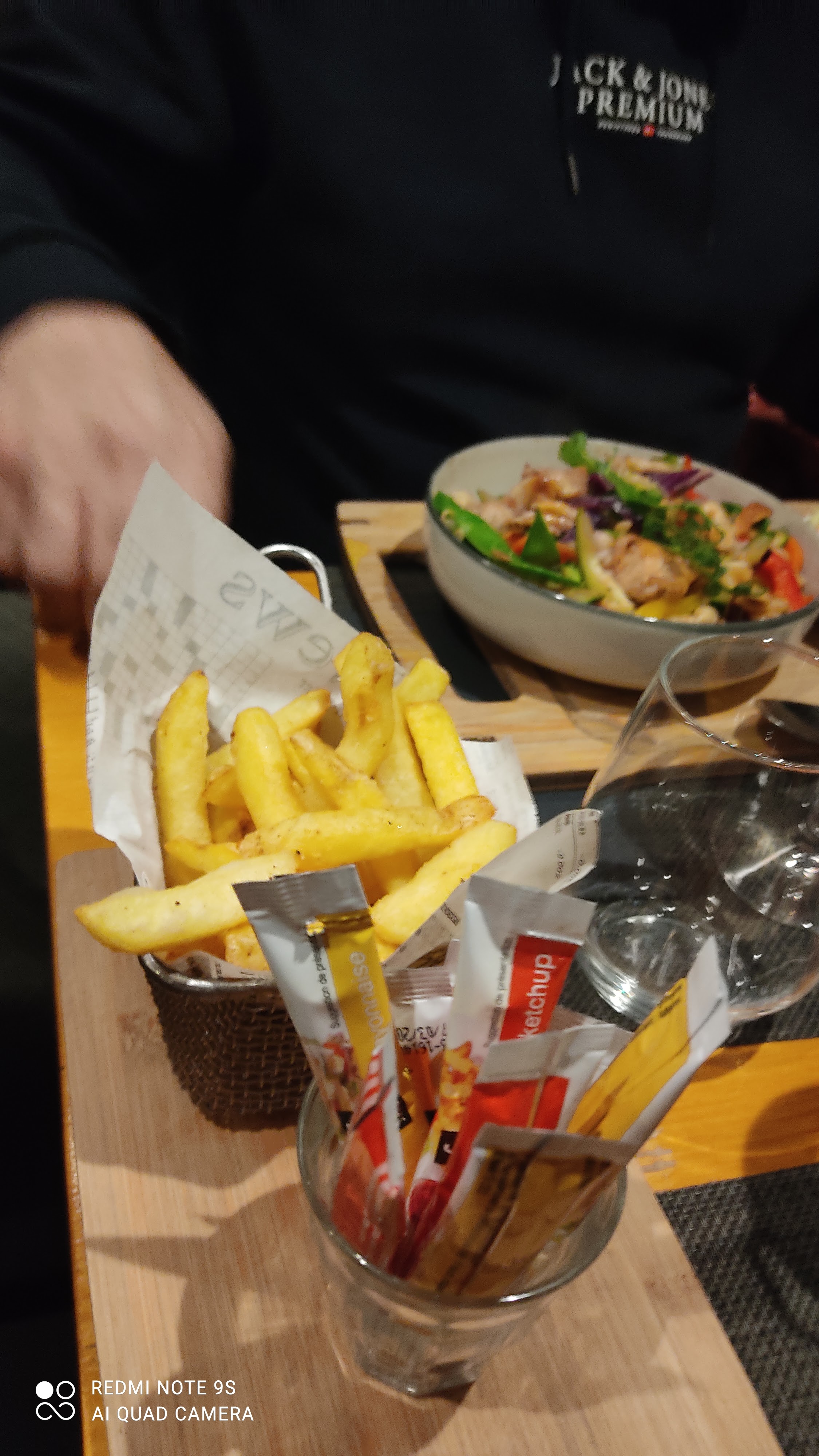 Jolie cadre, on était dans la salle du fond, il faisait très chaud, nous avons attendu 45min pour avoir notre plat, le repas était bon, nous avons demandé un doggy bag, nous avons reçu à peine la moitié de la quantité laissé, l'ami qui était avec nous a reçu uniquement les frites de sont assiettes alors qu'il restait une bonne partie de sont burger... et en partant on s'est rendu compte qu'on avait pas reçu un des apéro... Un peu déçu, mais le cadre reste sympathique