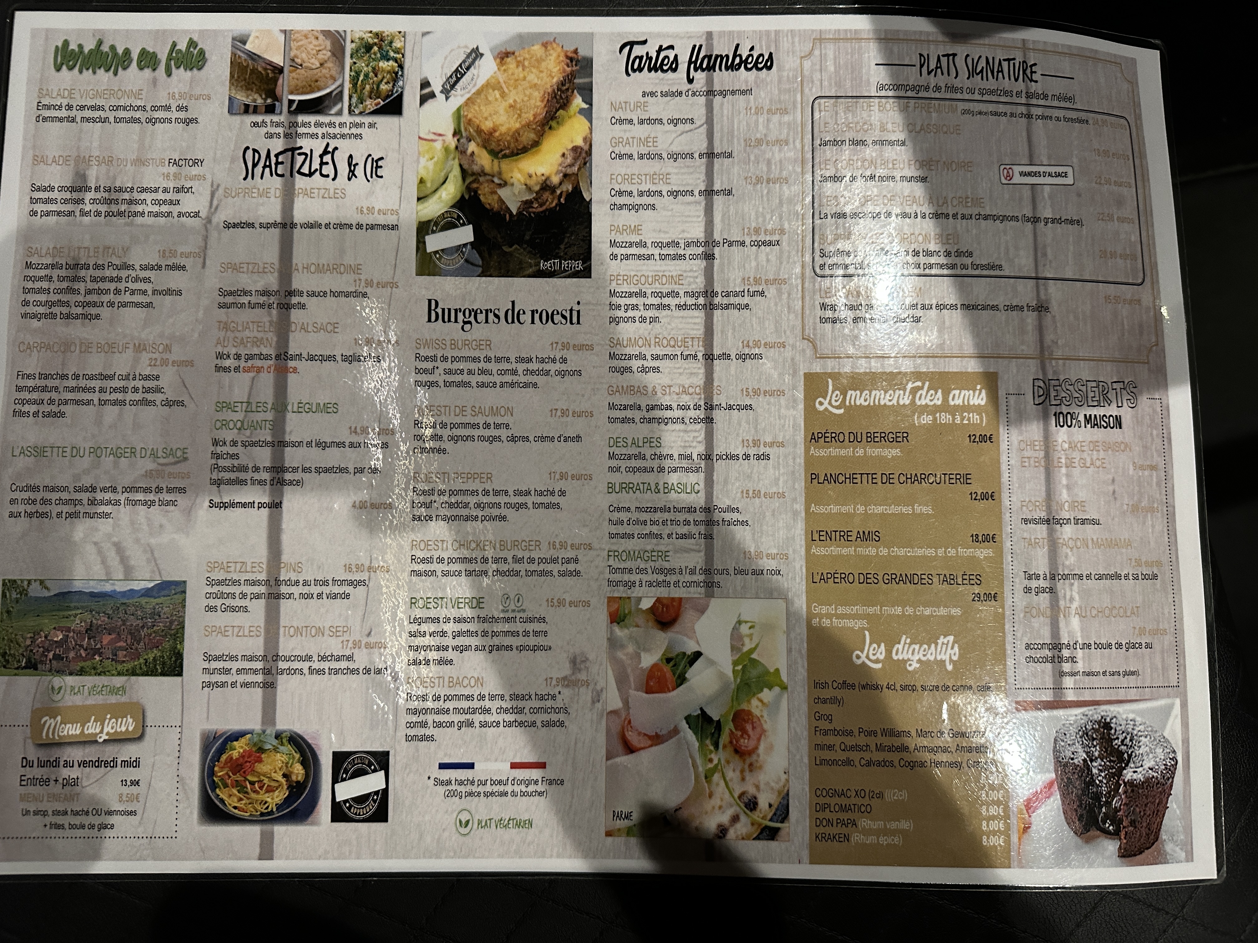 Carte originale essentiellement faite de plats alsaciens. Les plats sont bons, le service agréable. Le tout en terrasse l'été... top 👌