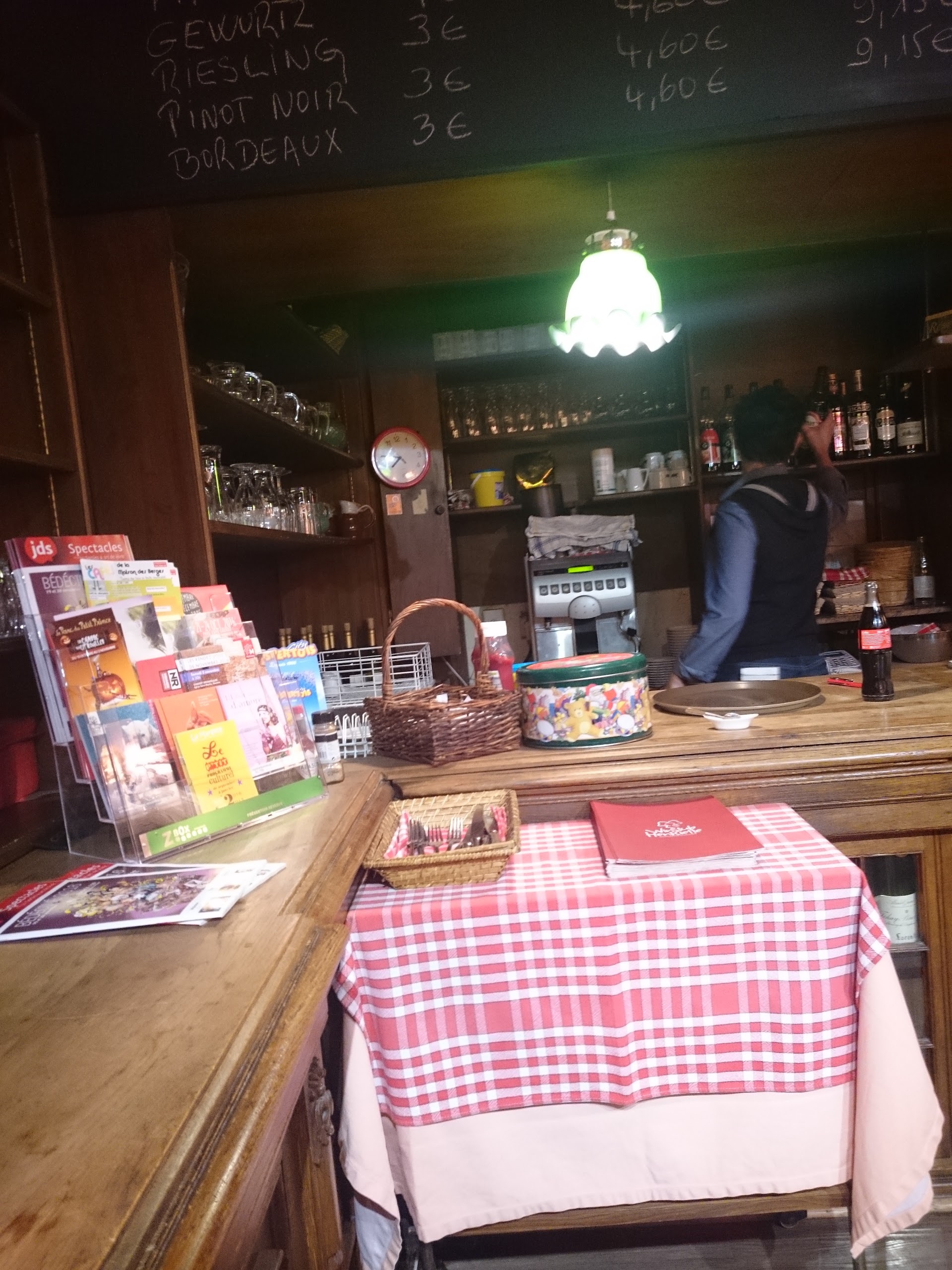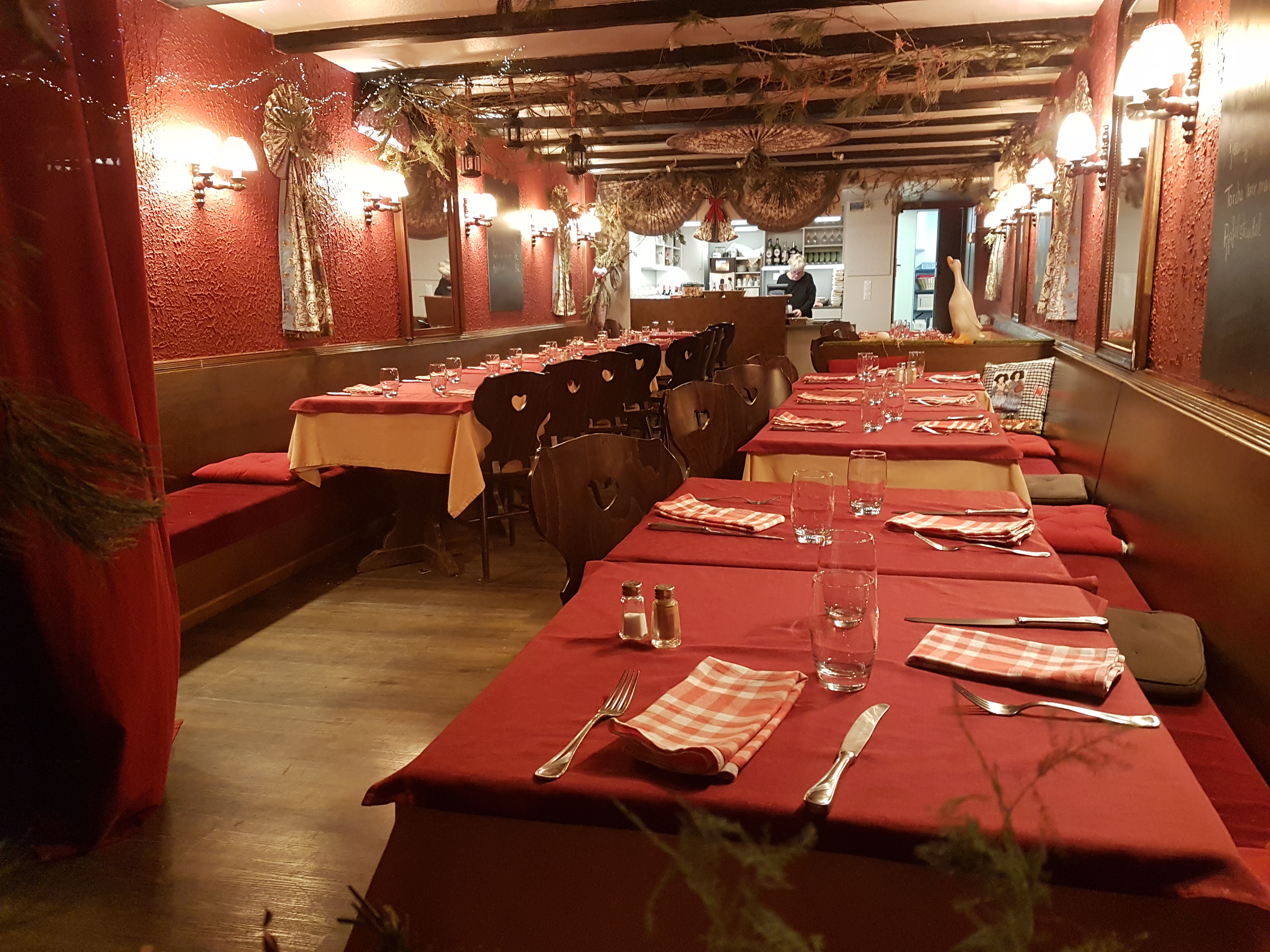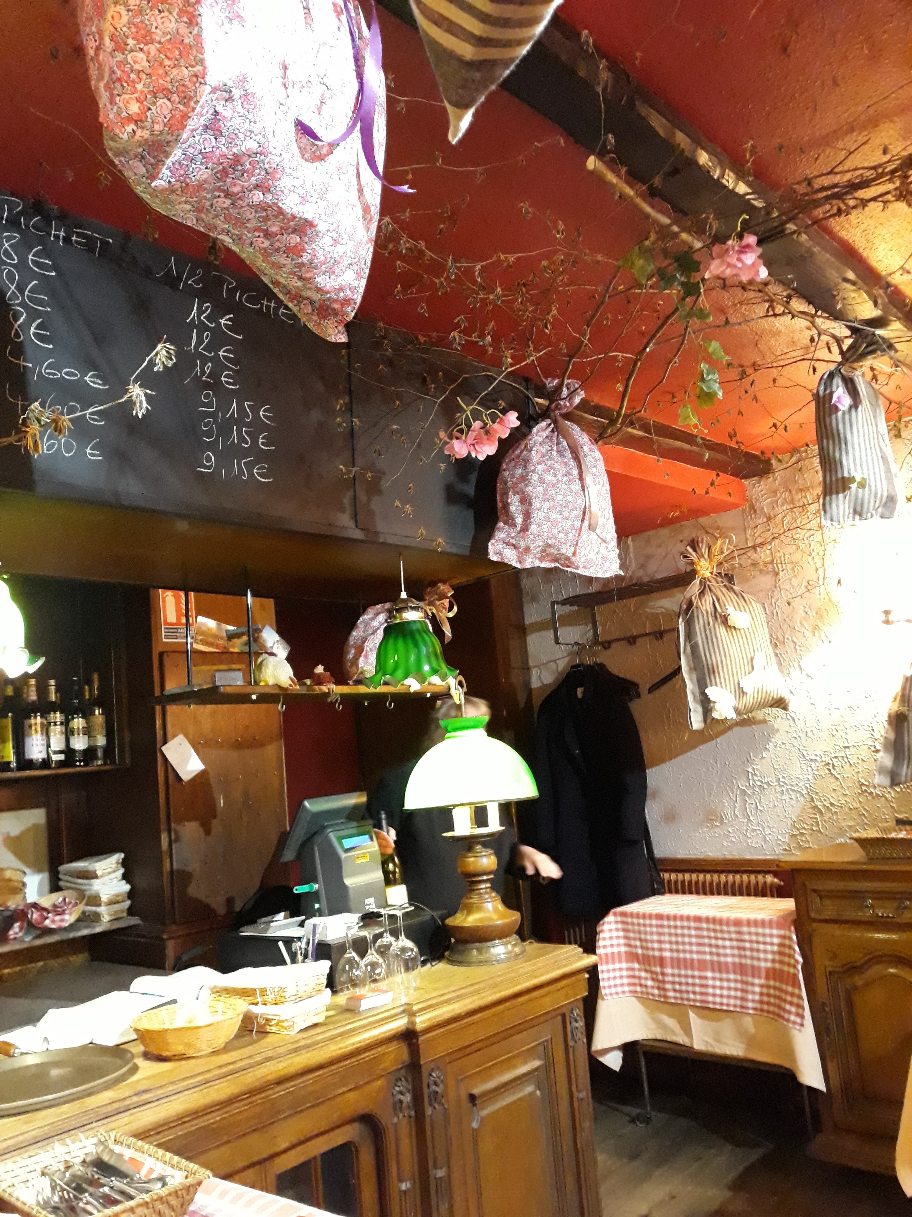 Petite salle cosi typique alsacienne, décorée avec les étoffes de Mulhouse Bon vin blanc d'Alsace of course et les mets à tomber Tout fait maison! Pourvu que ce genre de lieux perdurent Allez y encore et encore